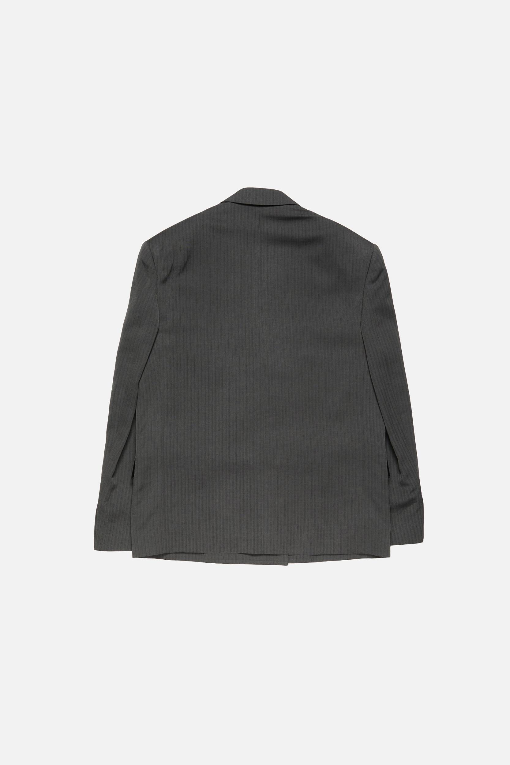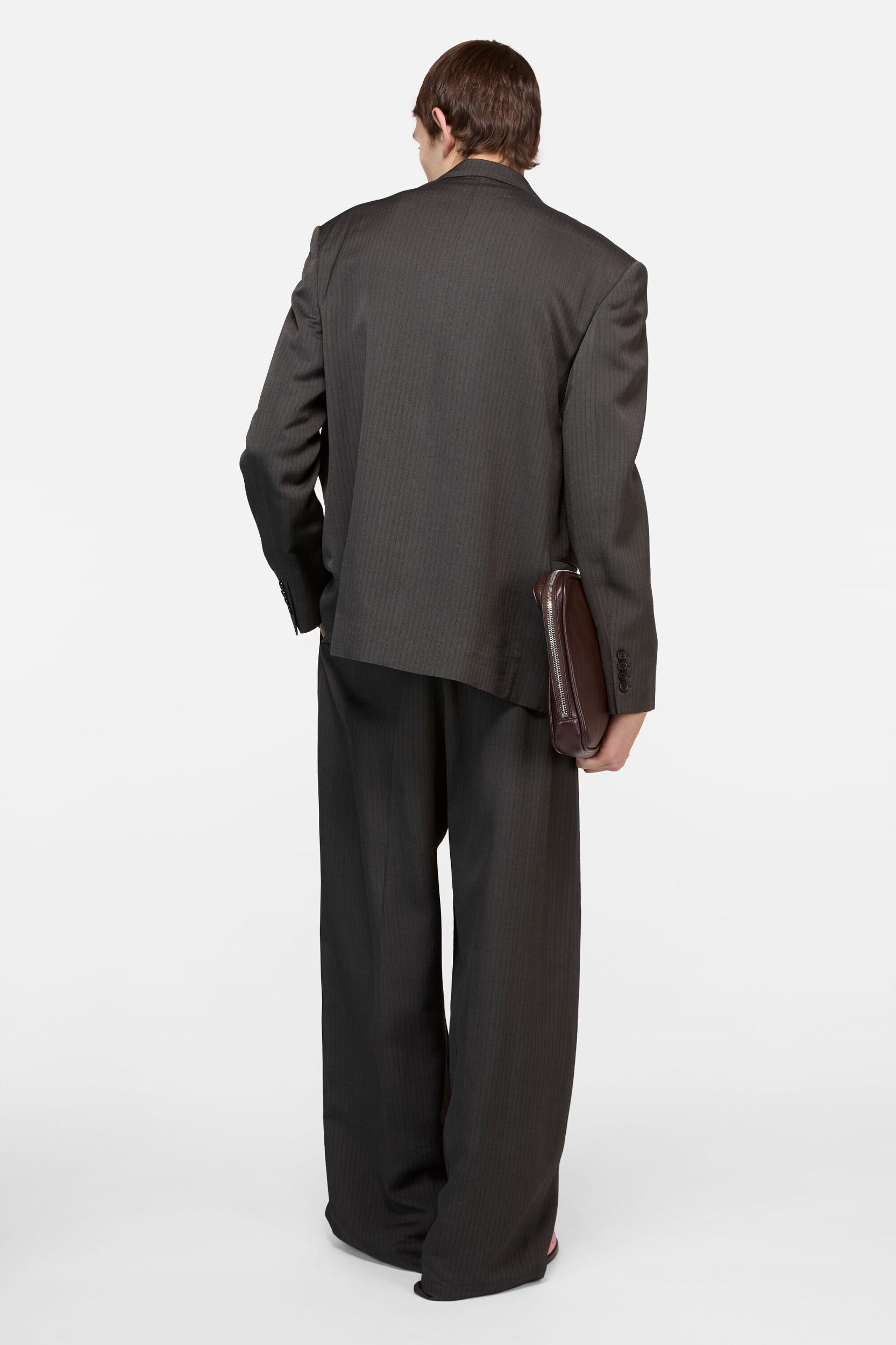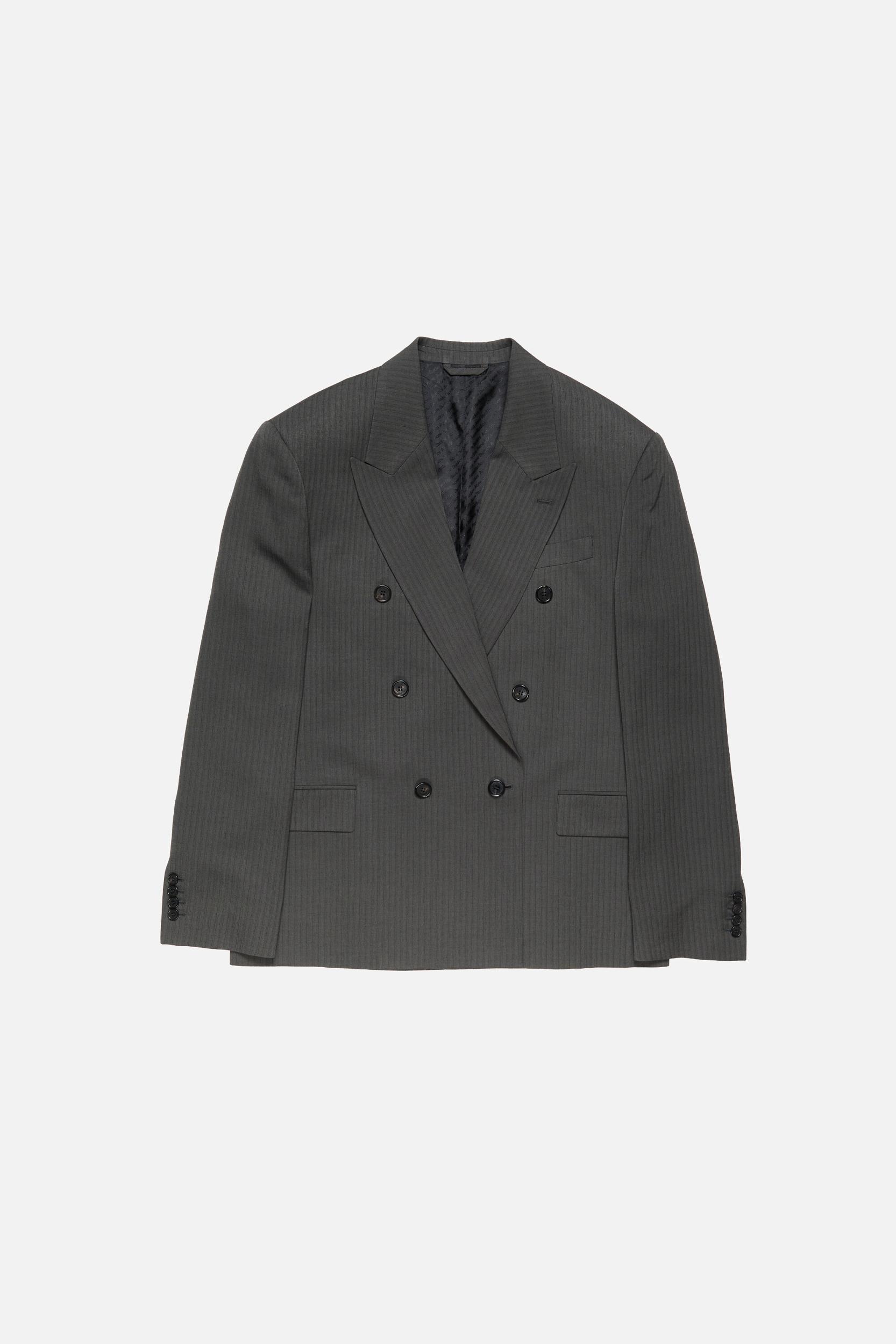 Double-breasted suit jacket crafted from heavy, fluid tailoring fabric with a woven herringbone pattern and generous drape. Constructed with peaked lapels and a six-button center front detail. Complete with chest welt pocket and front flap pockets. Cut to a relaxed fit and hip length. FN-MN-SUIT000434