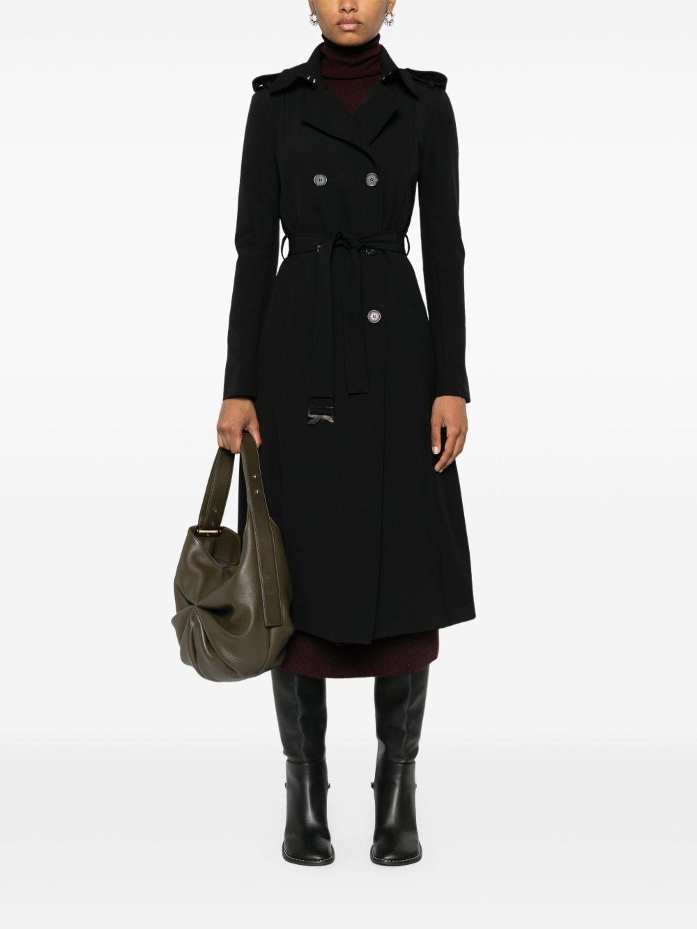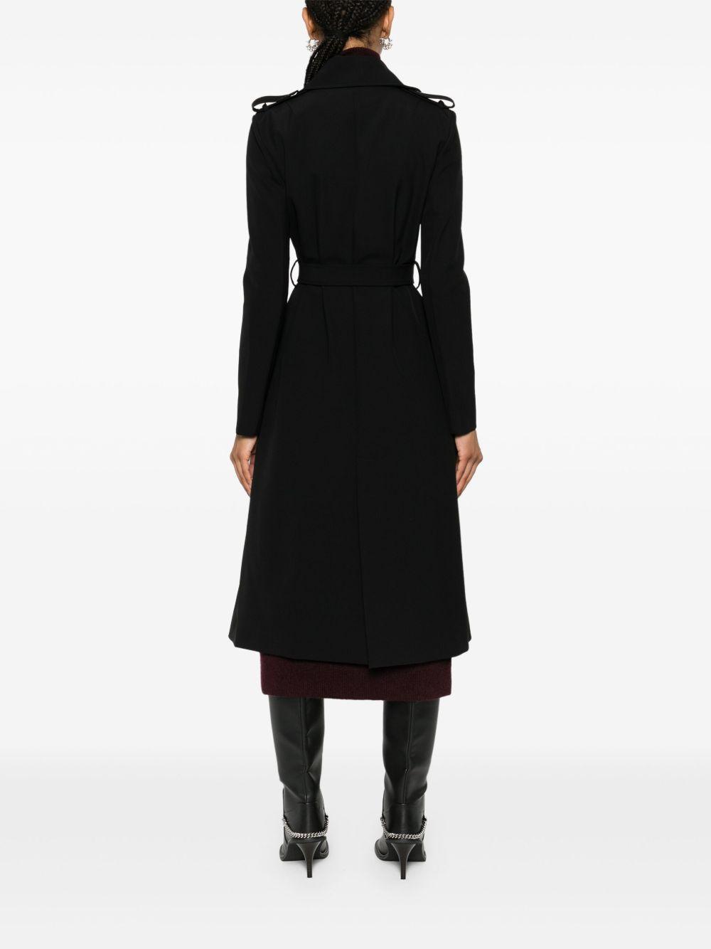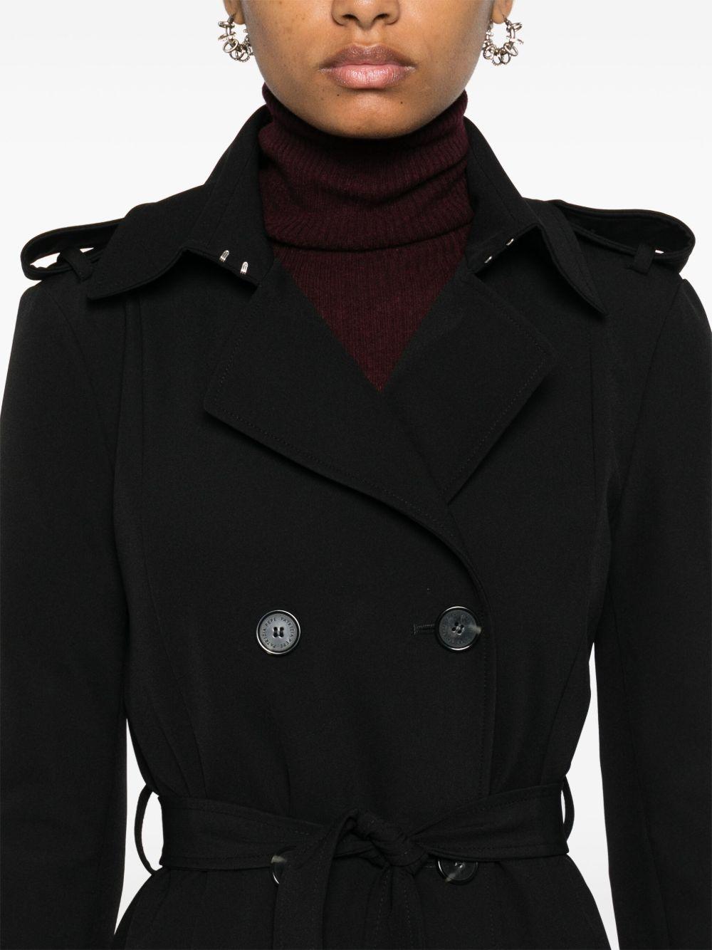 Patrizia Pepe double-breasted trench coat | Black | black | notched lapels | epaulettes | long sleeves | two side inset pockets | belt loops | detachable and adjustable waist belt | A-line | straight hem | central rear vent | unlined | double-breasted button fastening | slide-buckle fastening | Polyester/Polyamide/Elastane/Polyester/Elastane | Double Breasted & Peacoats | Coats | Clothing | Women