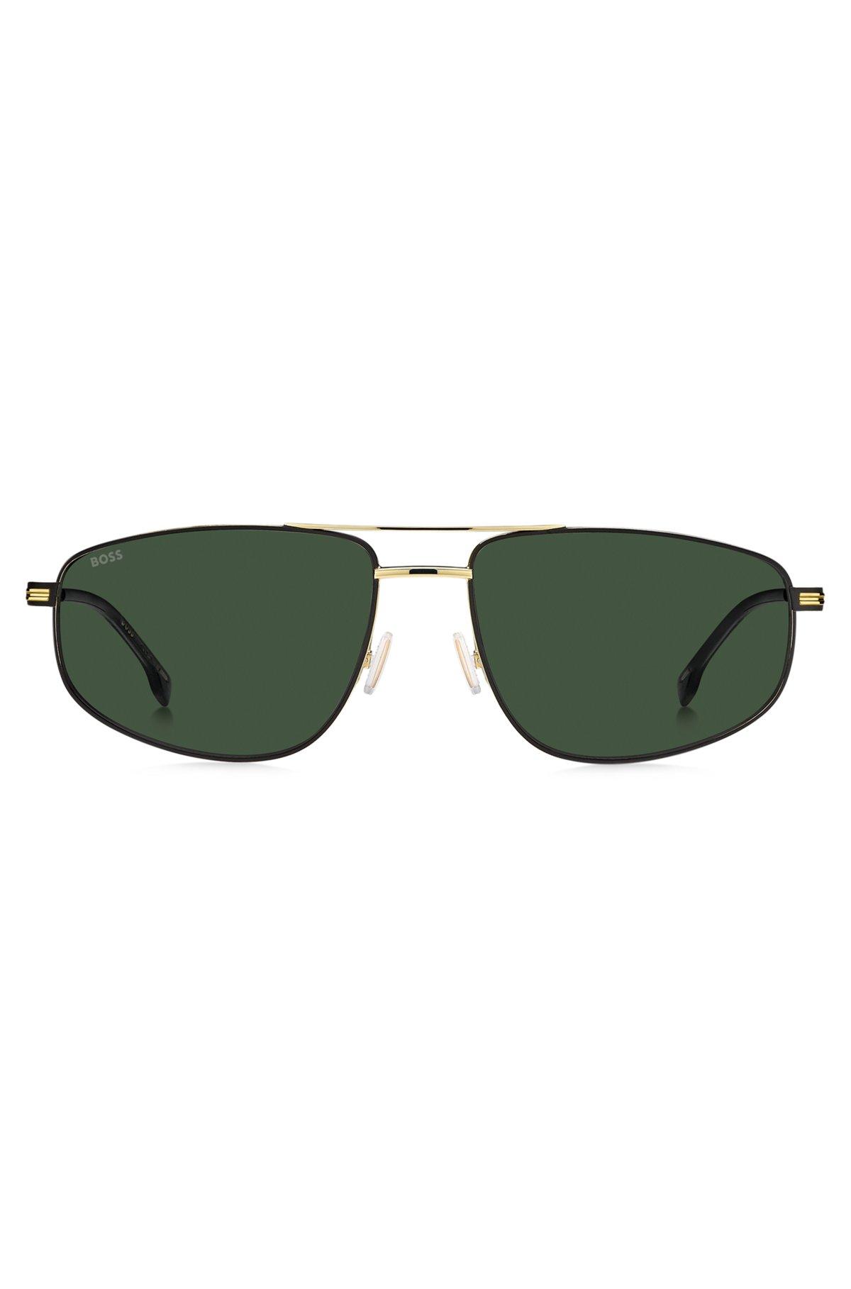 Featuring subtle engraved logos, these BOSS Menswear sunglasses combine matte black with polished gold-tone trims. Contemporary double bridge. Ultra-lightweight and comfortable construction.