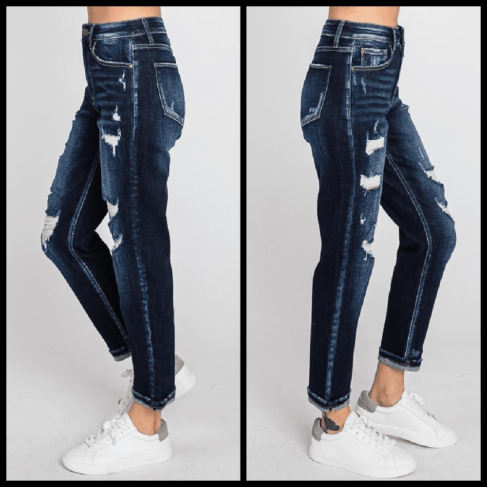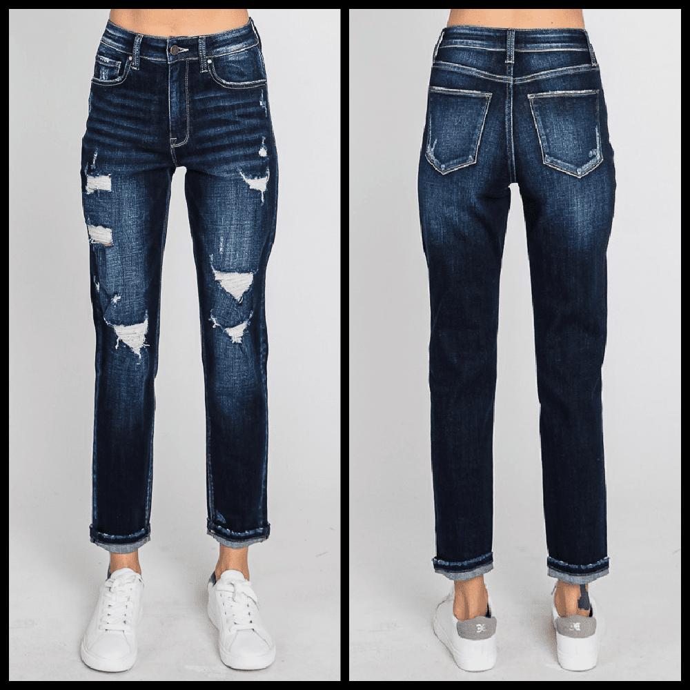 Dark wash, high rise, distressed, 5 pocket styling. Ultra stretch. 10.75" Rise 27" Inseam 1" Single cuff hem