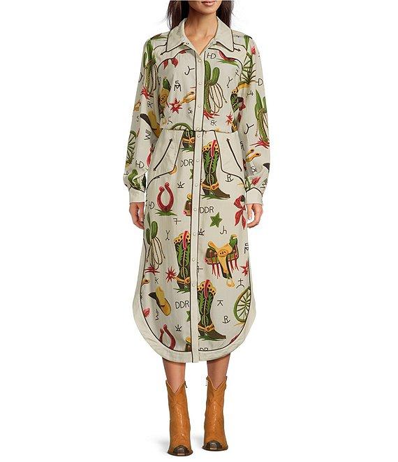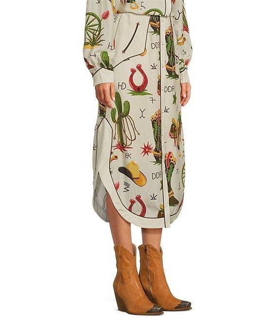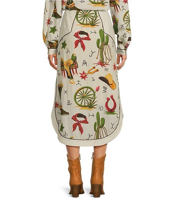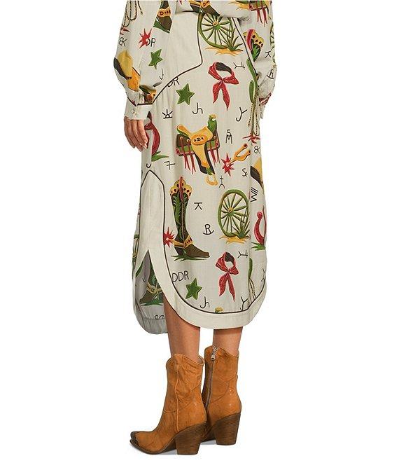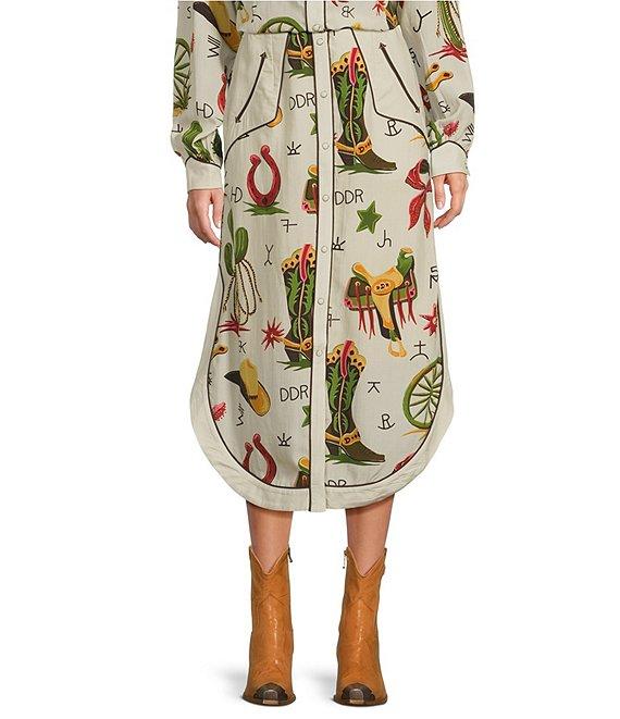 From Double D Ranch, this skirt features: A-line silhouette Western printed Midi length Snap front, horned buttons closure Approx. 24.75" length Tencel Dry clean only Imported.