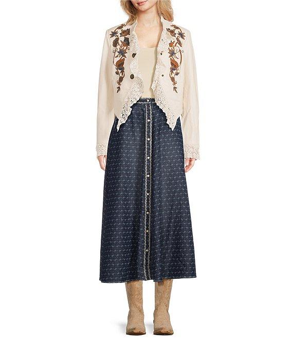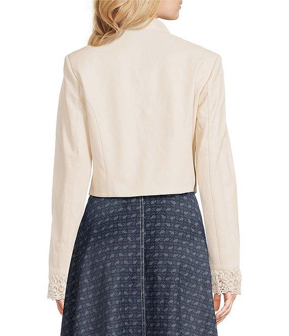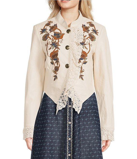 From Double D Ranch, this jacket features: Leather fabrication Stand collar Long sleeves Lace details Floral embroidery Lined Button down closure Approx. 17.5" length from center back Leather; trim: cotton Leather cleaning only Imported.