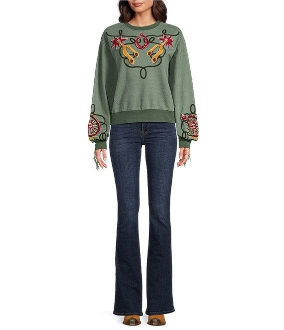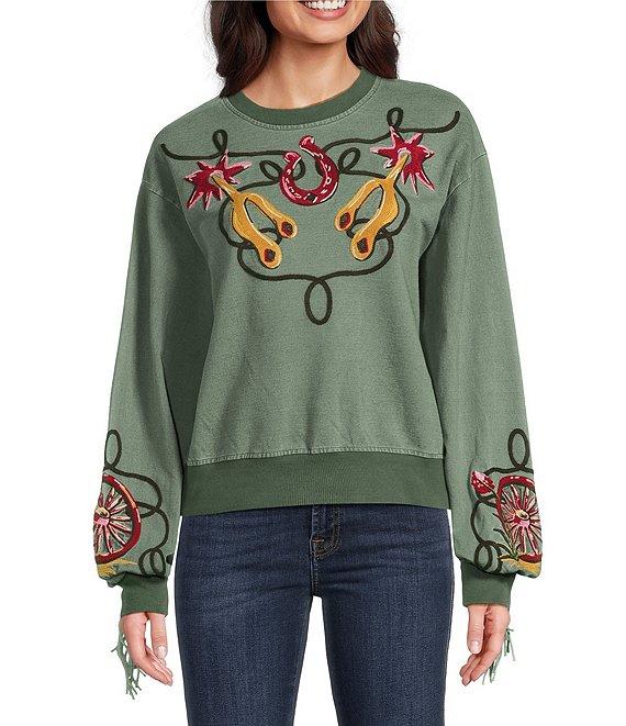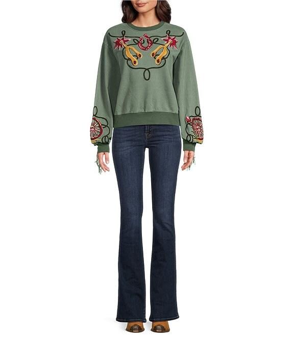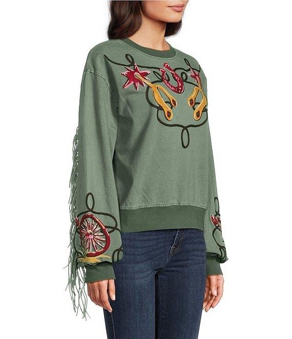 Double D Ranch Knit Crew Neck Long Sleeve Embroidery Fringe Sweatshirt