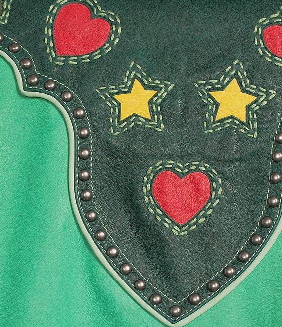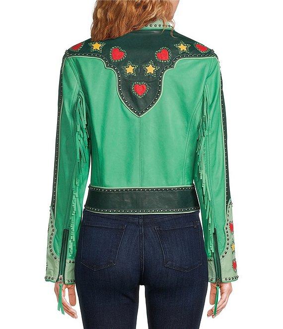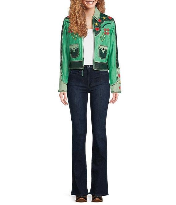 From Double D Ranch, this jacket features: Print design Contrast piping detail Classic fit Open front; no closure 3/4 exaggerated sleeves fitted cuff Front button down closure Approx. 26" length Sheep skin Dry clean only Imported.