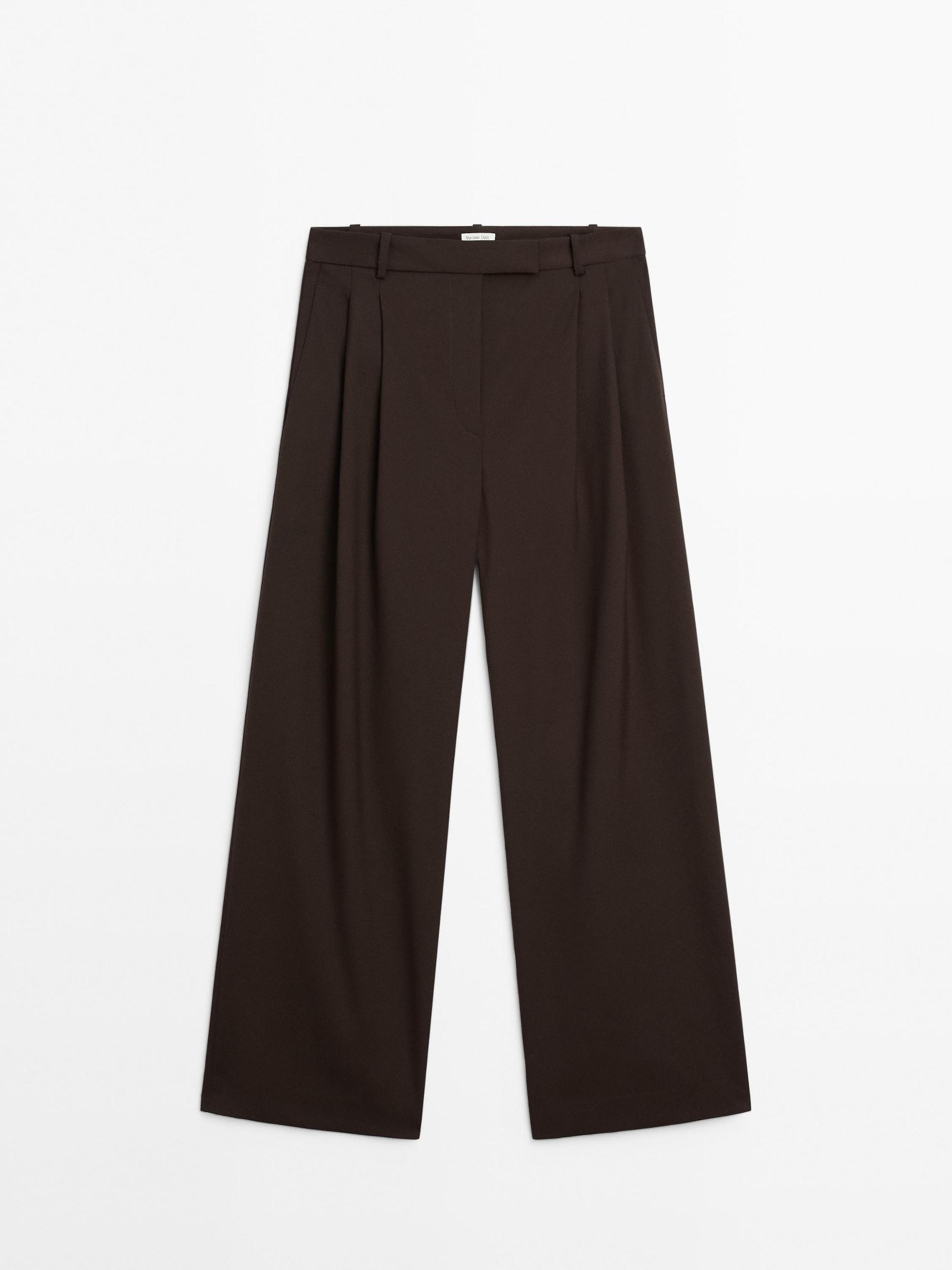 Waistband with belt loops , Zip fastening concealed by a placket, with hook-and-eye clasp and button, Two side pockets, Darted detail on the front