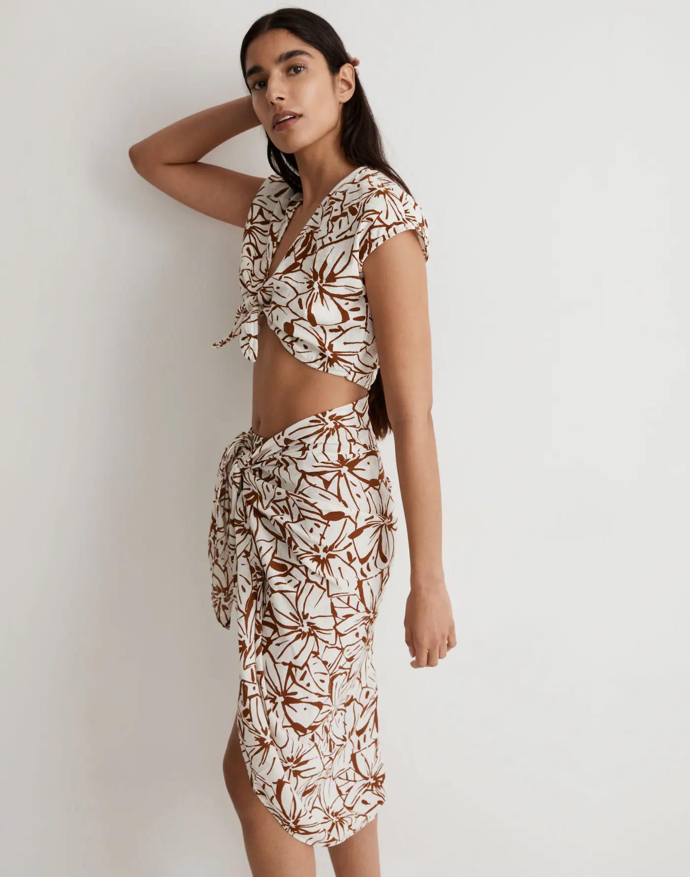 Made of supersoft and lightweight double-layered cotton gauze, this tie-front crop top serves supercute double duty—try it as a bikini cover-up or out to dinner with the matching pull-on skirt.