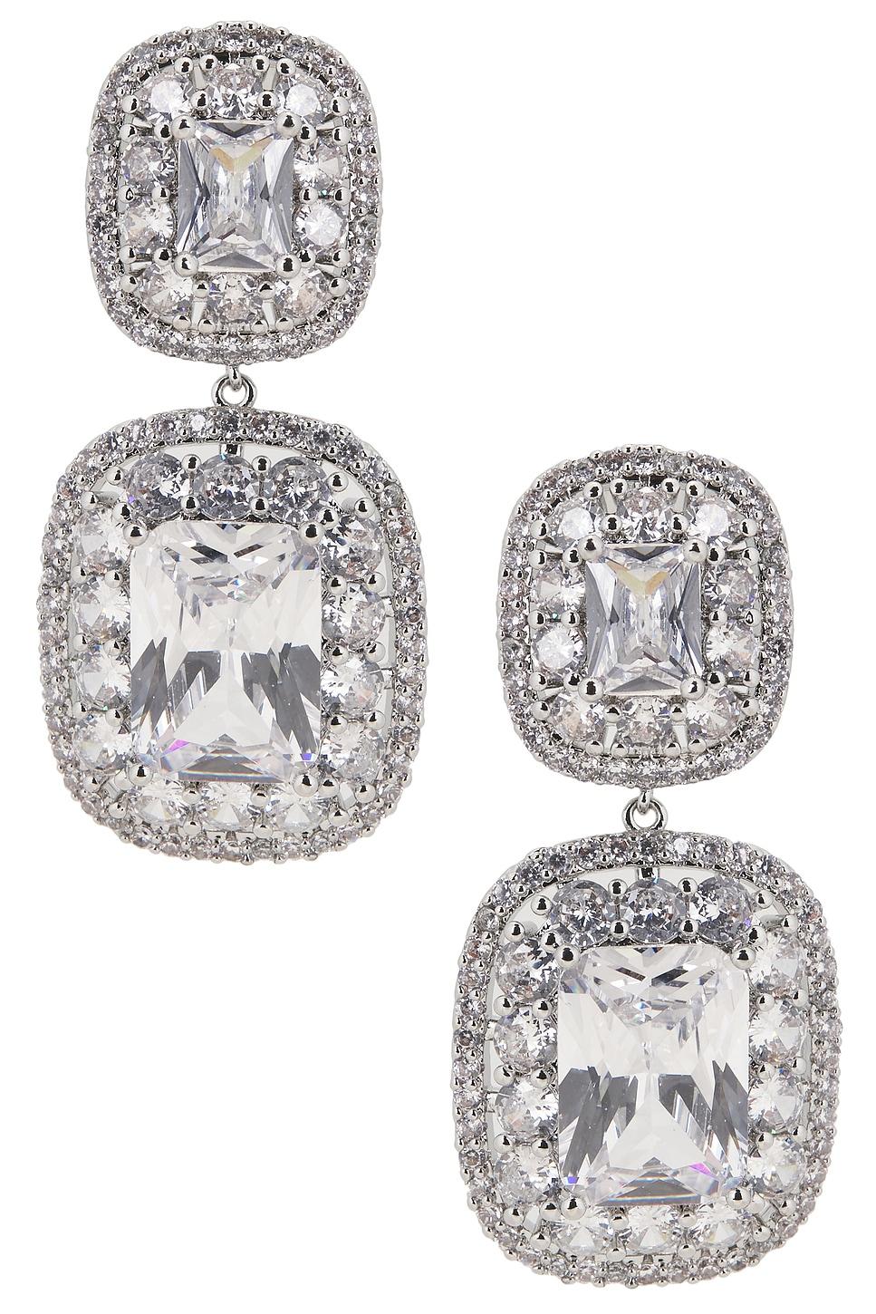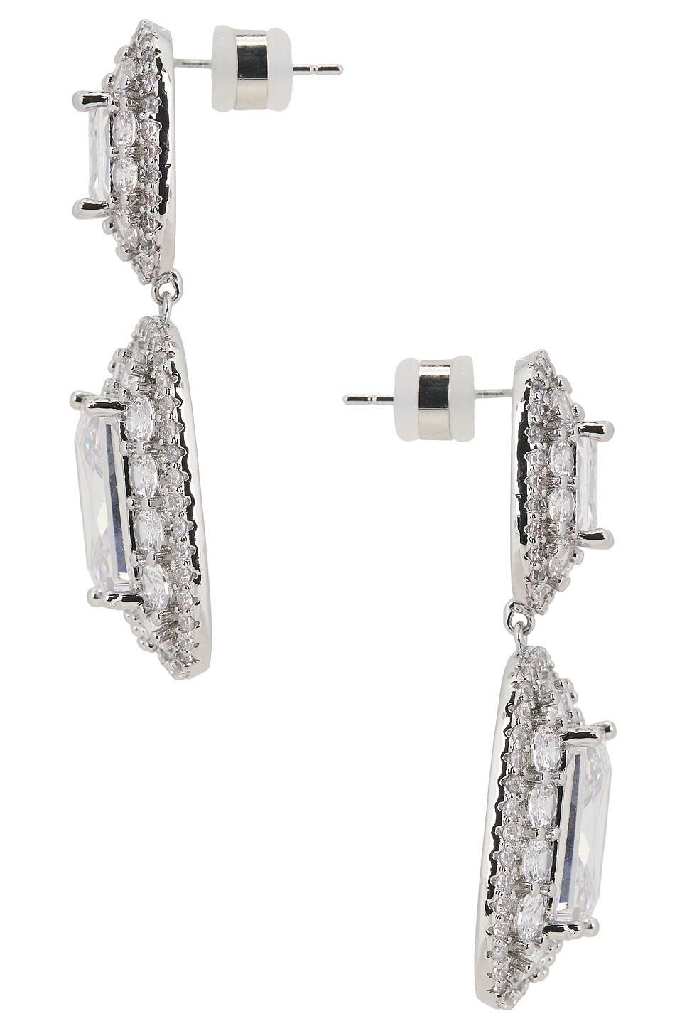 Silver-tone metal earrings with clear crystals. Post-back closure. Sold as a single earring. Measures approx 2" dangling. Made in Hong Kong. Revolve Style No. SHAS-WL1218. Manufacturer Style No. SH-E2620.