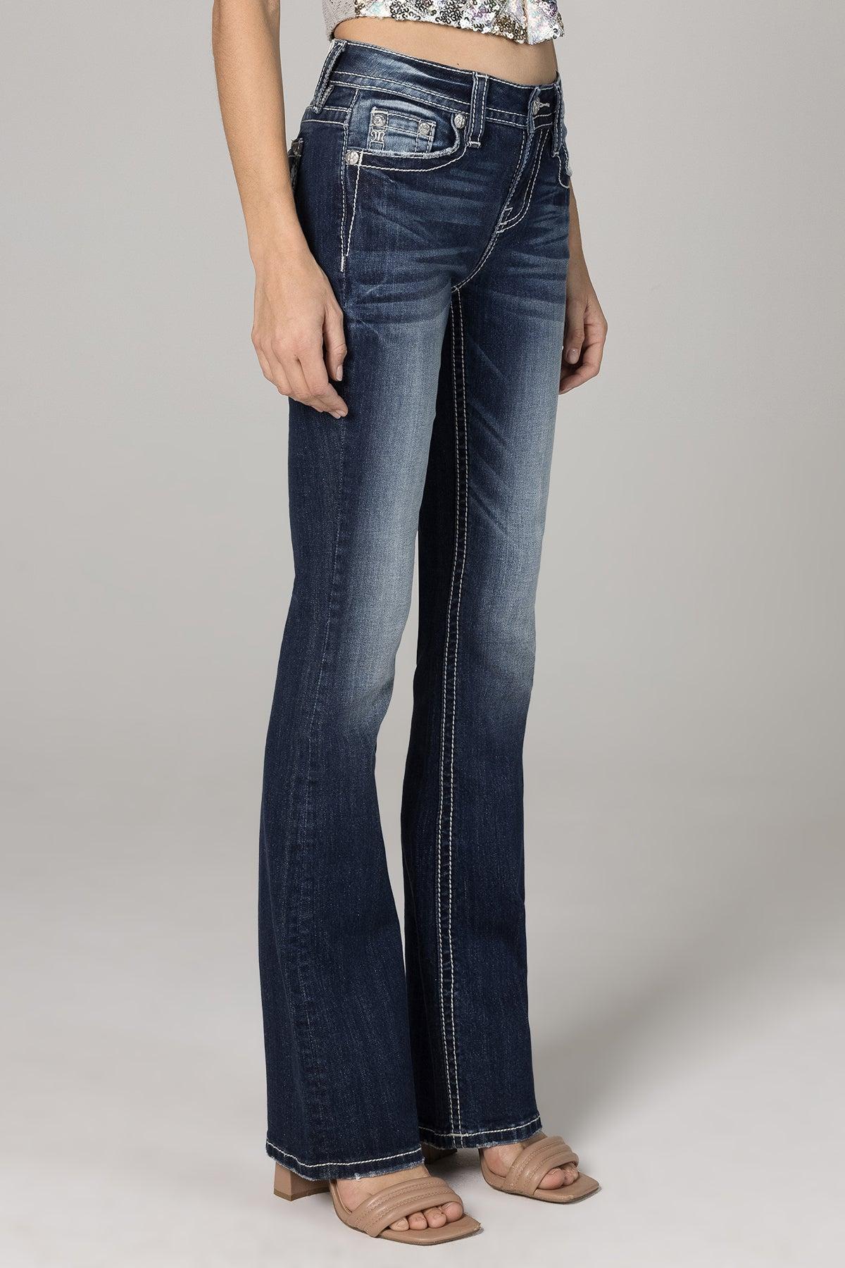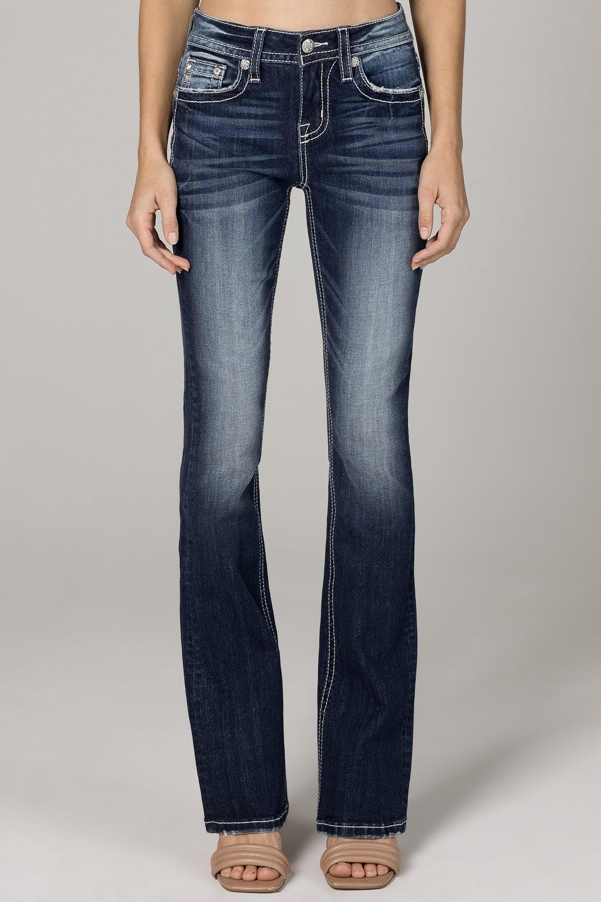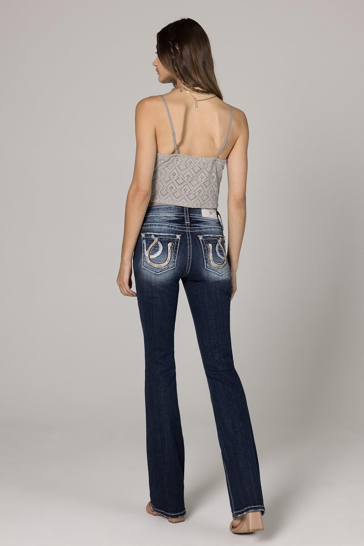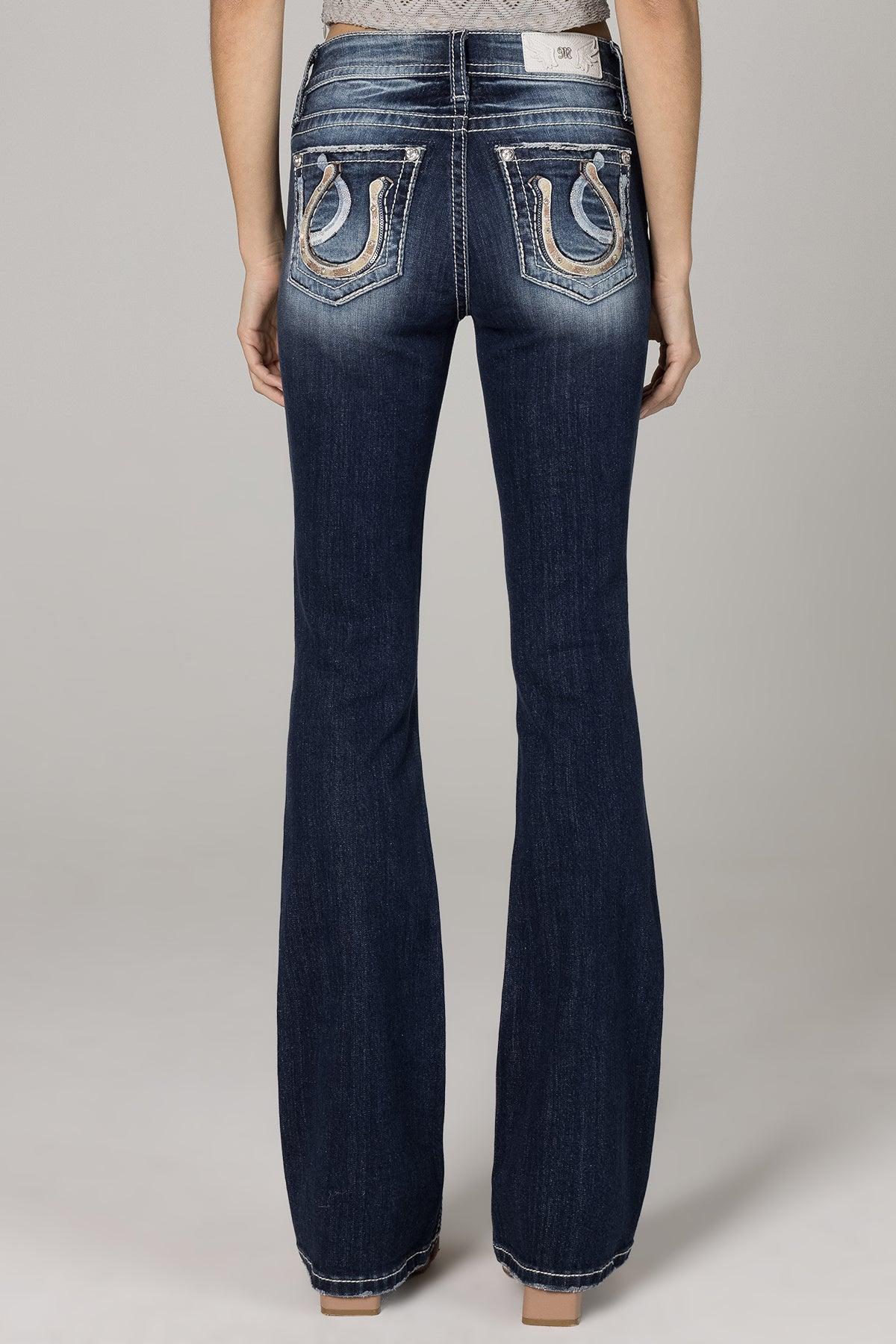 Mid rise dark wash bootcut detailed with contrast stitching, hand sanding, embroidered horseshoe design and a 5 pocket with rhinestone rivets. 98% Cotton, 2% Elastane Machine Wash Separately In Cold Water With Like Colors Front Rise: 9"; Back Rise: 14” Inseam: 34" Style No. M3975B-D1046