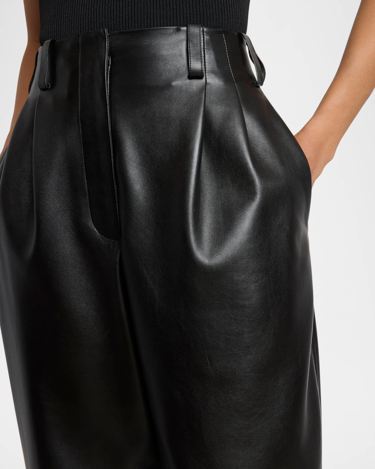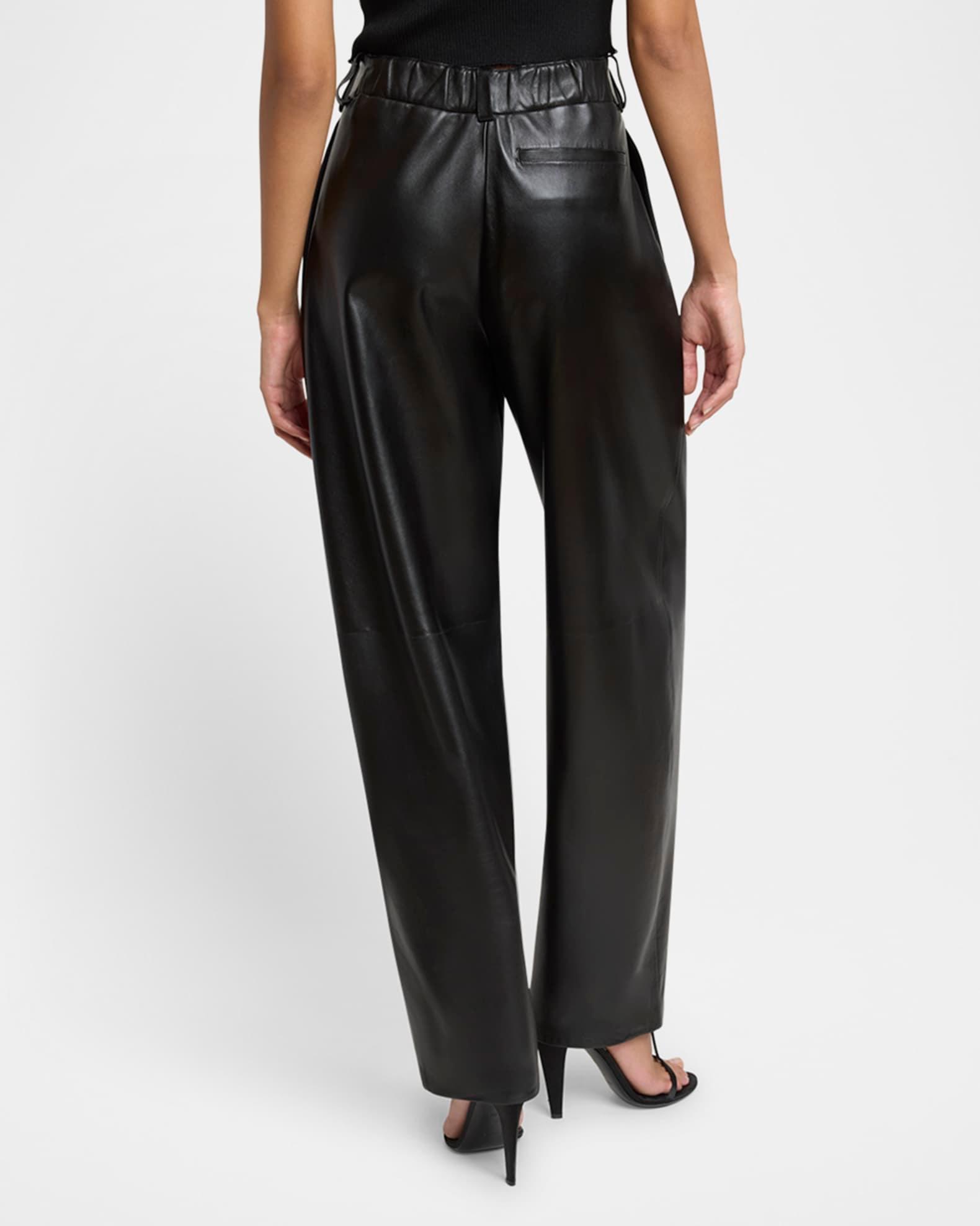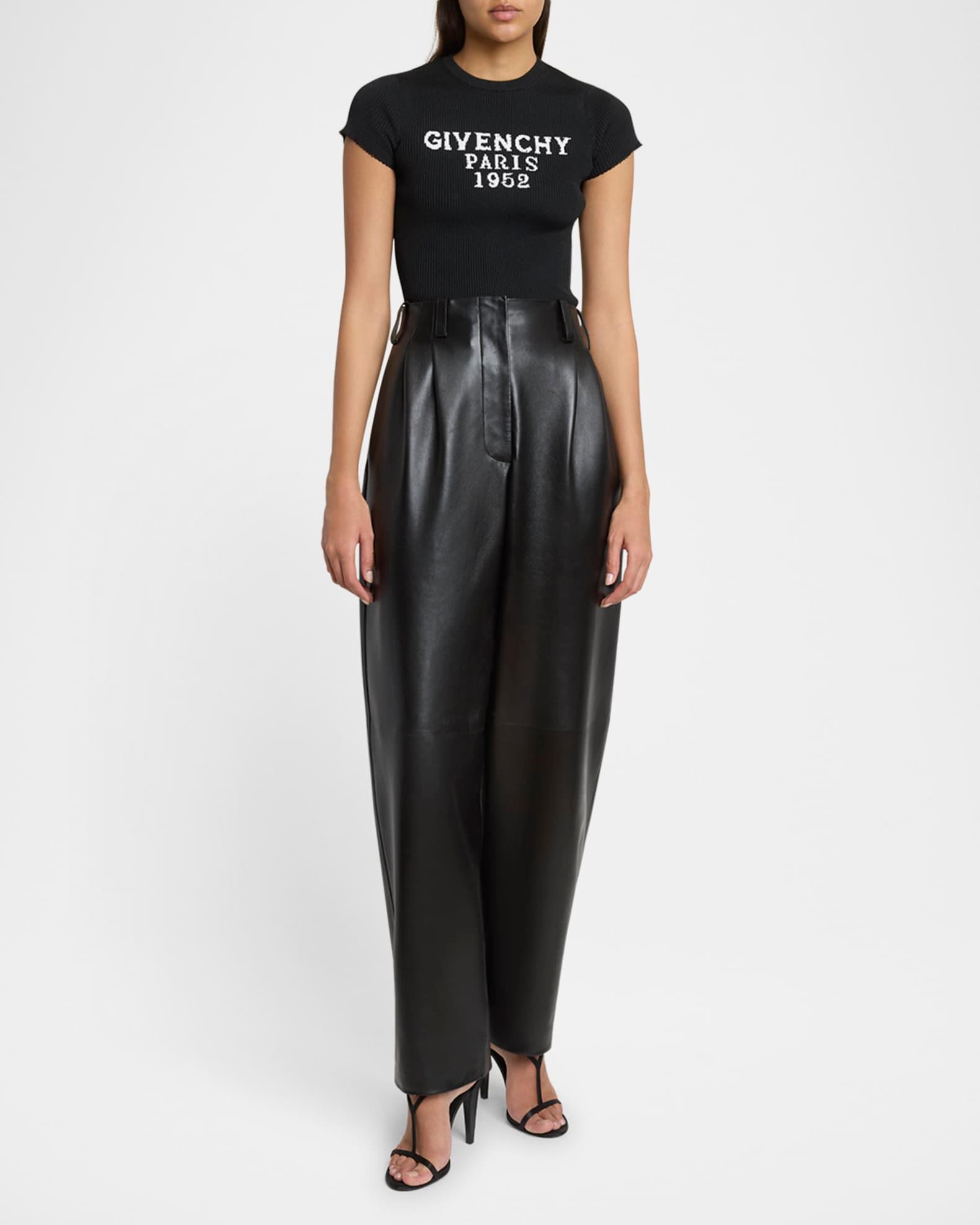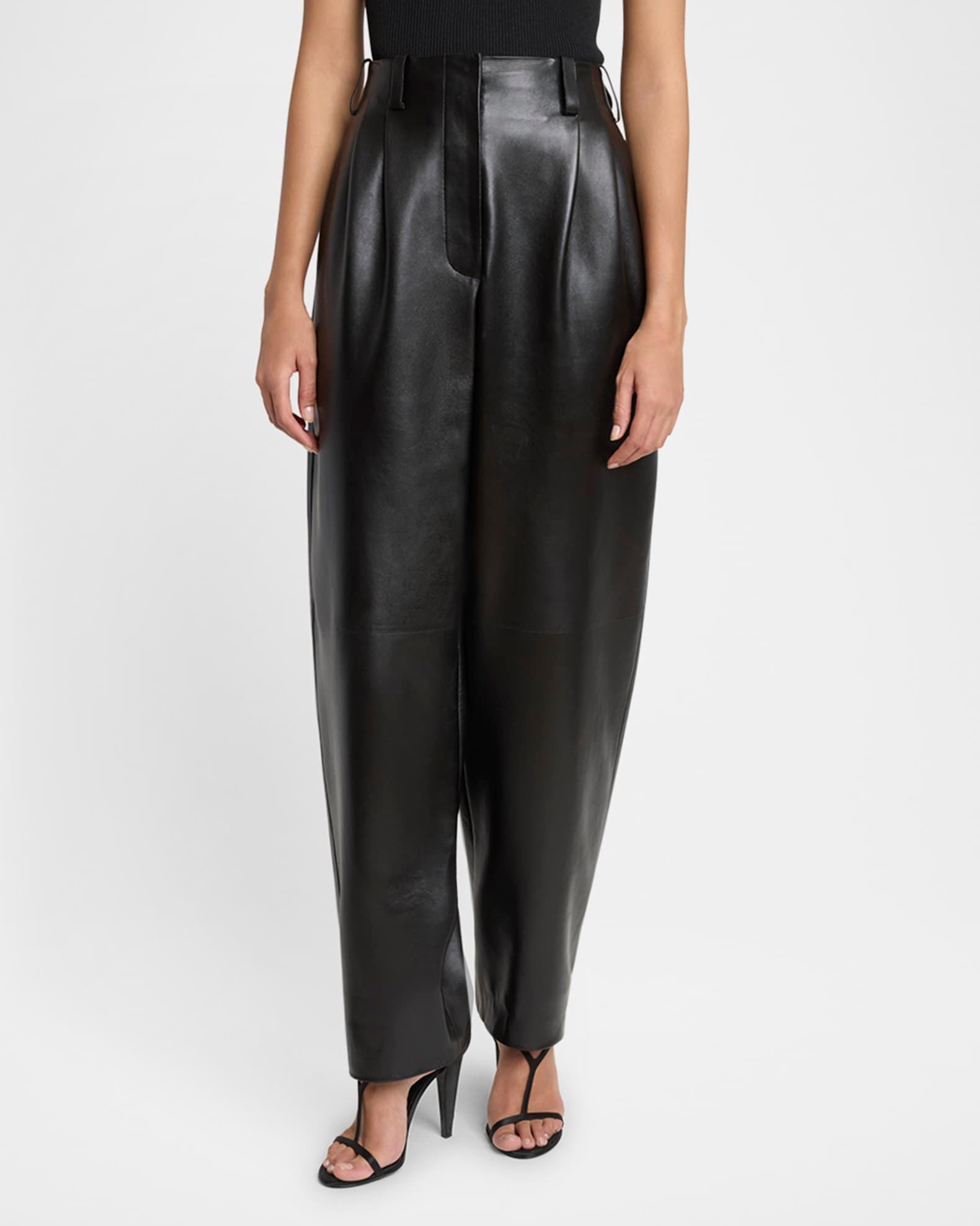 Finished with double pleating, these barrel-leg trousers by Givenchy are crafted from smooth leather High-rise elasticized waistband Single back welt pocket Full length Relaxed fit Hidden hook/zip fly; belt loops Leather/polyester Made in Italy