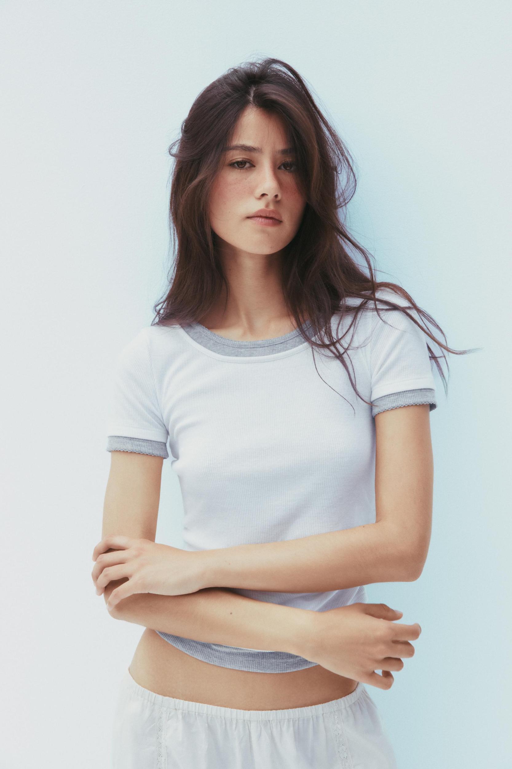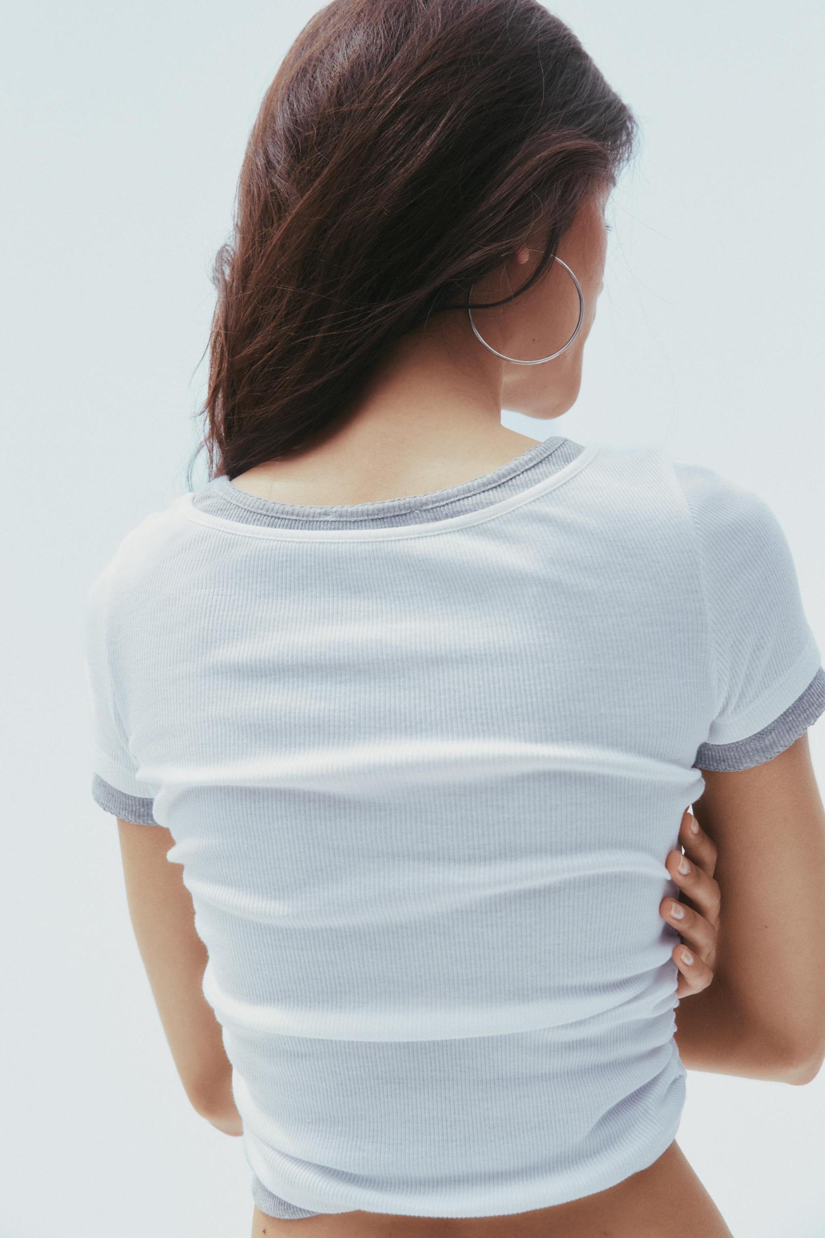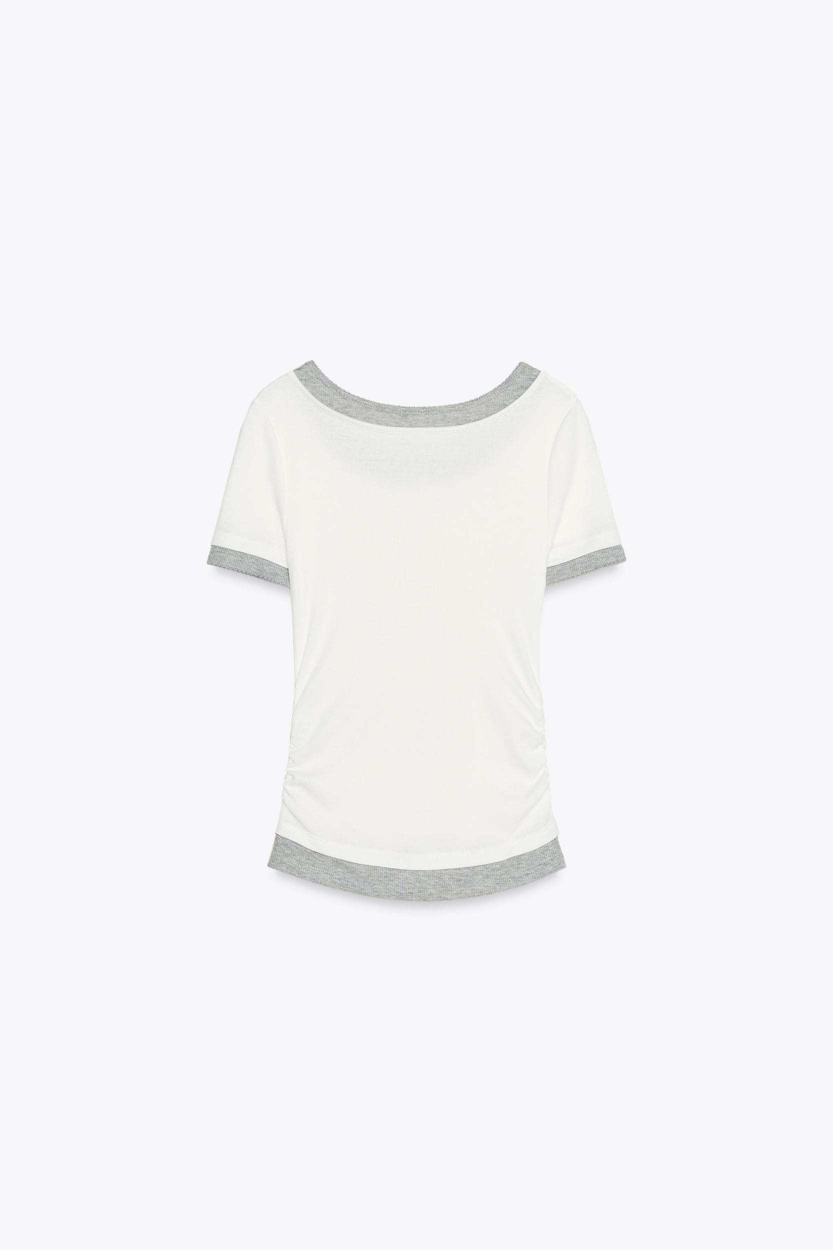 SLIM FIT - ROUND NECK - REGULAR LENGTH - SHORT SLEEVE T-shirt made in cotton yarn. Round neck and short sleeves with lace trim. Ruched detail. Finished with contrasting double-effect combined fabric.