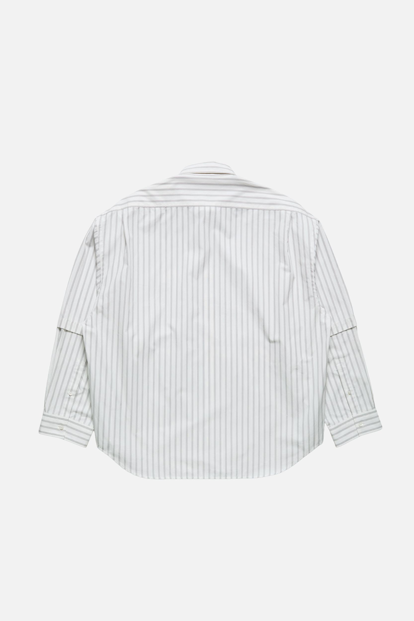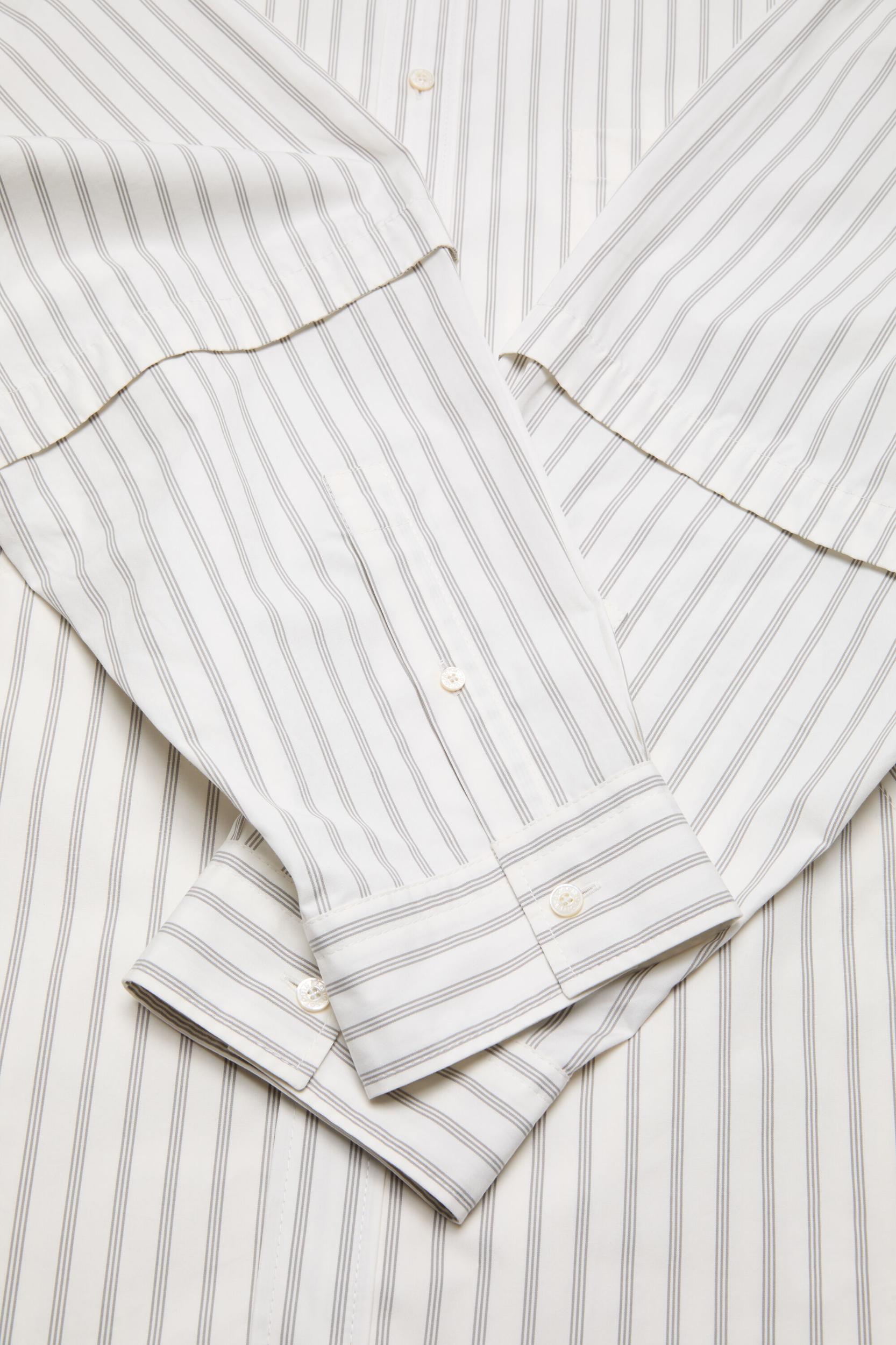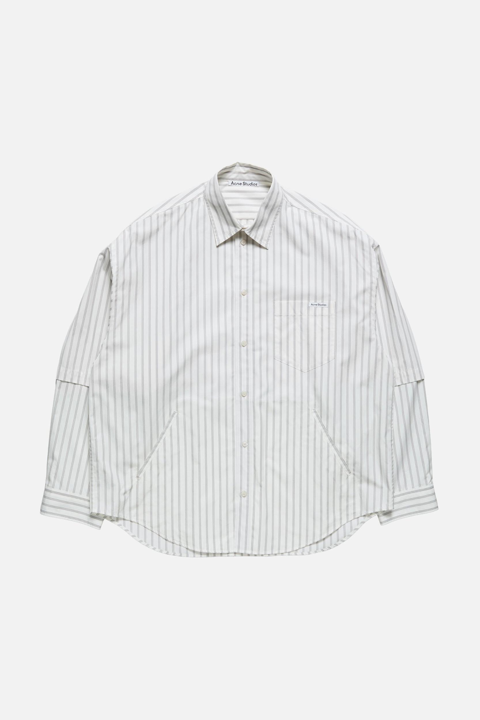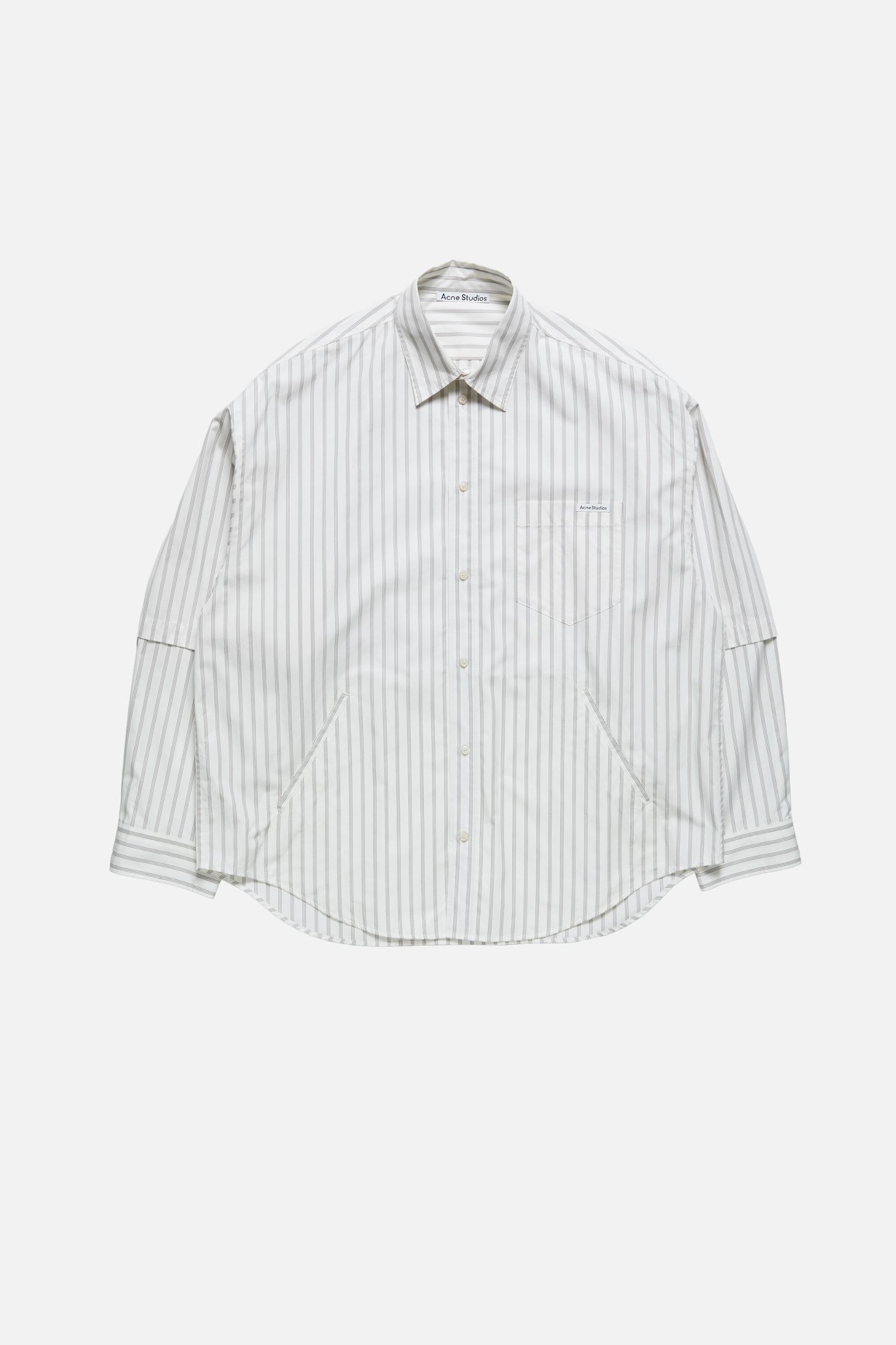 Long-sleeve button-up shirt with layered, double-sleeve construction, crafted from dense cotton poplin with seasonal stripe pattern. Features a chest pocket with satin logo label and side welt pockets. Cut to a relaxed fit and hip length. FN-MN-SHIR000952