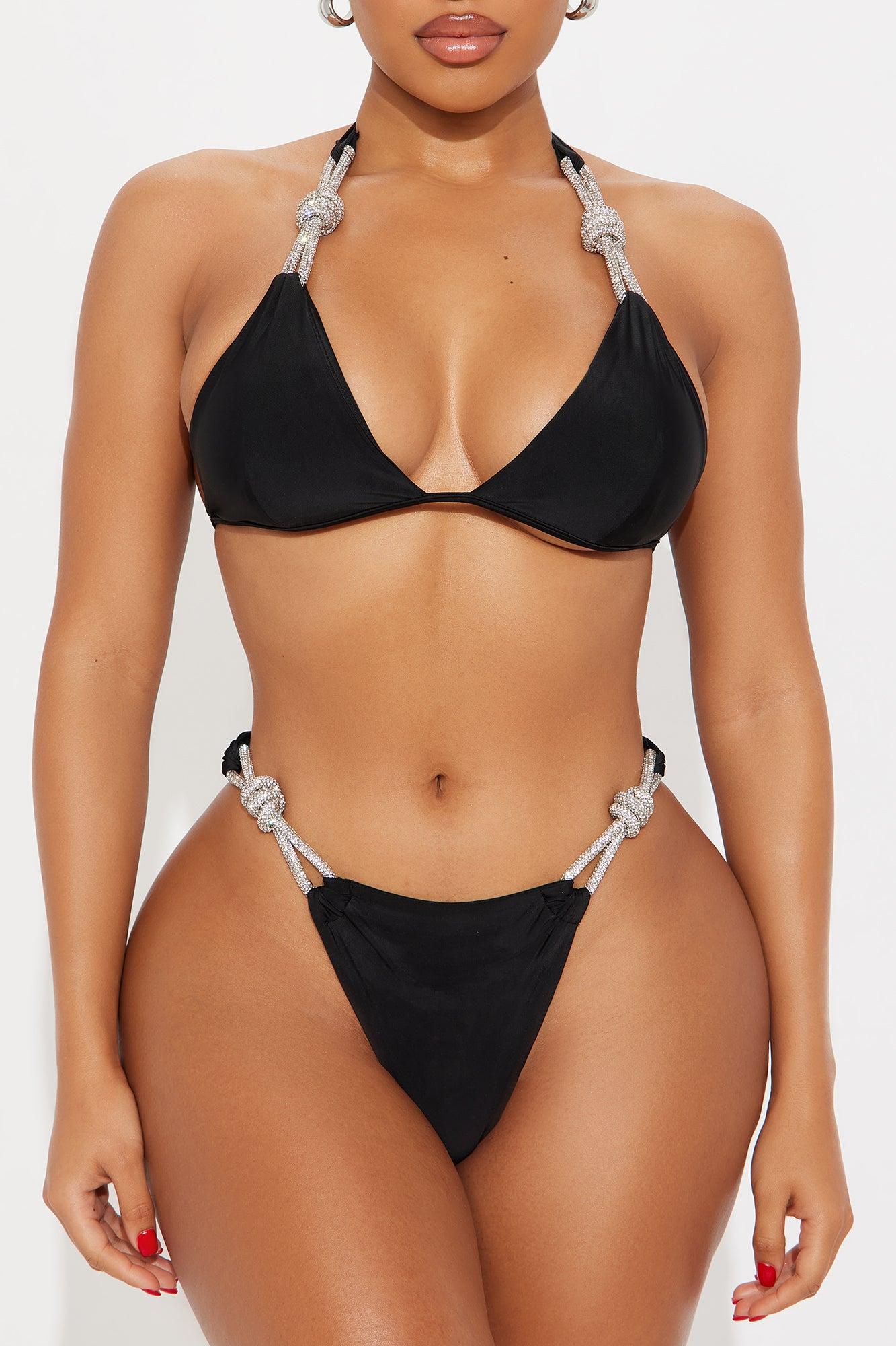 Available In Black. 2 Piece Bikini Fixed Triangle Bikini Top Removable Cups Rhinestone Knot Bikini Bottom Cheeky Full Stretch Final Sale Shell: 92% Nylon 18% Spandex Imported