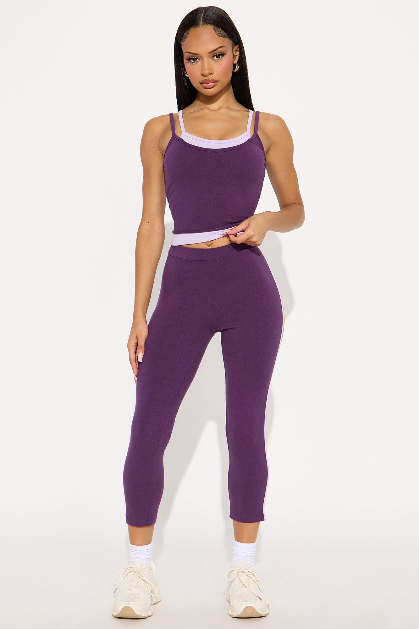 Available In Charcoal And Purple. 2 Piece Ensemble Top And Capri Pant Set Stretch Sleeveless Elastic Waistband Capri Leg 21" Inseam Self: 95% Cotton 5% Spandex Contrast: 95% Cotton 5% Spandex Imported