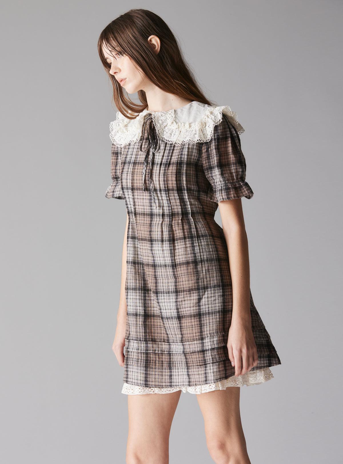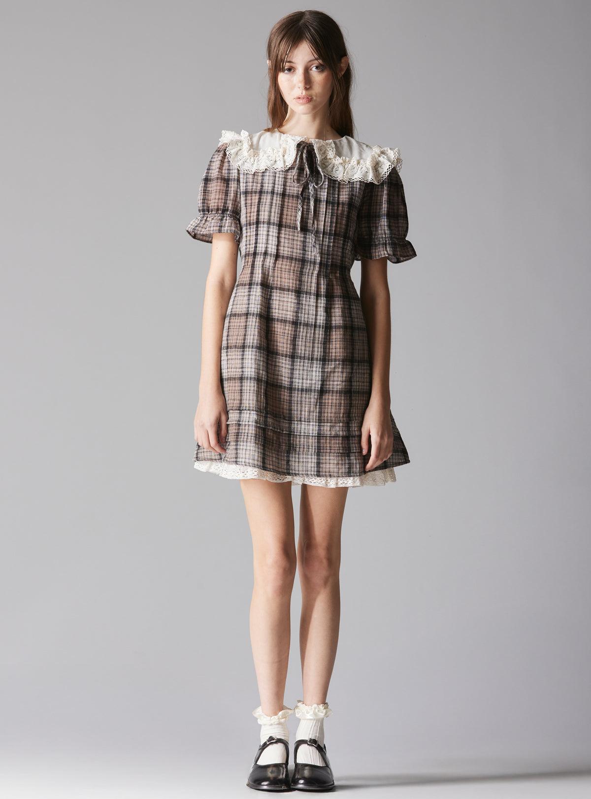 A mini plaid dress featuring an off-white antique inspired lace dolly collar; perfect for adding a touch of dollcore sweetness. The dress includes elastic short sleeves for comfort, along with a tie in the back to create a customizable fit. Multiple seams across the bust line add texture and structure, while the flattering A-line shape gives it a fun, youthful silhouette. The dress also features unique detailing seams, contributing a playful coquette essence. Model is 5'8" and wearing a size S. Shell: 80% Cotton; 20% Linen Lining: 100% Cotton Imported Sku: UWD-1446