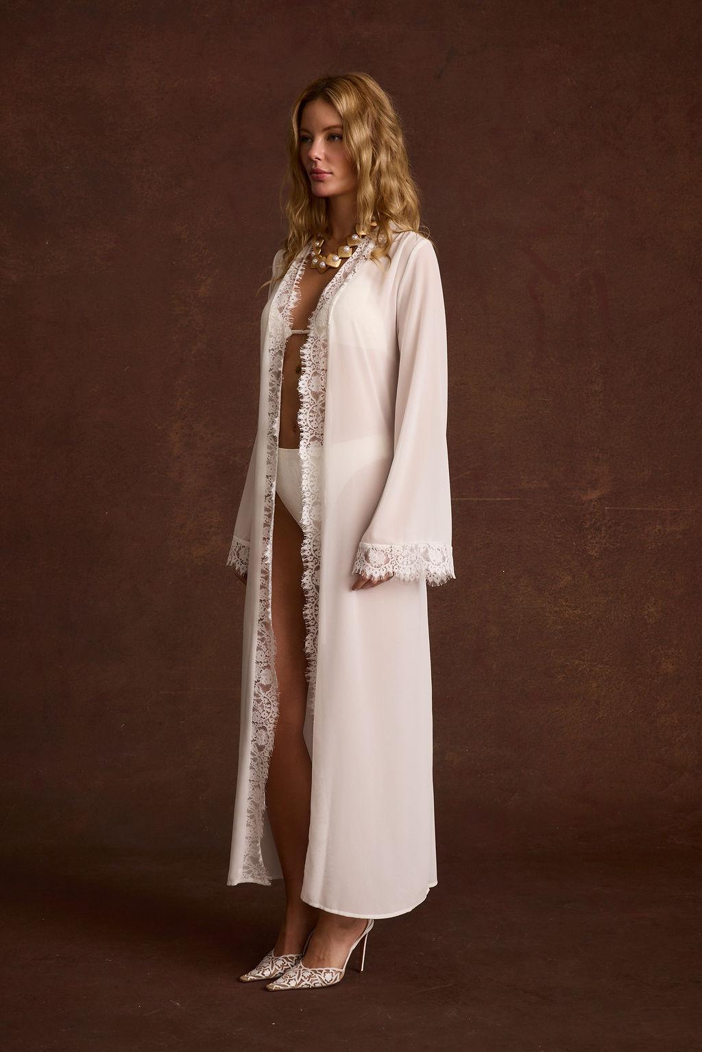 Cue the wedding bells in the Dove White Bridal Robe. Slip it on while you’re getting hair and makeup done, for honeymoon lounging, or just because it's your day and you feel like it. The lace detailing and sheer material will help create perfect bridal moments and memories.
