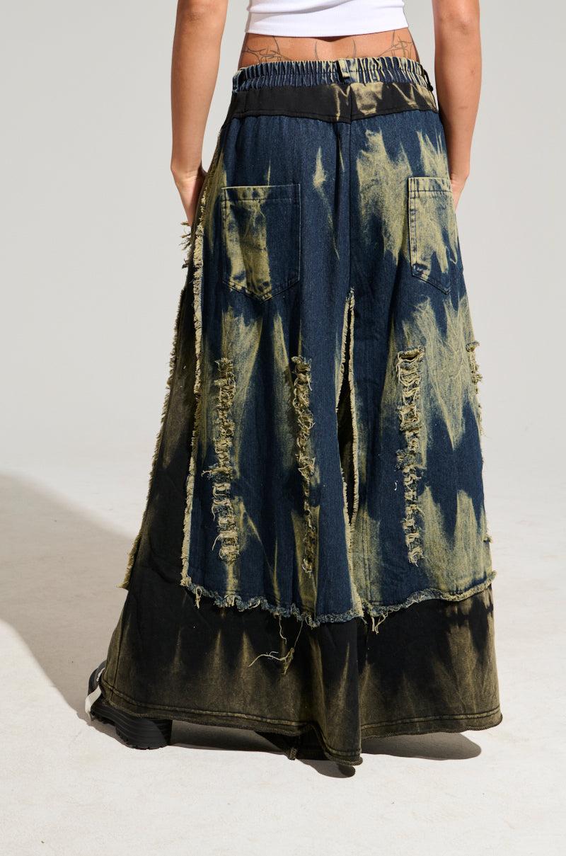 Ready to rumble in The AKIRA Label Down And Dirty Distressed Denim Pant. This edgy bottom is brought to you in a semi-stretchy, knit base and features an acid wash colorway throughout, distressed denim panels on the front and back pant legs, a coordinating shirred elastic denim waistband, functional belt loops, dual back pockets, distressed cut out accents on the lower legs, a wide leg silhouette, and an easy, pull-on fit. Pair with a crop top and platform boots for a daring ensemble. - 97% Polyester 3% Spandex- Some Stretch- Imported (all measurements approximate from size small)- 15” Rise- 24.5” Inseam Product ID: 430693