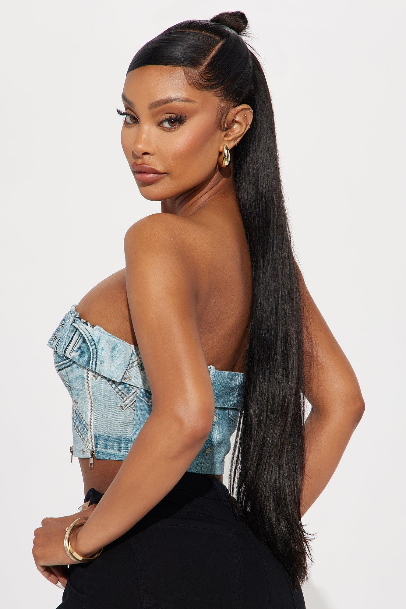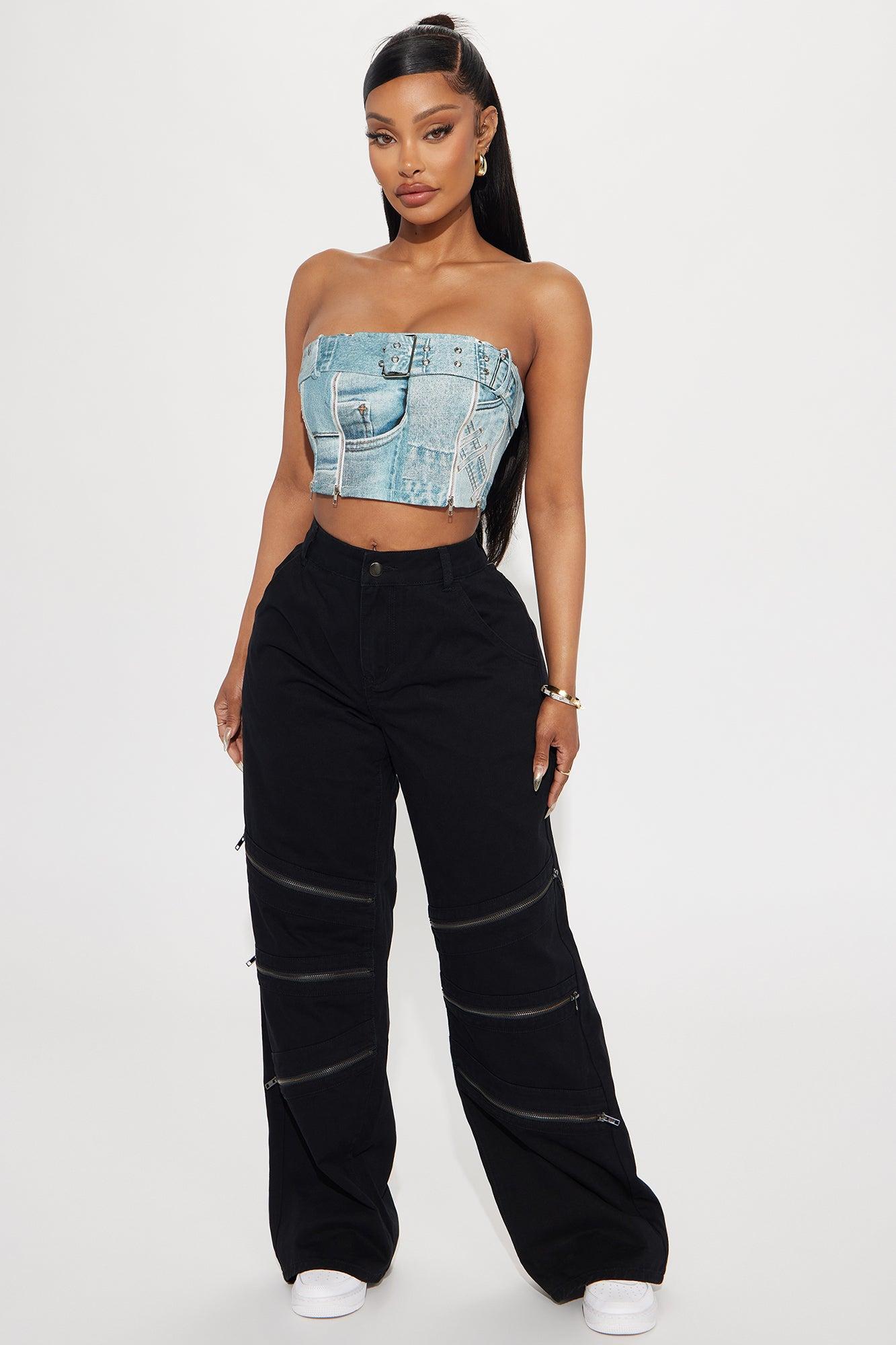 Available In Blue/combo. Tube Top Strapless Buckle Detail Zipper Detail Denim Printed Cropped Non Stretch Disclaimer: Print Placement Will Vary Self: 95% Cotton 5% Viscose Imported California Proposition 65 WARNING: Cancer and Reproductive Harm - www.P65Warnings.ca.gov.