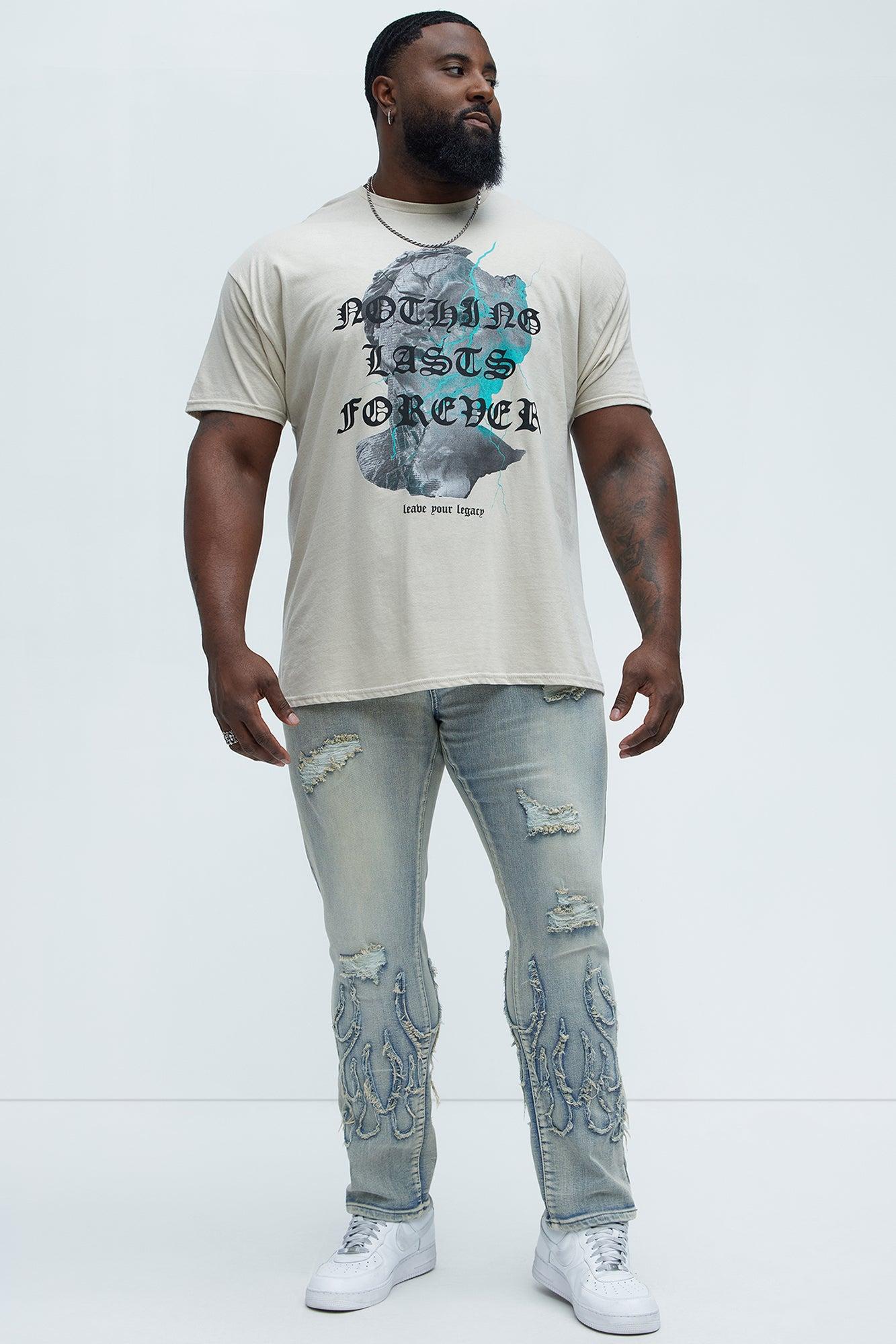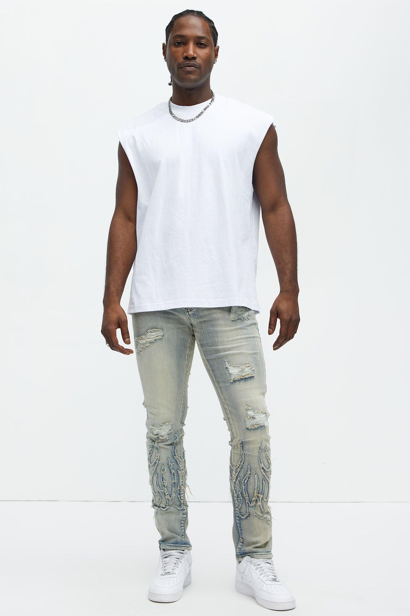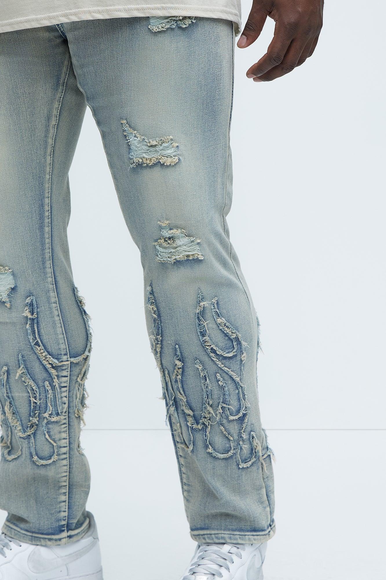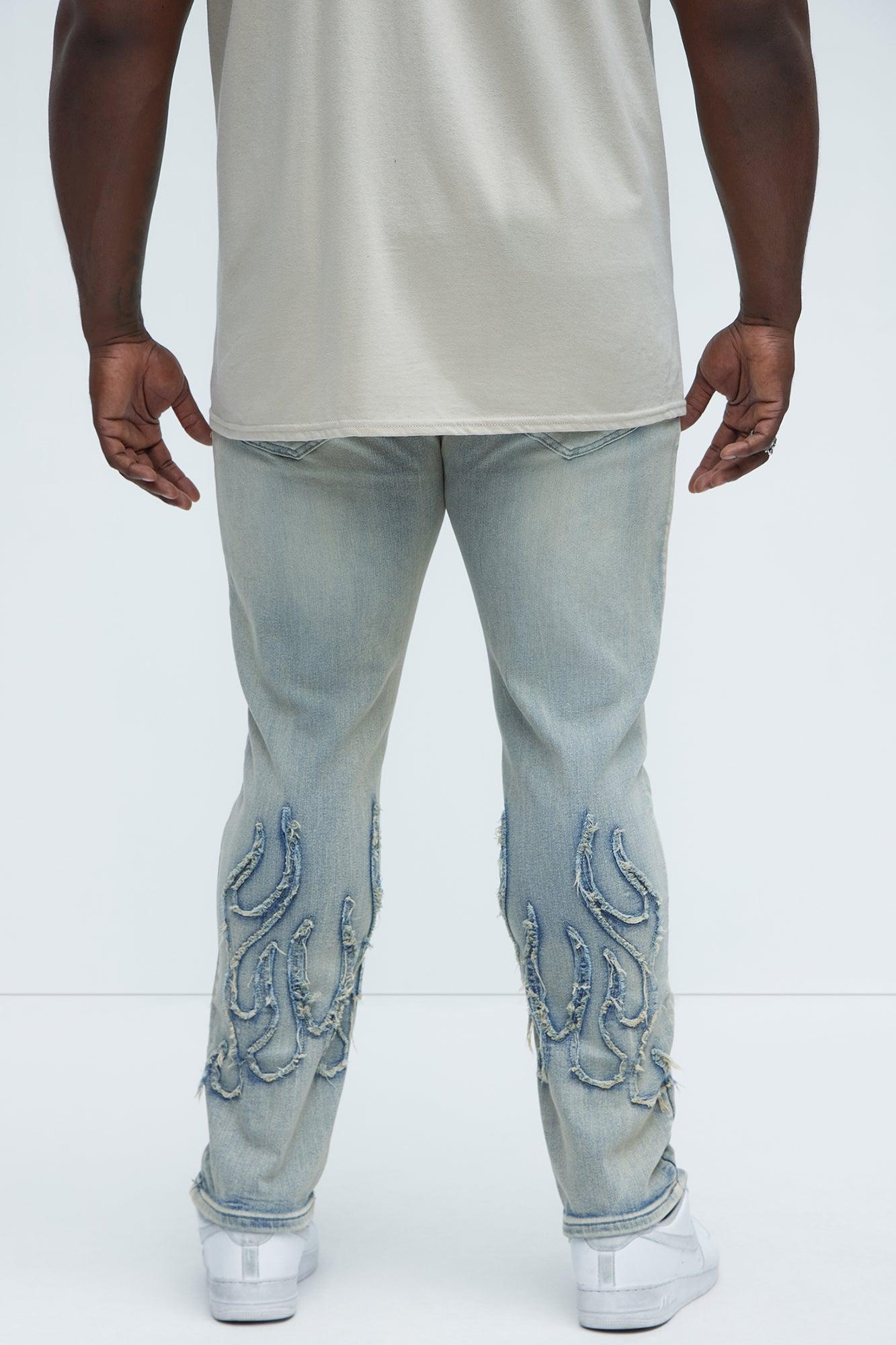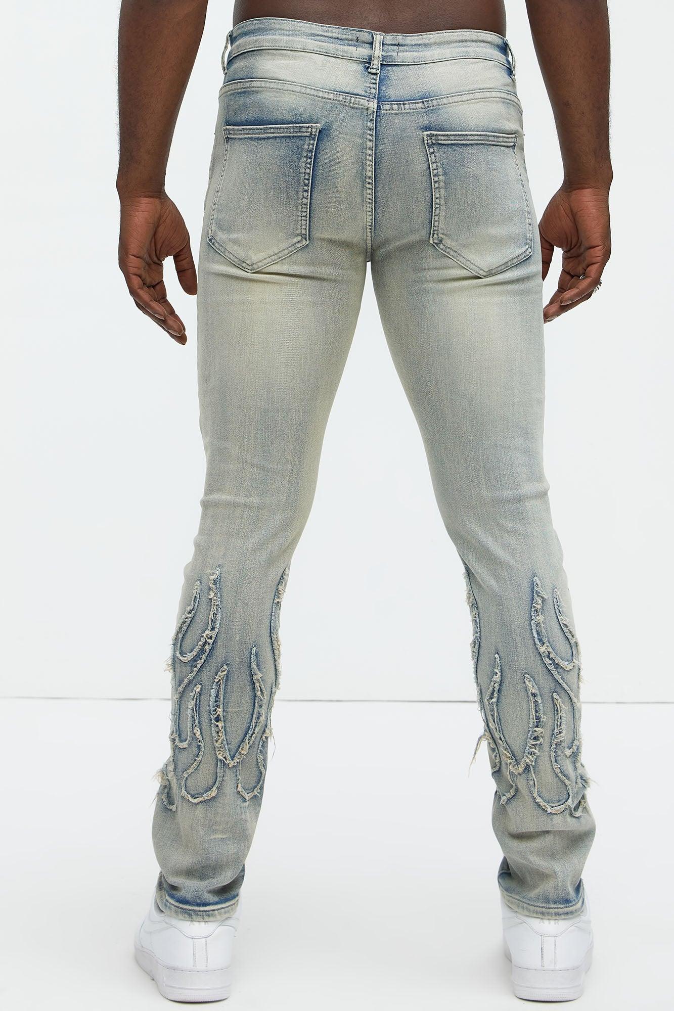Available In Light Wash. Skinny Fit Zip Fly Button Closure 5 Pocket Body Flame Fray Detail Ripped Detail Open Hem 82% Cotton, 16% Polyester, 2% Spandex Disclaimer: Due To The Specialized Distressing & Wash Process, Each Garment Is Unique. Imported