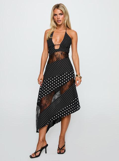 Polka-dot print, plunge neckline, front cut-out, lace detail, adjustable halter straps, tie-back detail