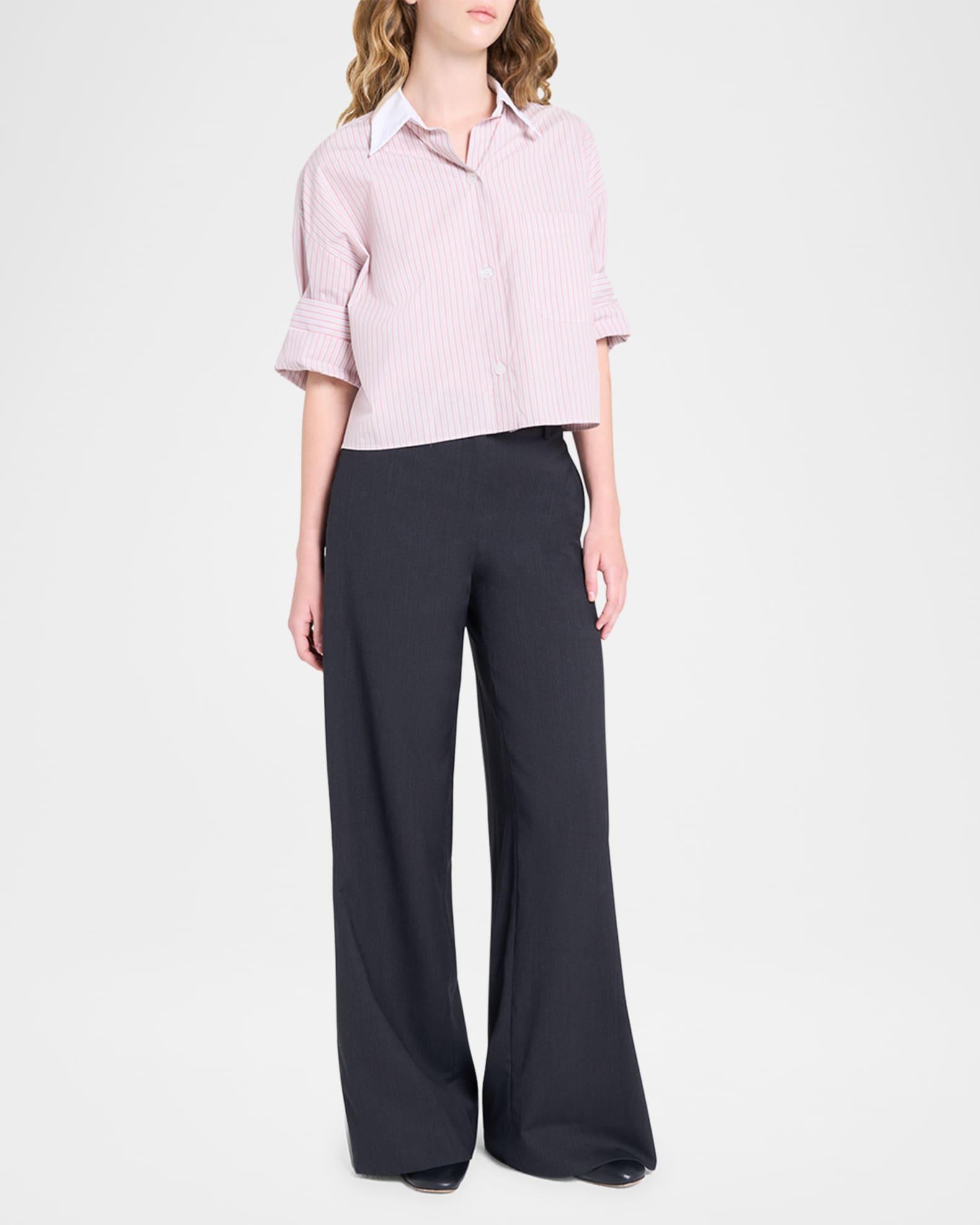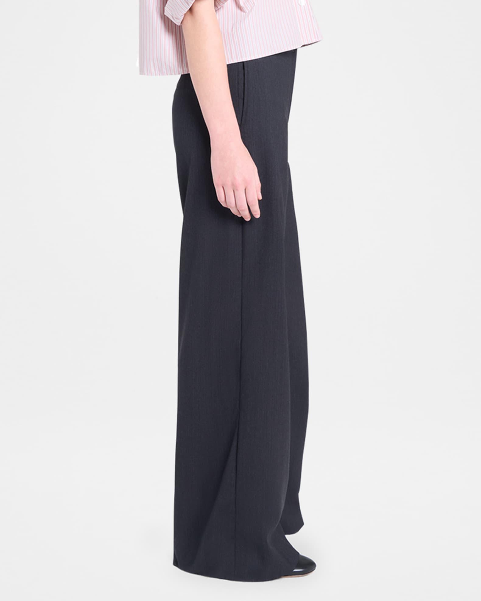 TWP "Downing" trousers crafted from Italian wool with a hint of stretch Mid rise sits high on hip Side seam and back welt pockets Full length Wide legs Hidden hook/zip fly; belt loops Wool/elastane Dry clean Made in USA from imported materials