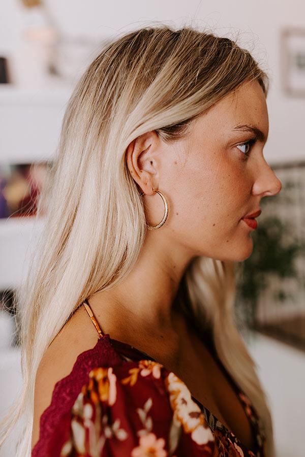 - Playful and chic, these super-cute hoops are the perfect way to spice up your trendy OOTD! - Gold colored metal material - A subtly textured hoop design - Hinge backs - Size: 1.5 inches
