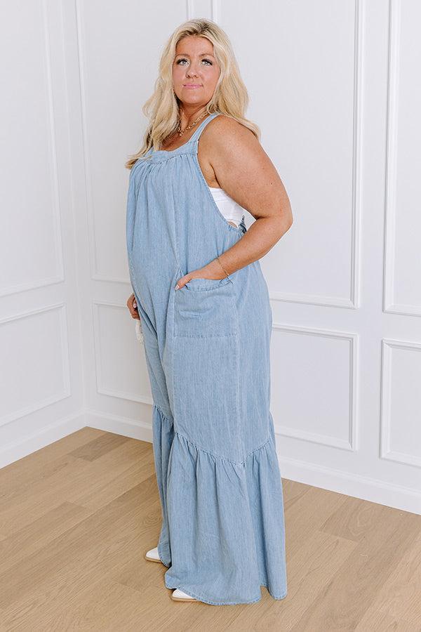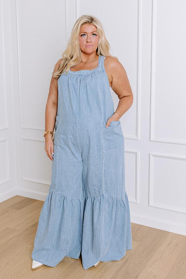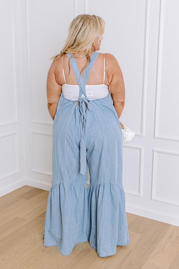 - Stay on top of the style game with this adorable jumpsuit! This playful piece adds a touch of fun to your wardrobe, perfect for any casual occasion. The trendy fit and unique design make it a standout, whether you are out for brunch or enjoying a night out. Elevate your style with this versatile unique jumpsuit, designed to keep you looking chic and feeling comfortable. - Unlined non-stretch denim material - A square cut neckline with gathered detailing - 1.5 inch shoulder straps that crisscross and tie in the back - A waistline with an elastic back - Functional side pockets - A relaxed silhouette that ends in wide hemlines