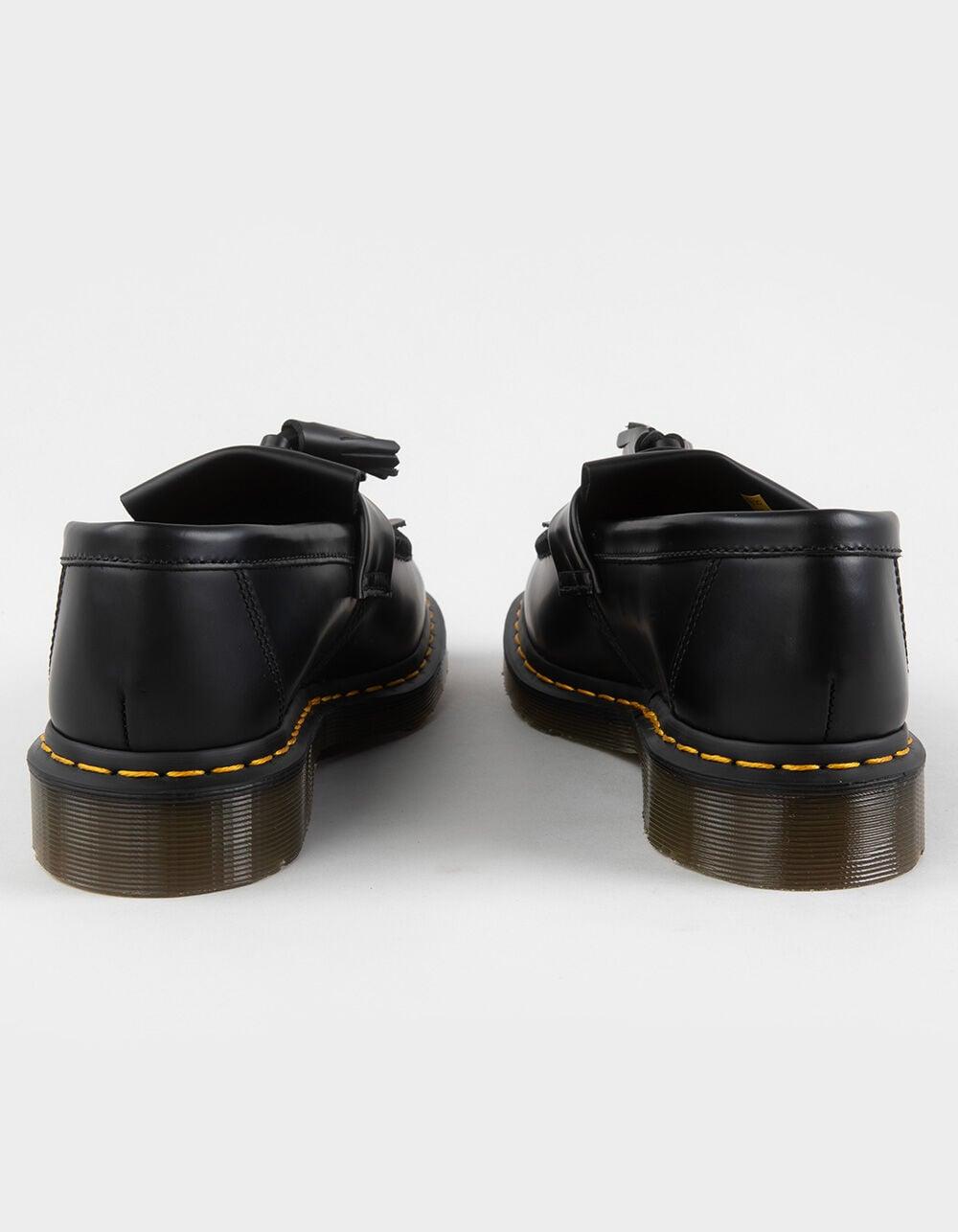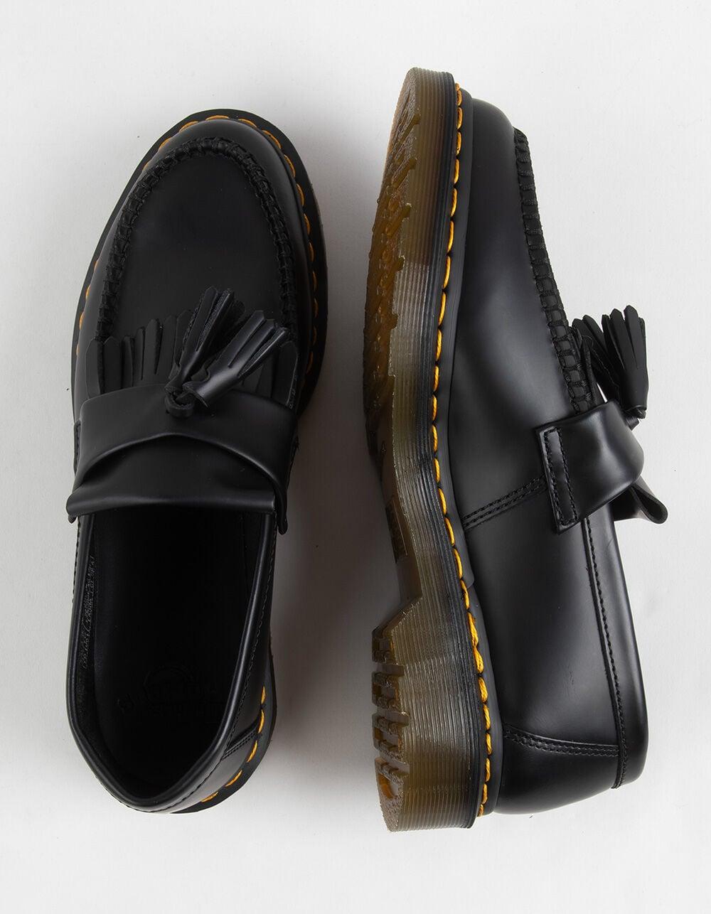 Dr. Martens Adrian Orleans Leather Loafers. The Adrian loafer fuses sharp tailoring with signature DM’s detailing. Cut from rich Orleans leather, the Adrian has a soft, waxy finish that subtly shifts in color as it moves, full of character from the first wear. Double tassels, a kiltie fringe, and contrast stitching elevate the silhouette with standout detailing. Set on Dr. Martens' BEN sole with exaggerated cleats and finished with yellow welt stitching and a grooved two-tone edge, it’s instantly recognizable and endlessly versatile. Goodyear Welted construction - the upper and sole are heat-sealed and sewn together, providing more comfort and durability for years to come. Imported.