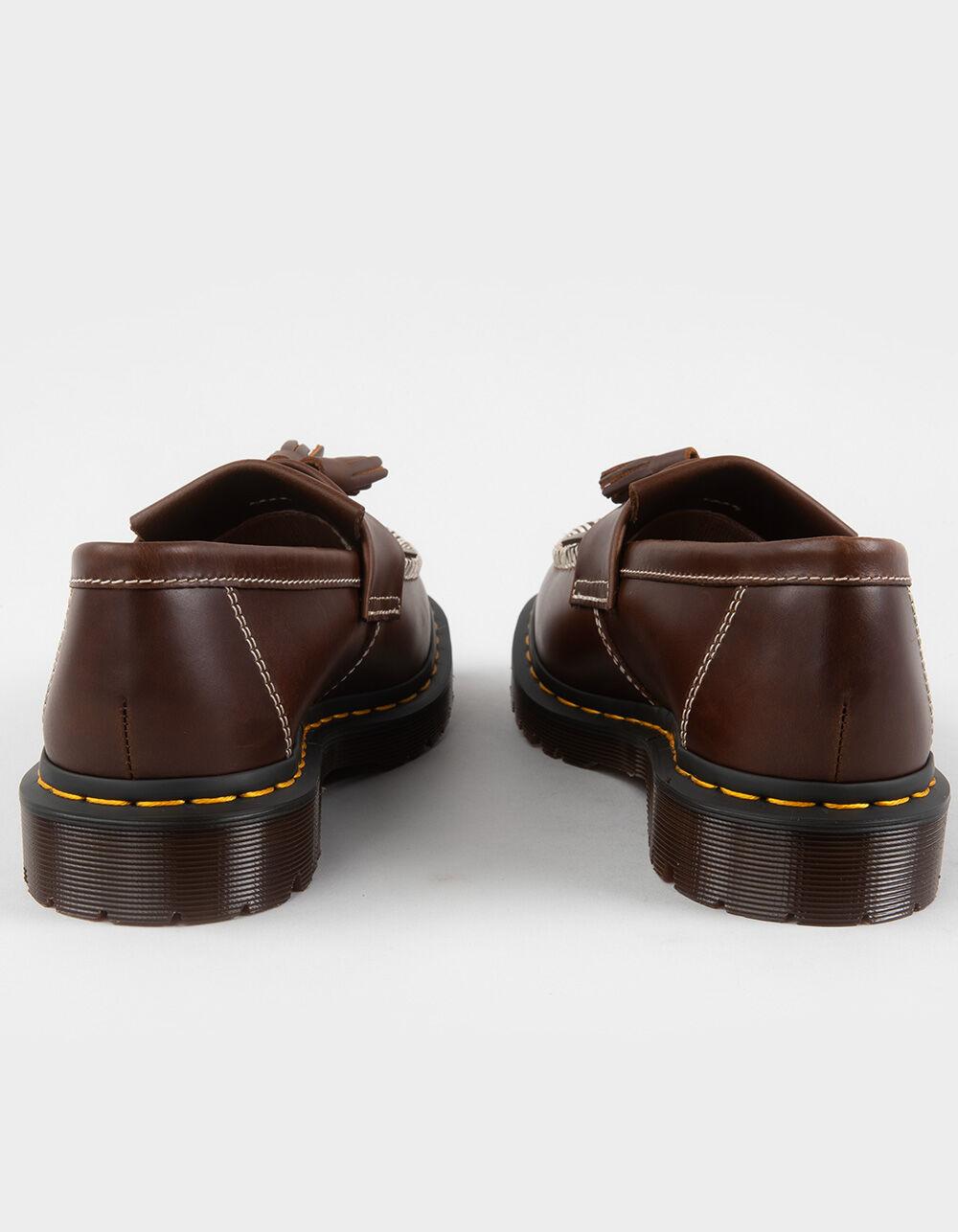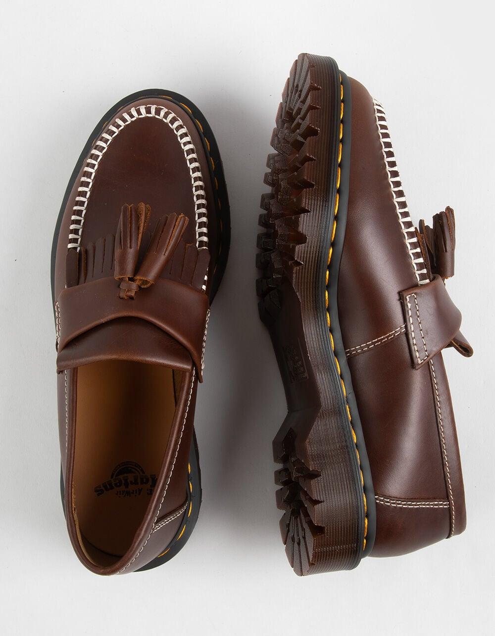 Dr. Martens Adrian Orleans Leather Loafers. The Adrian loafer fuses sharp tailoring with signature DM’s detailing. Cut from rich Orleans leather, the Adrian has a soft, waxy finish that subtly shifts in color as it moves, full of character from the first wear. Double tassels, a kiltie fringe, and contrast stitching elevate the silhouette with standout detailing. Set on Dr. Martens' BEN sole with exaggerated cleats and finished with yellow welt stitching and a grooved two-tone edge, it’s instantly recognizable and endlessly versatile. Goodyear Welted construction - the upper and sole are heat-sealed and sewn together, providing more comfort and durability for years to come. Imported.