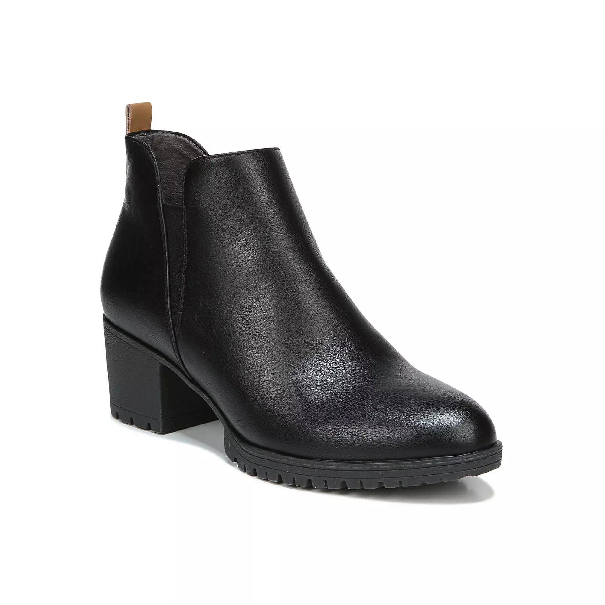 Just slip them on and go! These comfy Dr. Scholl's London block-heel booties are a no-brainer. Click this FOOTWEAR GUIDE to find the perfect fit and more! - https://www.kohls.com/feature/shoesizeguide.jsp. SHOE FEATURES: Sleek boot with twin gore for easy on/off, faux leather or microfiber upper, and block heel, Fabric toe box, linings and topcloth made from recycled bottles, and heel counter made from recycled materials, Insole Technology with anatomical cushioning, comfort and support, Lightweight, flexible construction moves with you. SHOE CONSTRUCTION: Fabric upper, Fabric lining, Manmade outsole, Contains 55% recycled polyester, 45% virgin polyester. SHOE DETAILS: Almond toe, Slip-on, Padded footbed, 3.82-in. shaft height, 9.92-in. shaft circumference, 2-in. heel height, Spot clean. Color: Black. Gender: female. Age Group: adult. Material: SYNTHETIC.