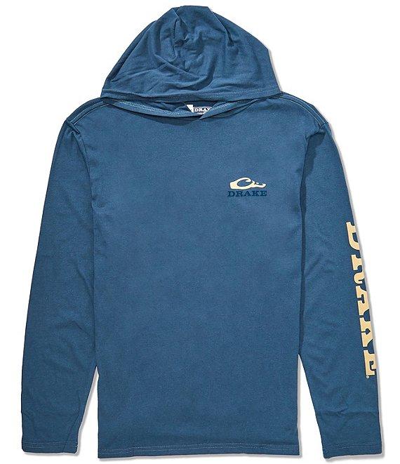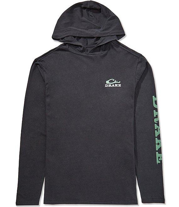 From Drake Clothing Co., this t-shirt features: Crew neck Attached hood Long sleeves "Drake" printed on left sleeve Logo on the left side of chest Pullover construction Lightweight Cotton/polyester Machine wash/tumble dry Imported.