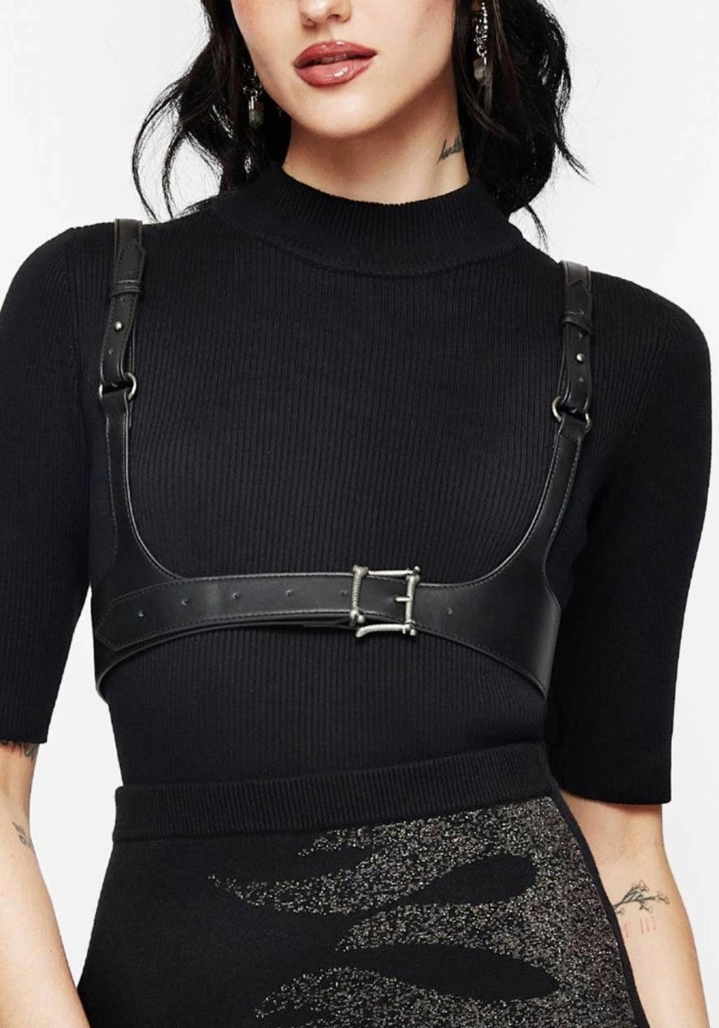 Black Buckled Harness Silver Bone Buckle Adjustable Shoulder Straps Total Belt Length: S/M: 85cm, M/L: 95cm, L/XL: 117cm 100% Polyurethane (Polyester)