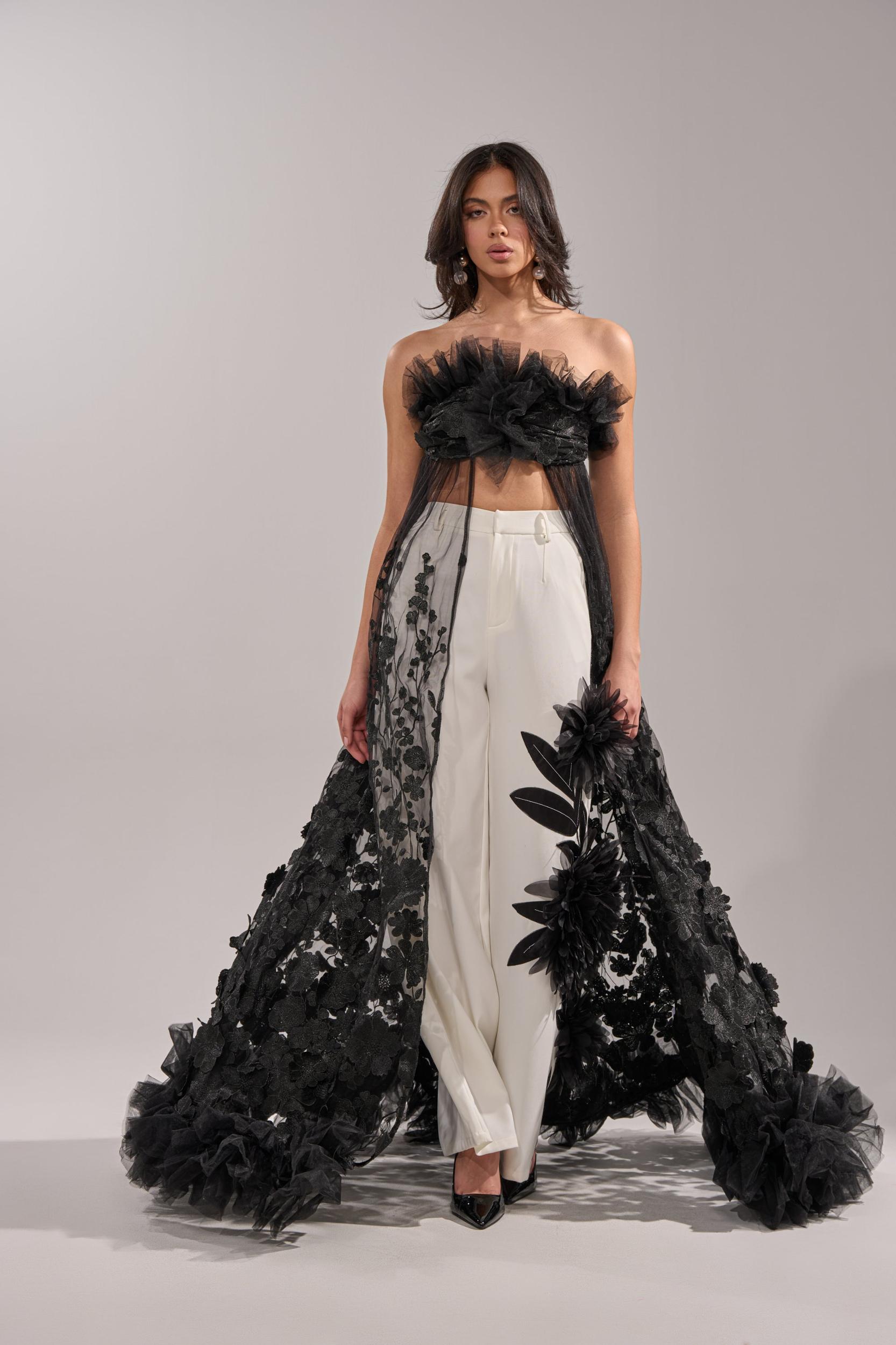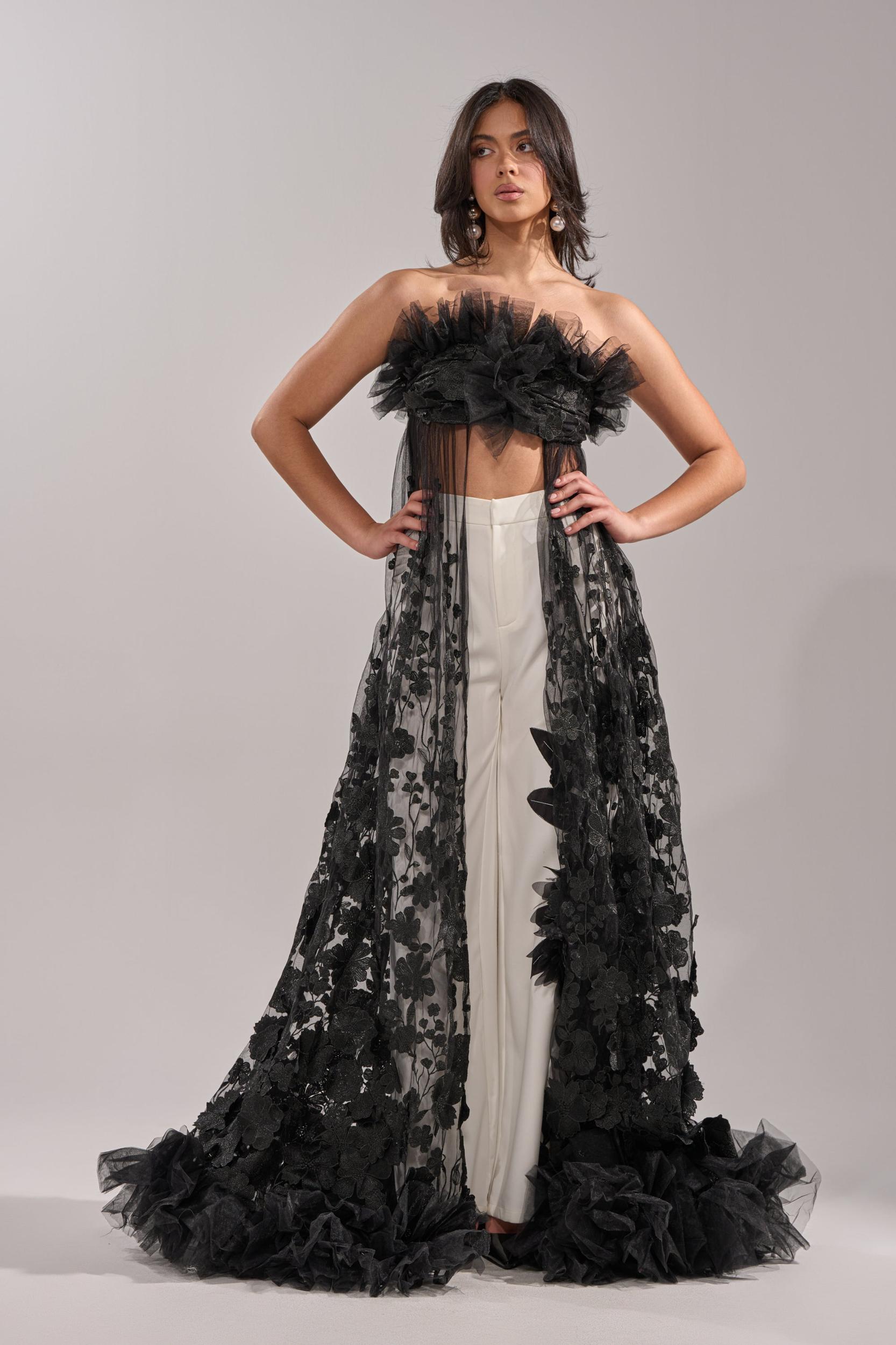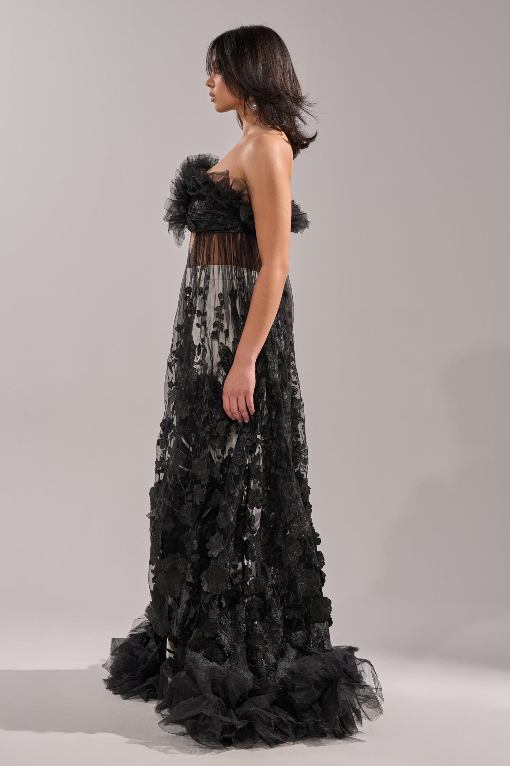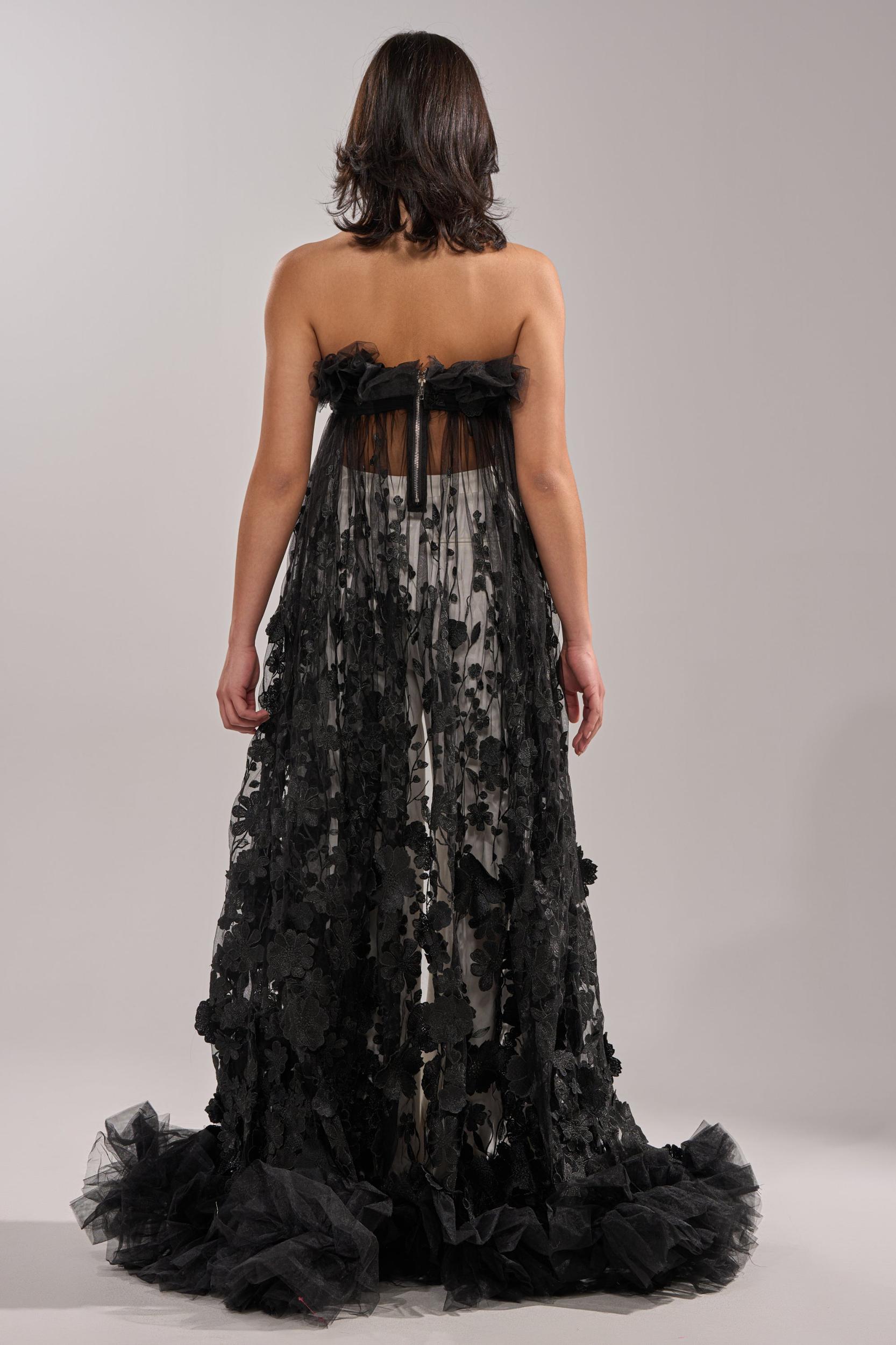 Dramatic black tulle strapless floor length top for special occasions. This piece features a sweetheart neckline, voluminous tulle and flower appliqué at the bust, back silver hardware zipper, sheer lace floor paneling with floral embroidery, and soft ruffled hems. Style with a black high-waisted cigarette pant and kitten heels for an avant garde evening wear look! - Shell: 100% Polyester, Lining: 92% Polyester 8% Spandex- No Stretch- Imported (all measurements are approximate from size small)- 57” Chest to Hem- Model is 5’9.5” and wearing size smallProduct ID: 1073692