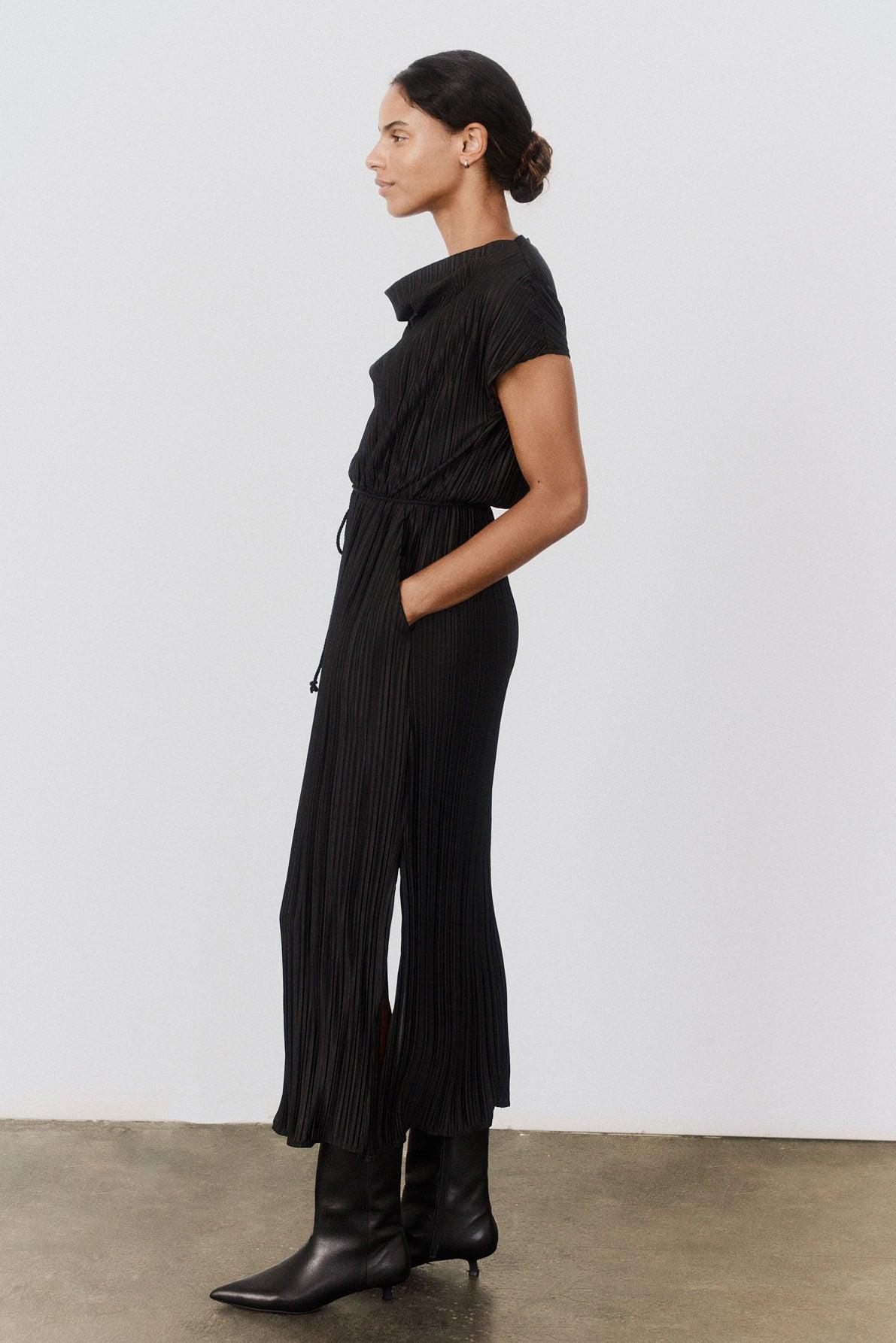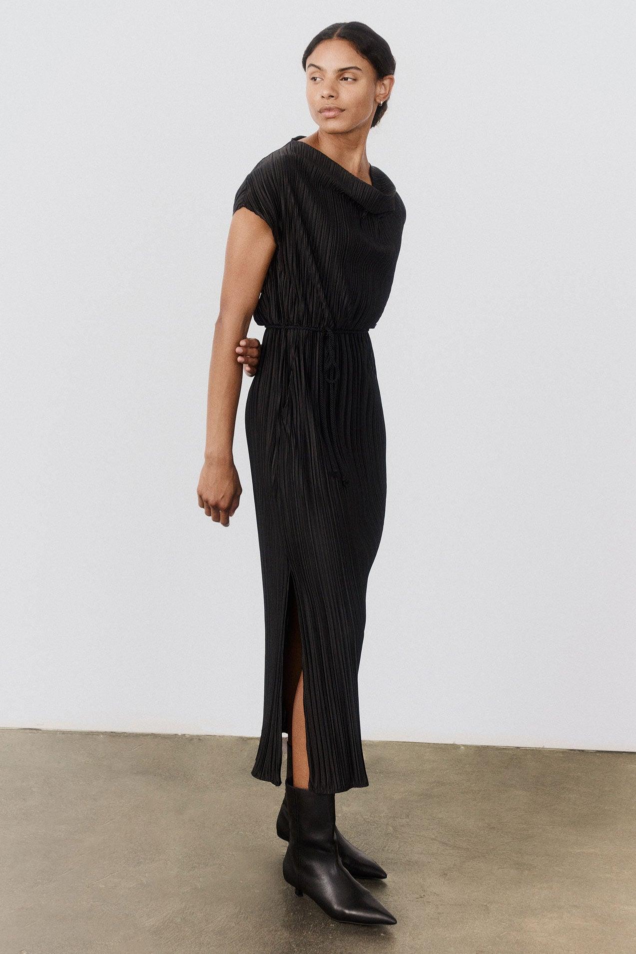 A flowing maxi dress featuring elegant draped pleats that create a graceful silhouette. This dress combines a tie detail for a fitted waist with a relaxed skirt, offering a refined yet effortless style for any occasion. Fit-and-flare silhouette Intended to hit above the lower calf Tie detail for waist adjustability Draped neckline Short sleeves