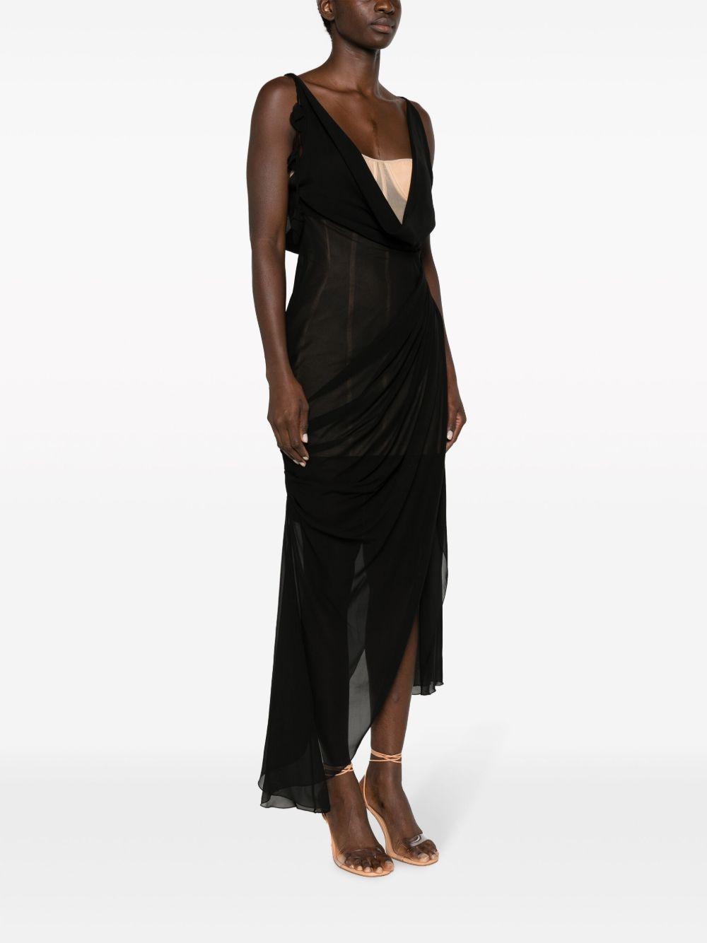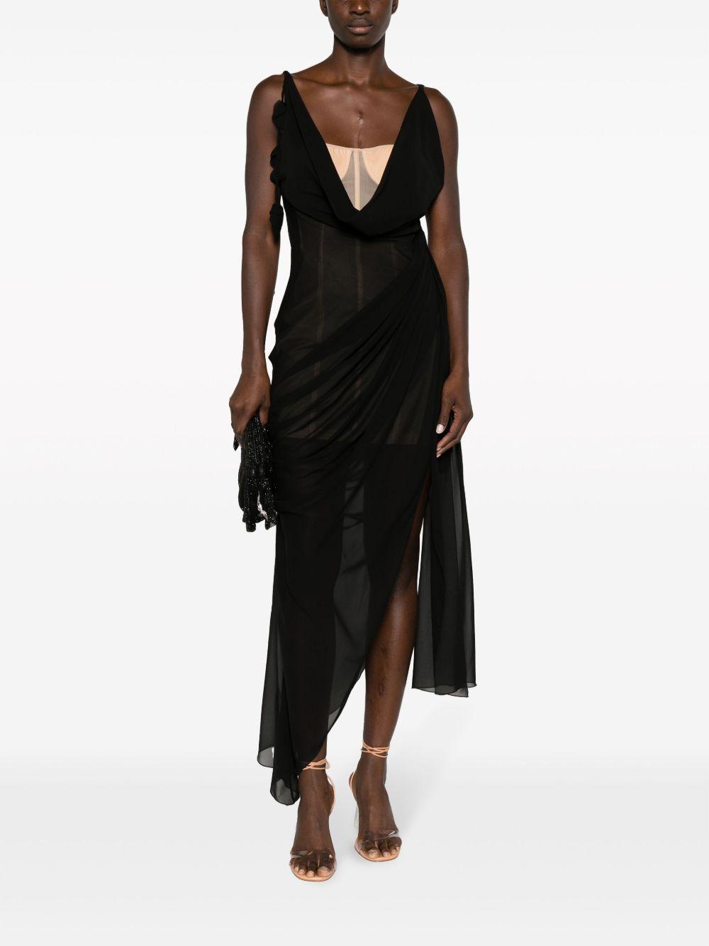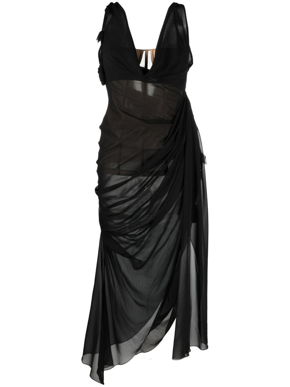 Blumarine draped sheer silk dress | Black | black | silk | georgette crepe | semi-sheer construction | tassel detail | floral embroidery | draped design | boned bodice | cowl neck | sleeveless | side slit | asymmetric hem | Silk/Polyamide/Elastane | Evening Dresses | Dresses | Clothing | Women