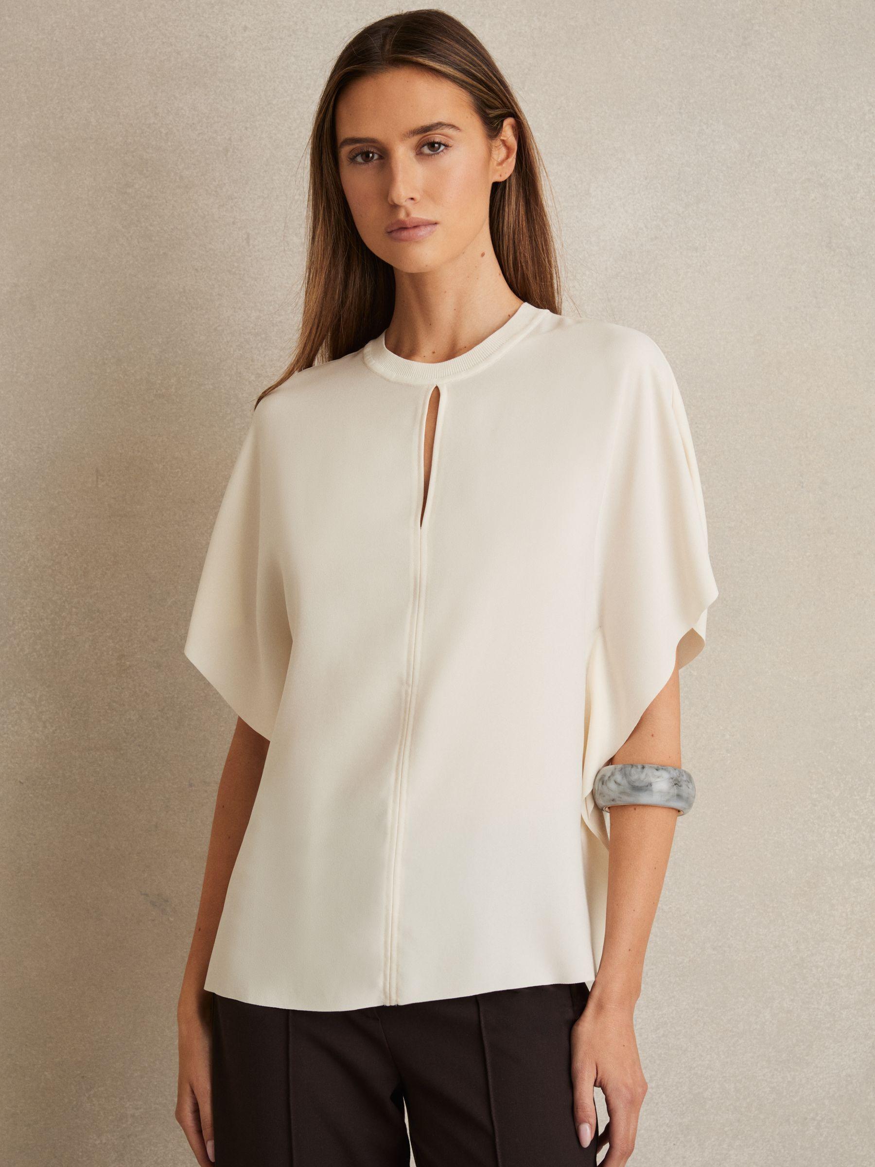 Inspired by a classic T-Shirt shape, the Tania top is enhanced with a keyhole opening to the chest, visible seam detailing, and draped sleeves. It falls against the body in a relaxed fit with stretch. Keyhole opening to chest. Visible seam detailing. Draped sleeves. Measurements of model: 5ft9.5'' / 176.5cm. The model is wearing a size S.