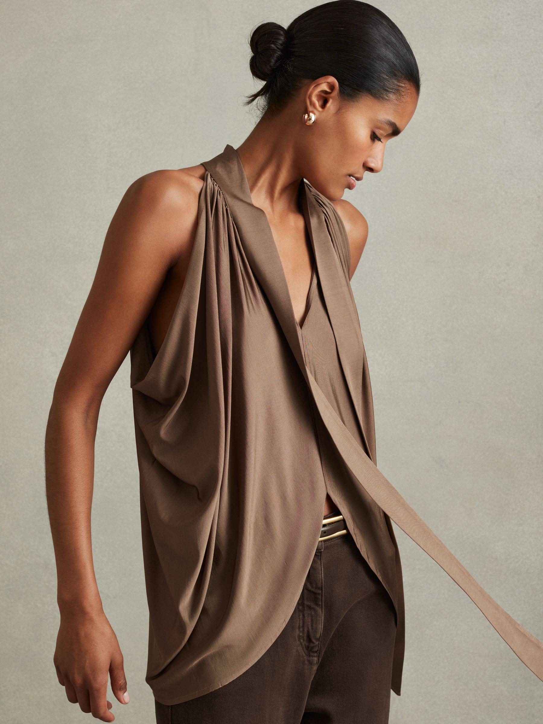 The Luisa top is made from a supple jersey fabric with an irresistible sheen. It’s crafted with slouched arm holes, a split hem, and a tie-neck element which drapes down the front. This garment is gathered around the neckline for a naturally pleated look. Jersey. V-neckline. Tie-neck element. Slouched arm holes. Split hem. The model is wearing a size 8. Measurements of model: Height 5 10" / 177.8cm.