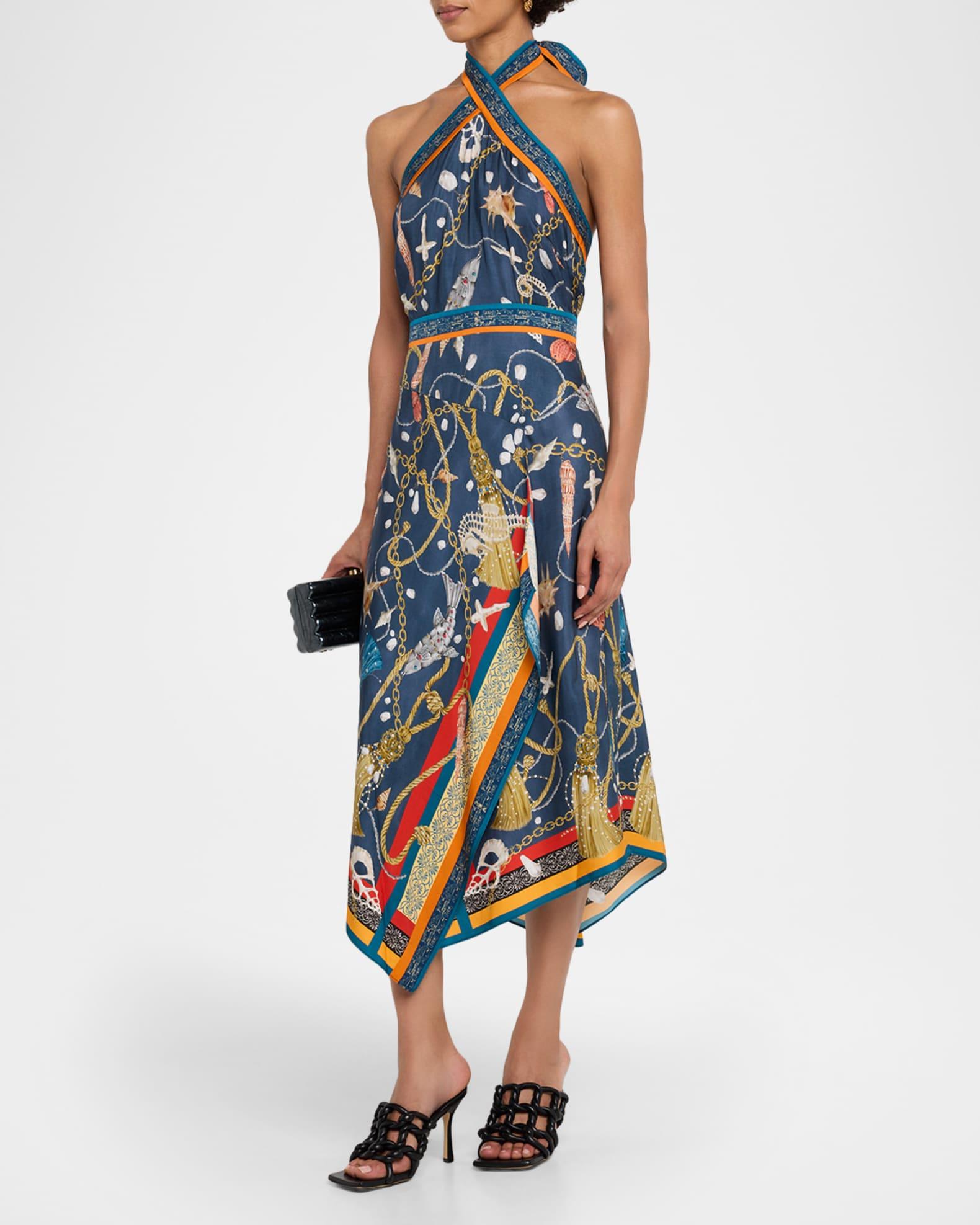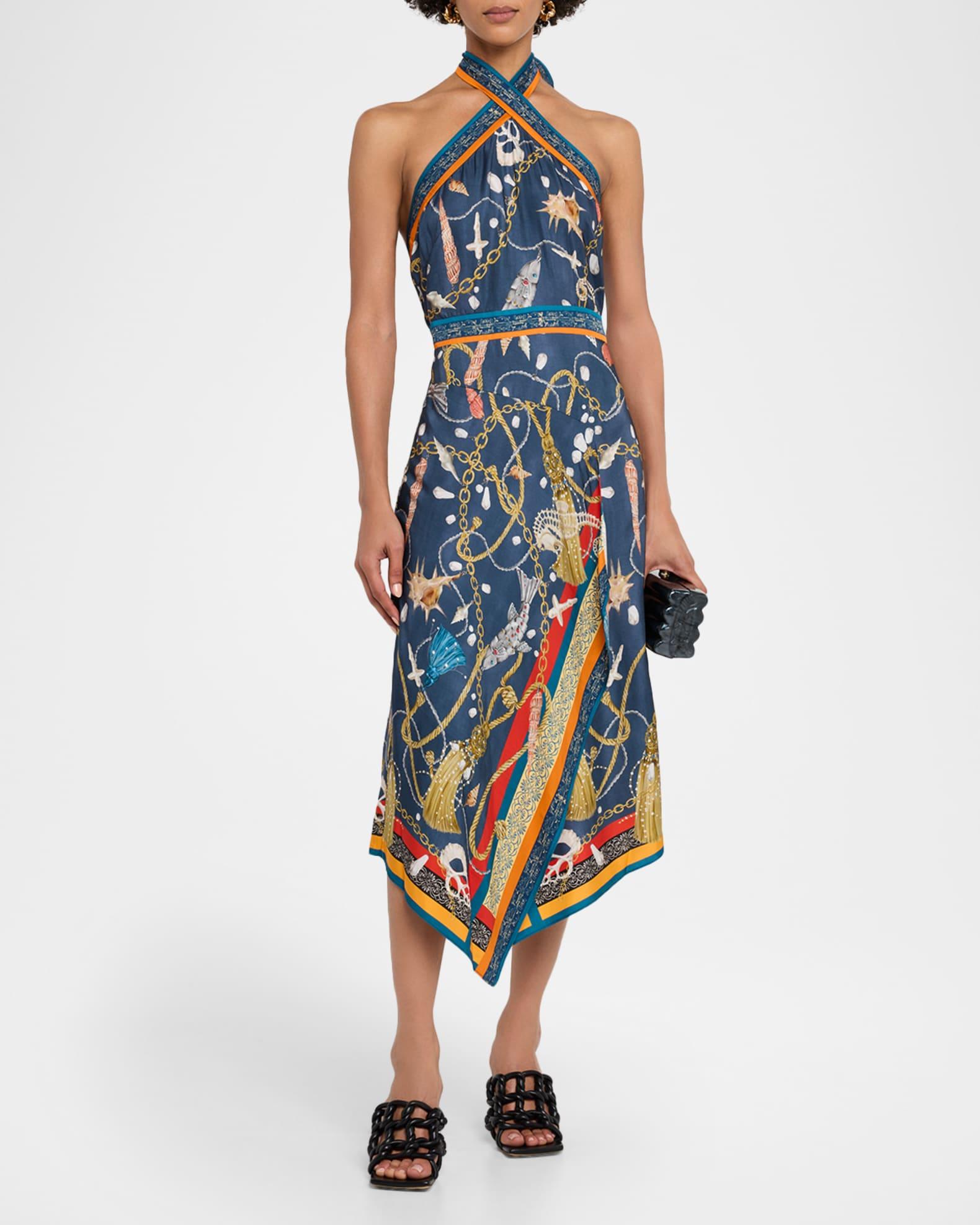 Marchesa Rosa draped midi dress in viscose twill features a nautical-inspired chain and rope print Approx. 54.5"L from shoulders to hem Crossover halter neckline Tasseled self-tie behind the neck Sleeveless Lower back smocking Asymmetric hem Hem falls below the knee A-line silhouette Invisible back zipper Viscose Imported