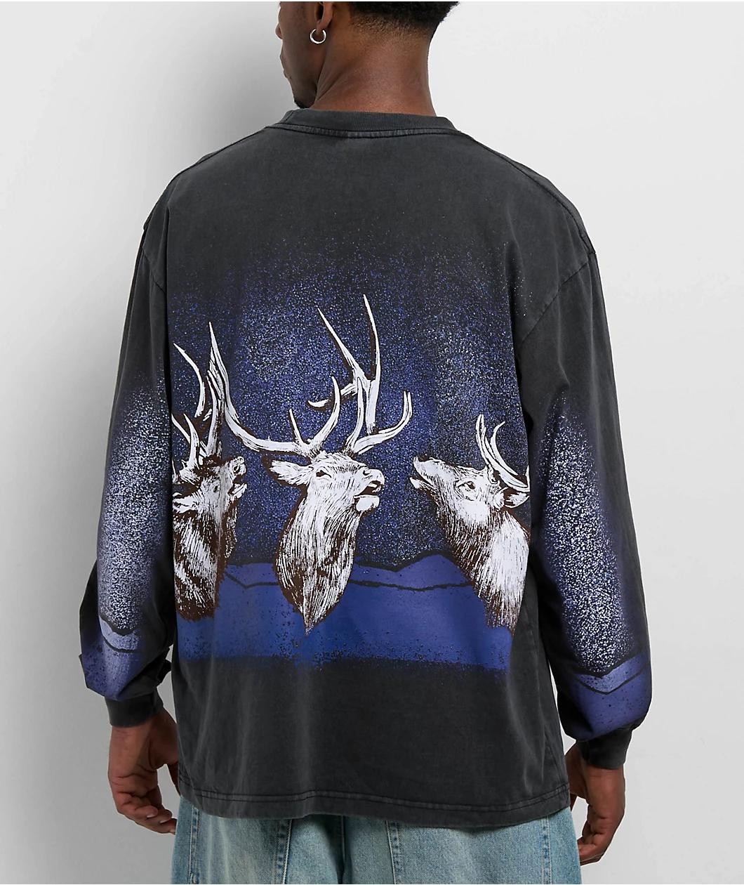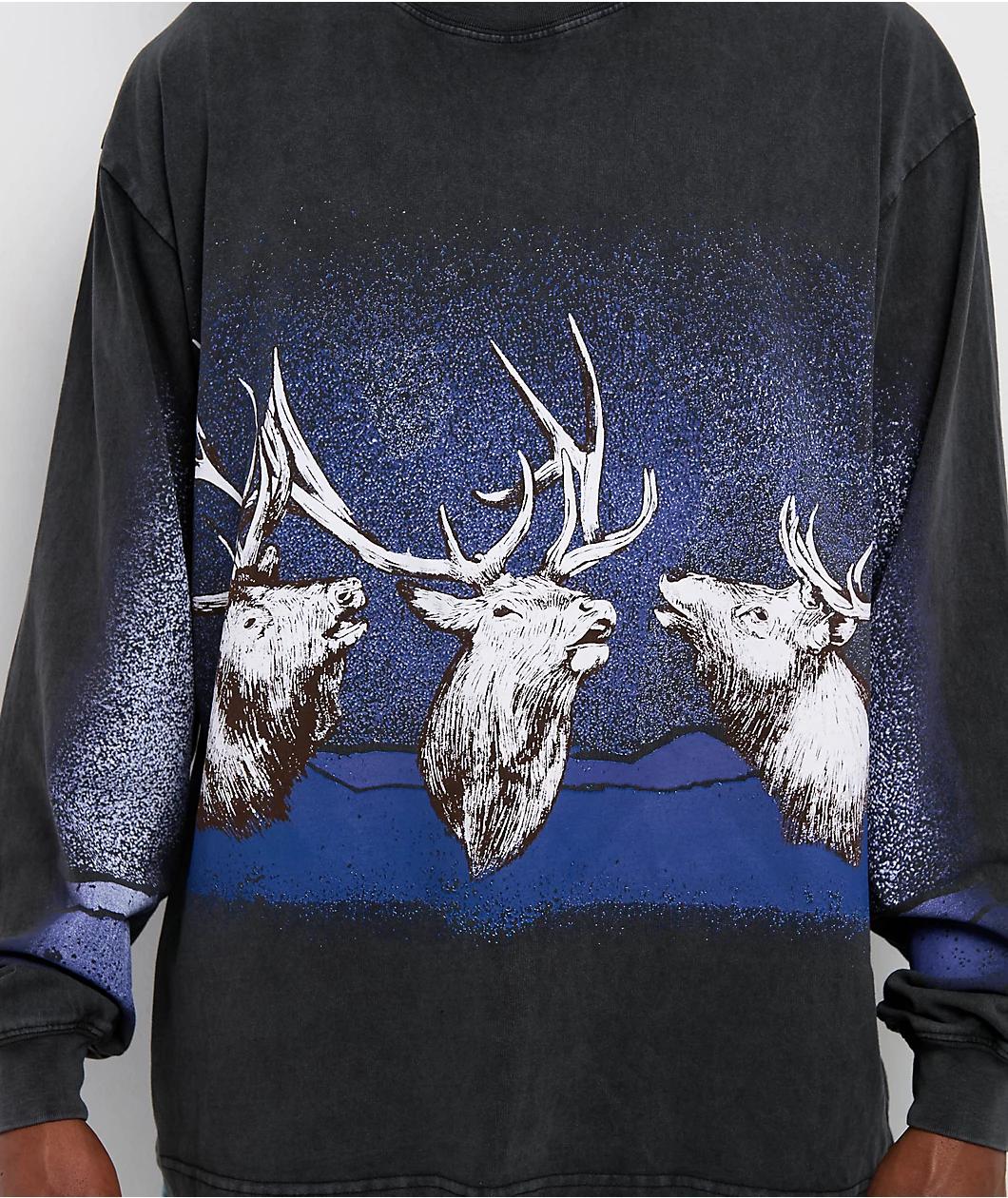 Add an outdoorsy vibe to any outfit with the black 100 Acre Wood long sleeve t-shirt from Dravus. Decorated with a graphic pattern on the front and back of three Elk, the image's mountainous background is continued on the sleeves for a creative, cohe