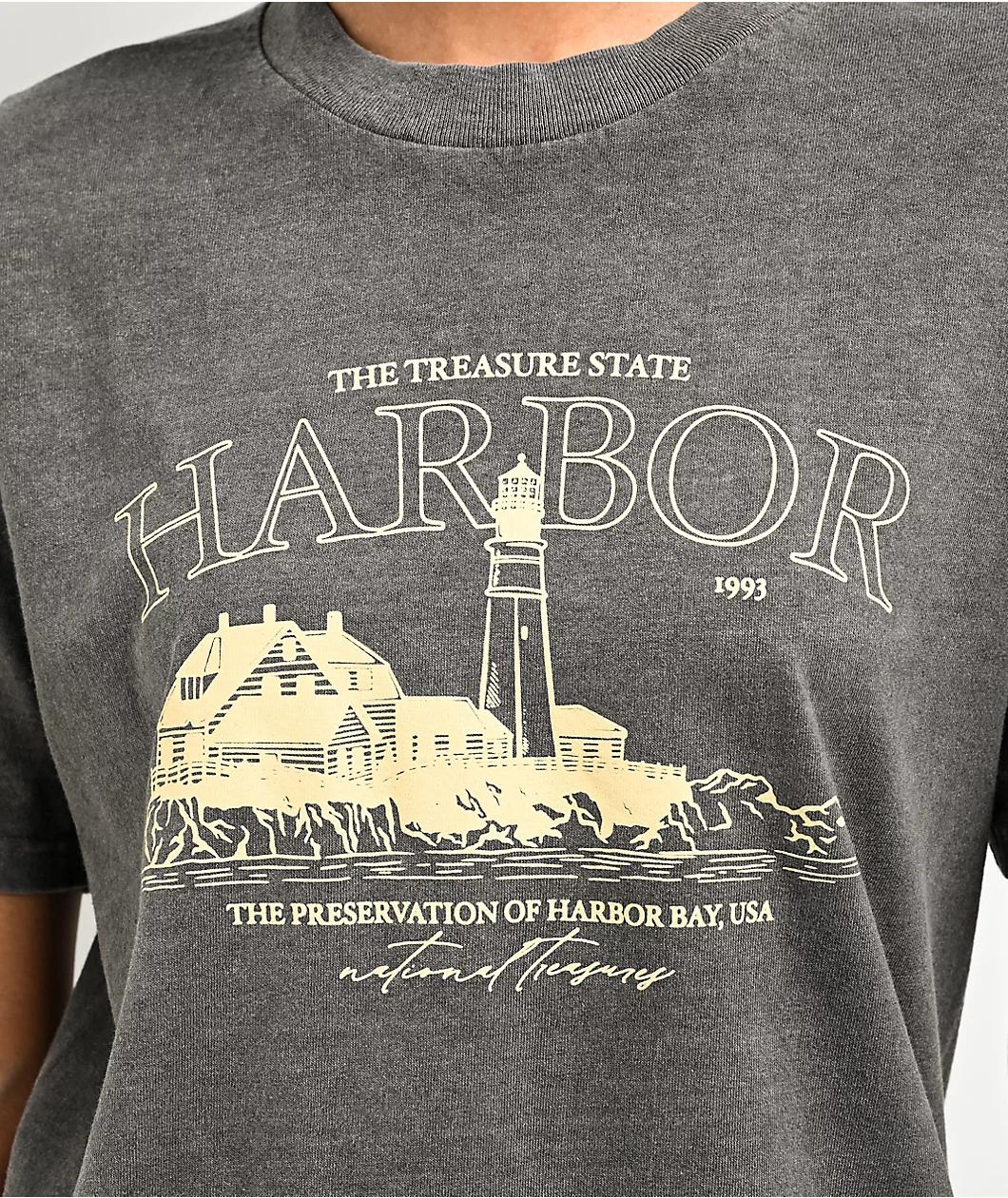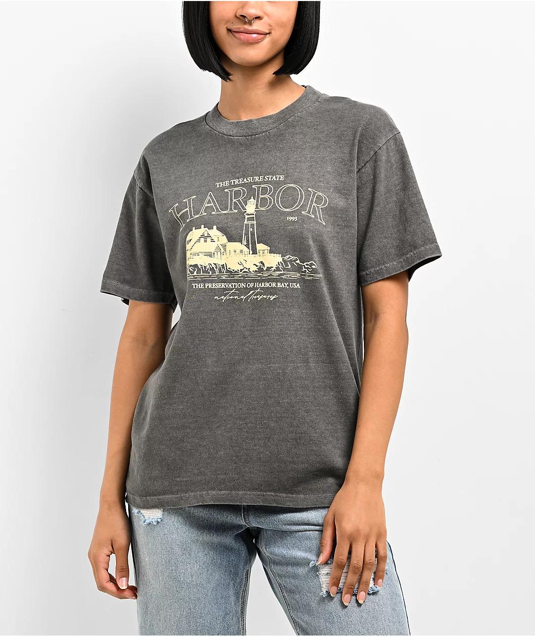 The Dravus presents the Parks N Rec t-shirt in a black wash color scheme, showcasing a nice graphic of a scenic lighthouse with "Harbor" written in large typography above the graphic. This tee is made from cozy cotton complemented with a ribbed neck