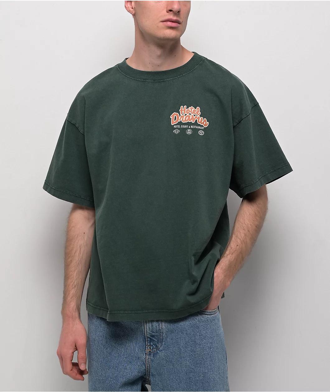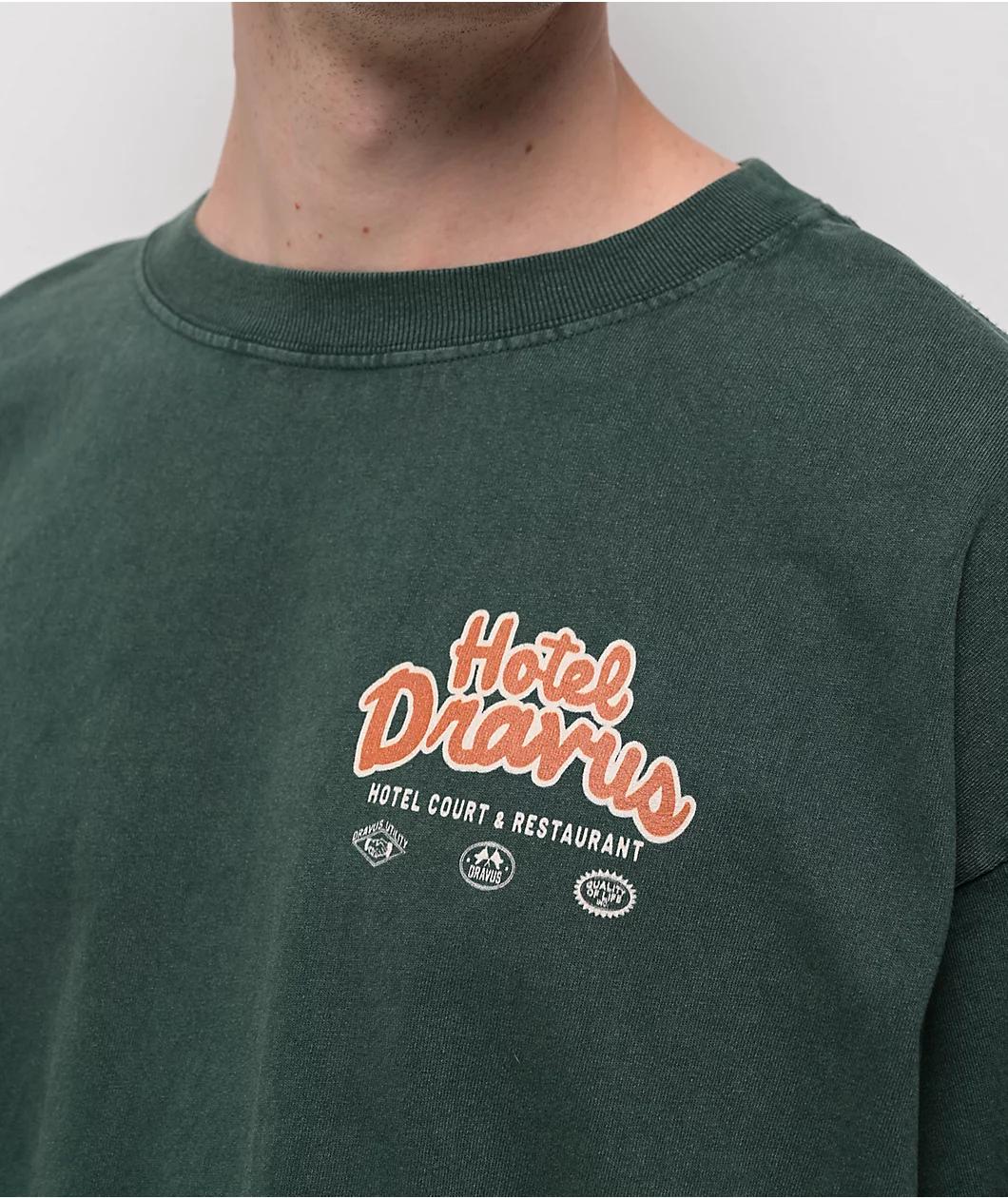 The folks at Dravus pay homage to rustic hospitality everywhere with the Retro Hotel t-shirt, landing in a forest green cotton construction with printed graphics on the left chest and back. Decorated with branding as the name of a Hotel on the left c