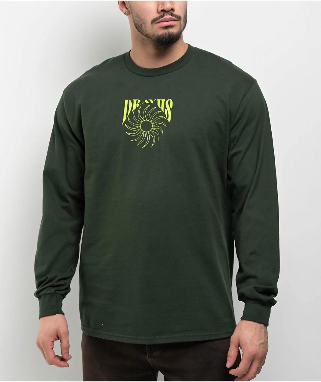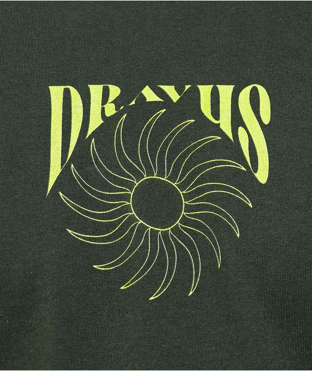 The folks at Dravus present the Run In The Sun long sleeve t-shirt in a green colorway with screen-printed graphics on the front and back. The front of the shirt has branding placed above a Sun motif, while a larger intricate version of the design em
