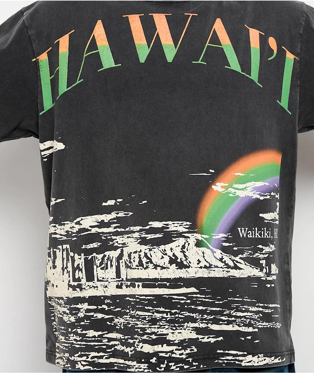 Add a tropical vibe to any outfit with the Waikiki t-shirt from Dravus. The tee arrives in a washed Vintage black, and features artwork of Hawaii's Waikiki beach on the front and back. A rainbow graphic compliments colorful Hawaii text across the che