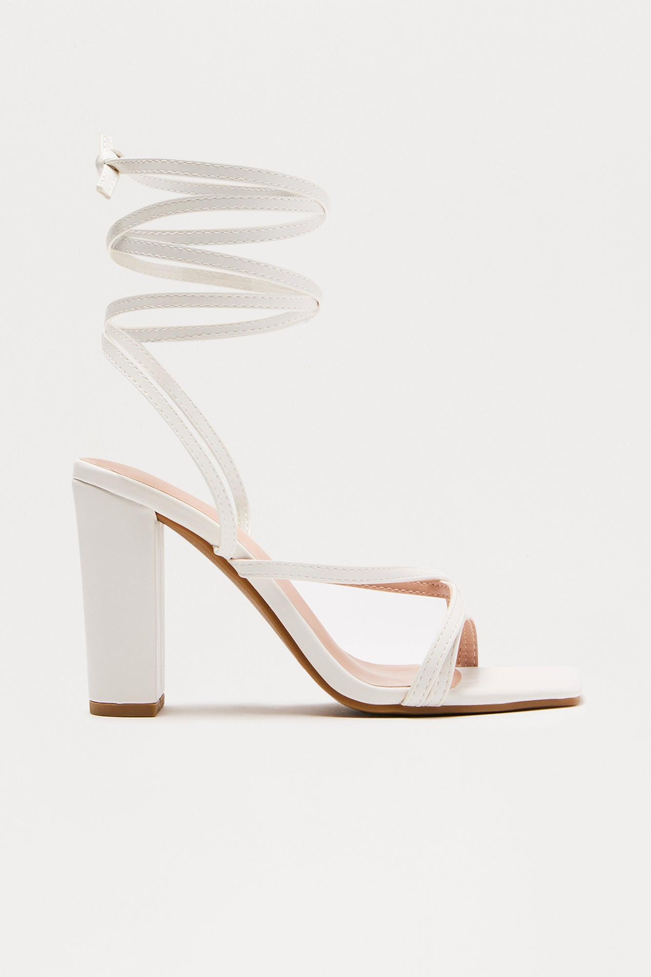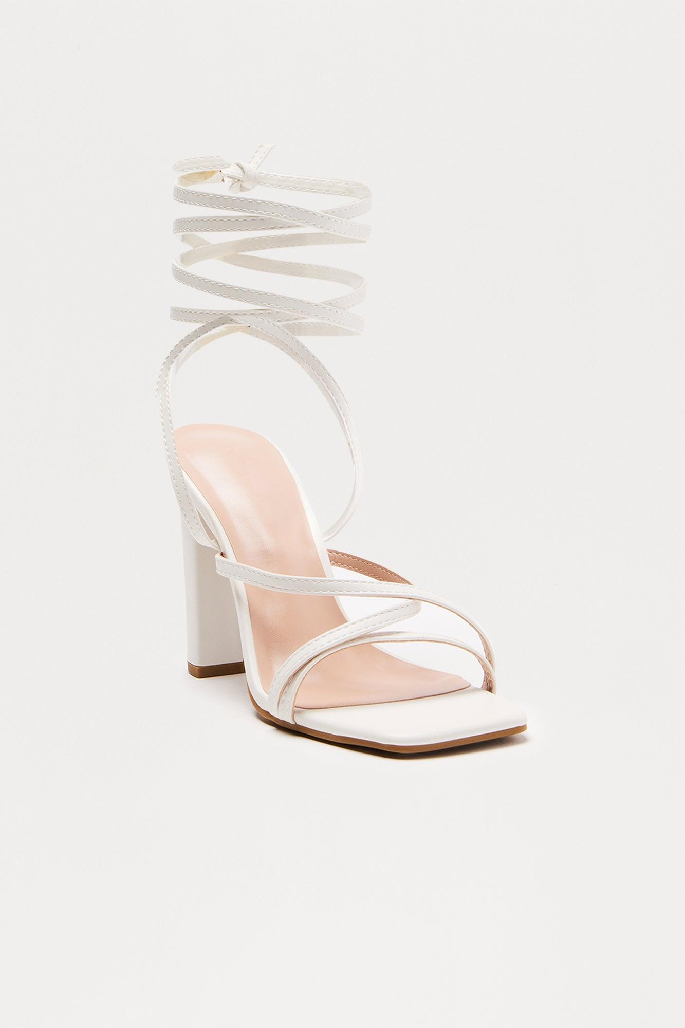 Available In White. Wrap Up Heels Square Toe Strappy 4" Block Heel Imported California Proposition 65WARNING: Cancer and Reproductive Harm - www.P65Warnings.ca.gov.