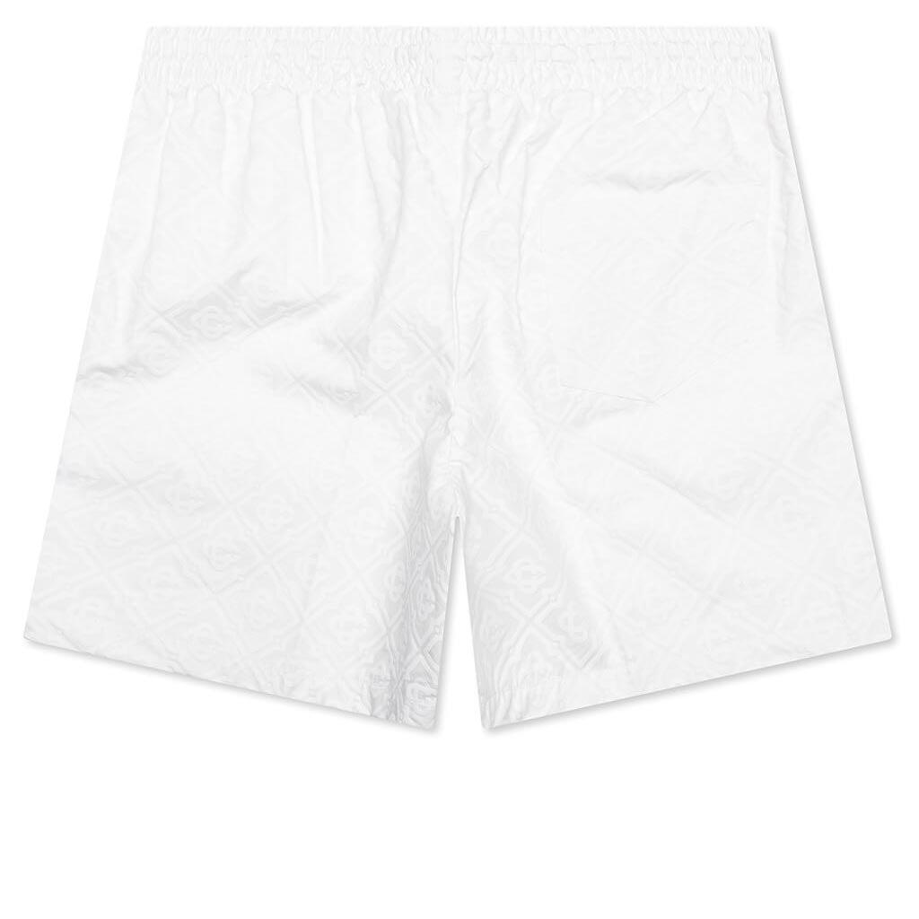 The Drawstring Shorts in White combine comfort with bold design. Crafted from cotton, these shorts feature an all-over print that adds visual interest. The elasticized waistband with adjustable drawstrings ensures a personalized fit, while side seam pockets provide functional storage 100% Cotton All over print Elasticized waist Drawstrings at waistband Side seam pockets Stlye No: MPS25-TR-287-01