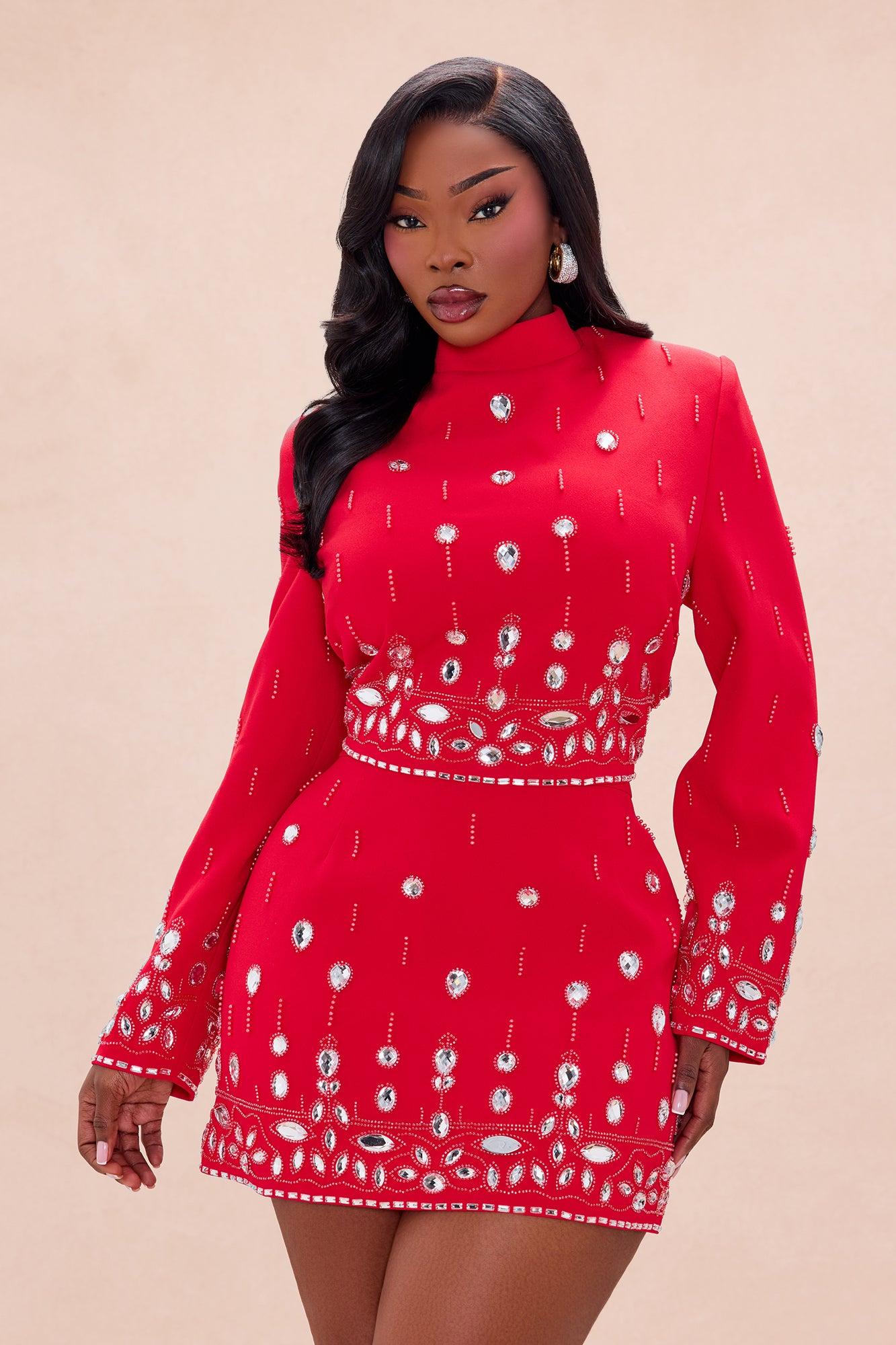 Available In DarkRed And White. Rhinestone Embellished Skirt Ensemble Top Long Sleeve Shoulder Pads Mock Neckline Back Zipper Closure Lined Non Stretch Mini Skirt Hidden Back Zipper Closure Lined Shell: 100% Polyester Lining: 100% Polyester Imported