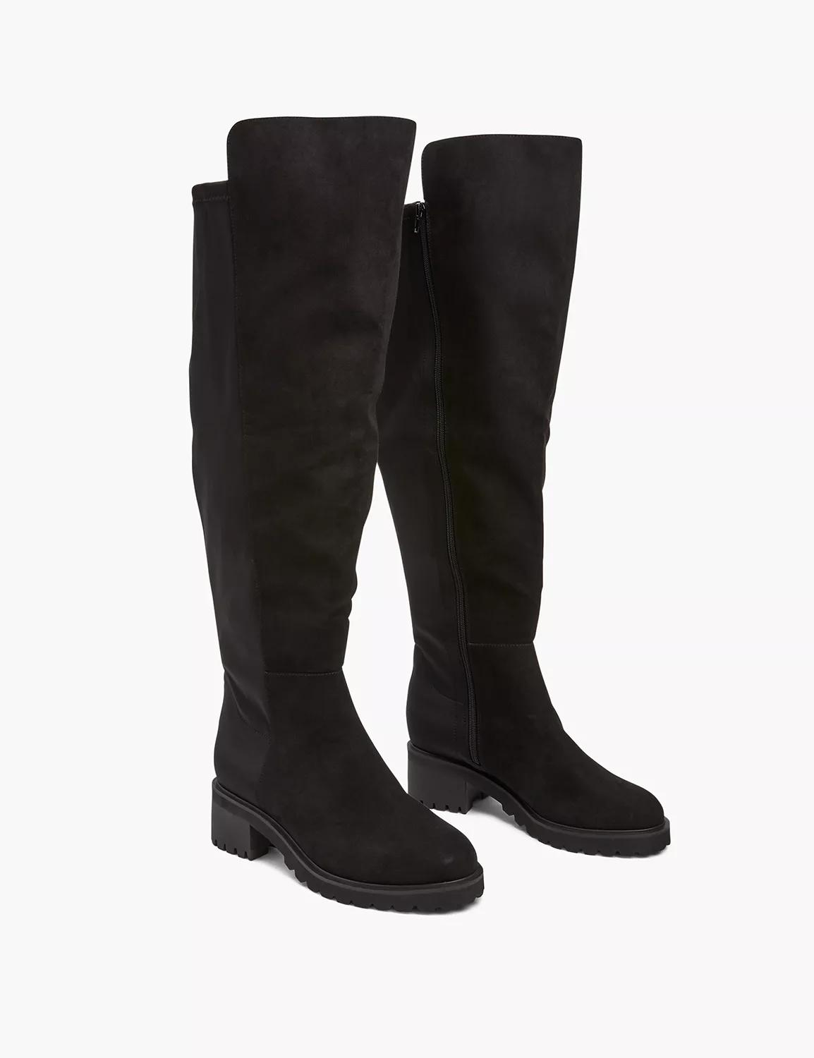 The over-the-knee height is oh-so-sexy, while the lug sole keeps it grounded and edgy. This boot in soft faux microsuede is perfect to pair with dresses, skirts and leggings this season. Stacked heel. Lug sole. Side zipper closures. DREAM CLOUD INSOLE: Designed with an additional 5mm of cushion padding for extra comfort. Its like walking on a. well, you know. WIDE WIDTHS: Unlike industry standard, we design with a true wide width that extends both the sole and the upper shoe itself for a more comfortable fit - no tightness or pinching. EXTRA WIDE CALF: All boots come standard with a wide calf width. We also offer an Extra Wide Calf option that is an additional 2 wider. Item Number #401997, Heel Height: 2.1, Boot Height: 20, Calf Circumference: 18 (Regular), 20 (Extra Wide Calf), Imported Wide Width Footwear
