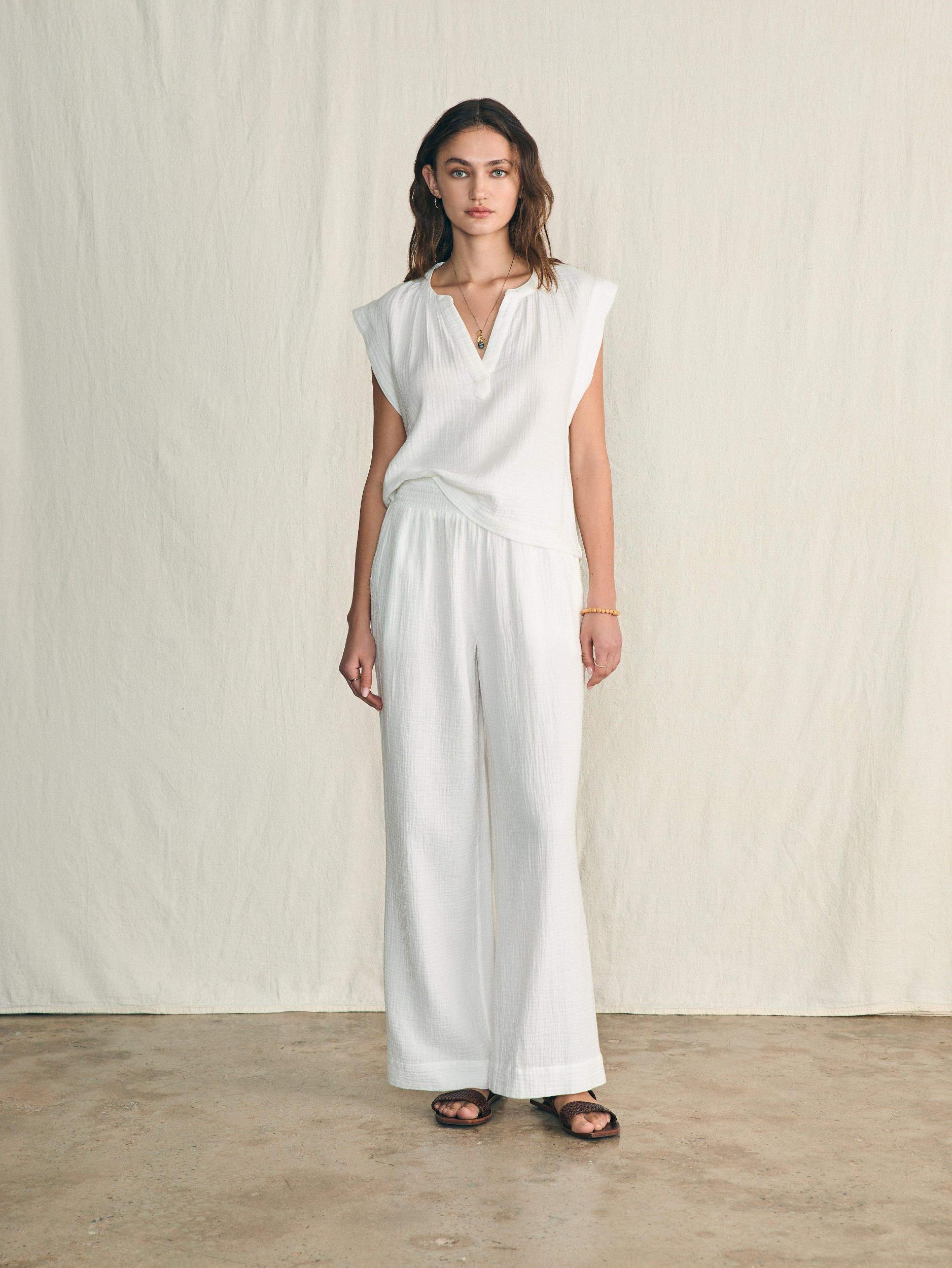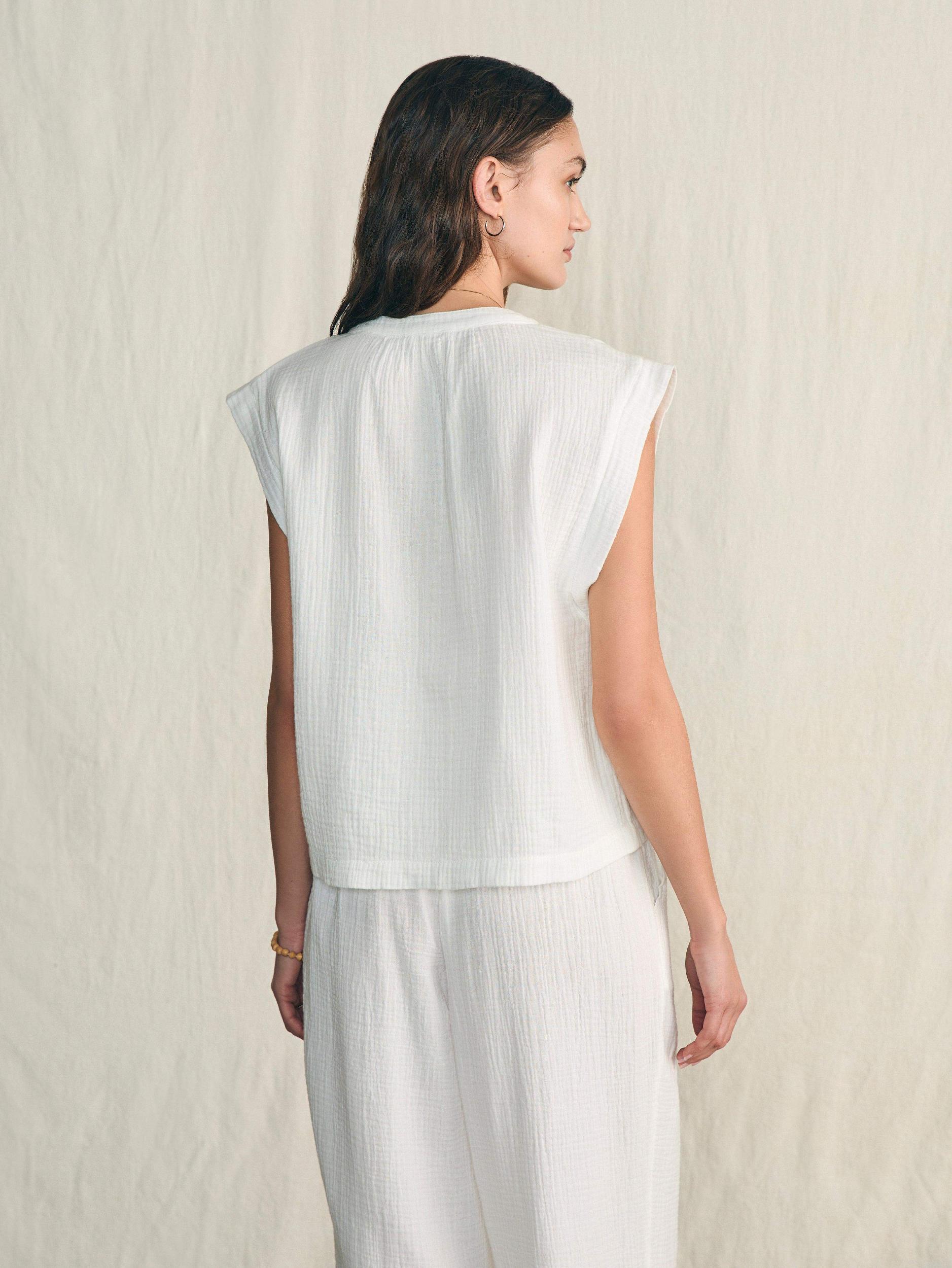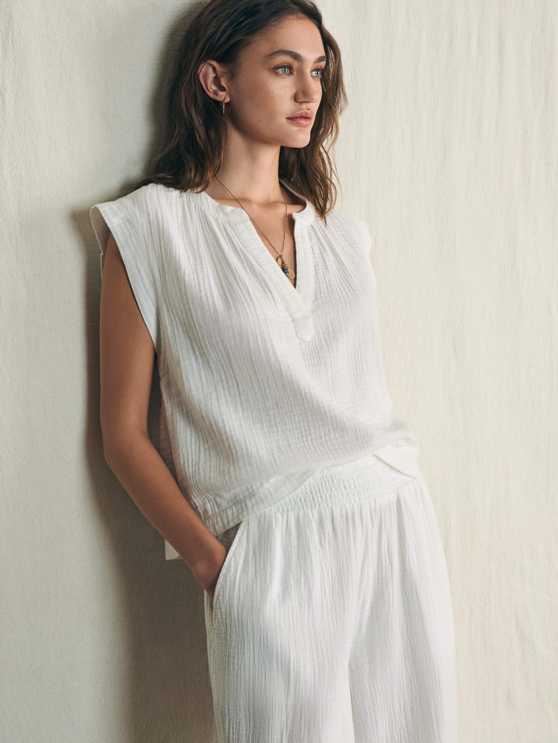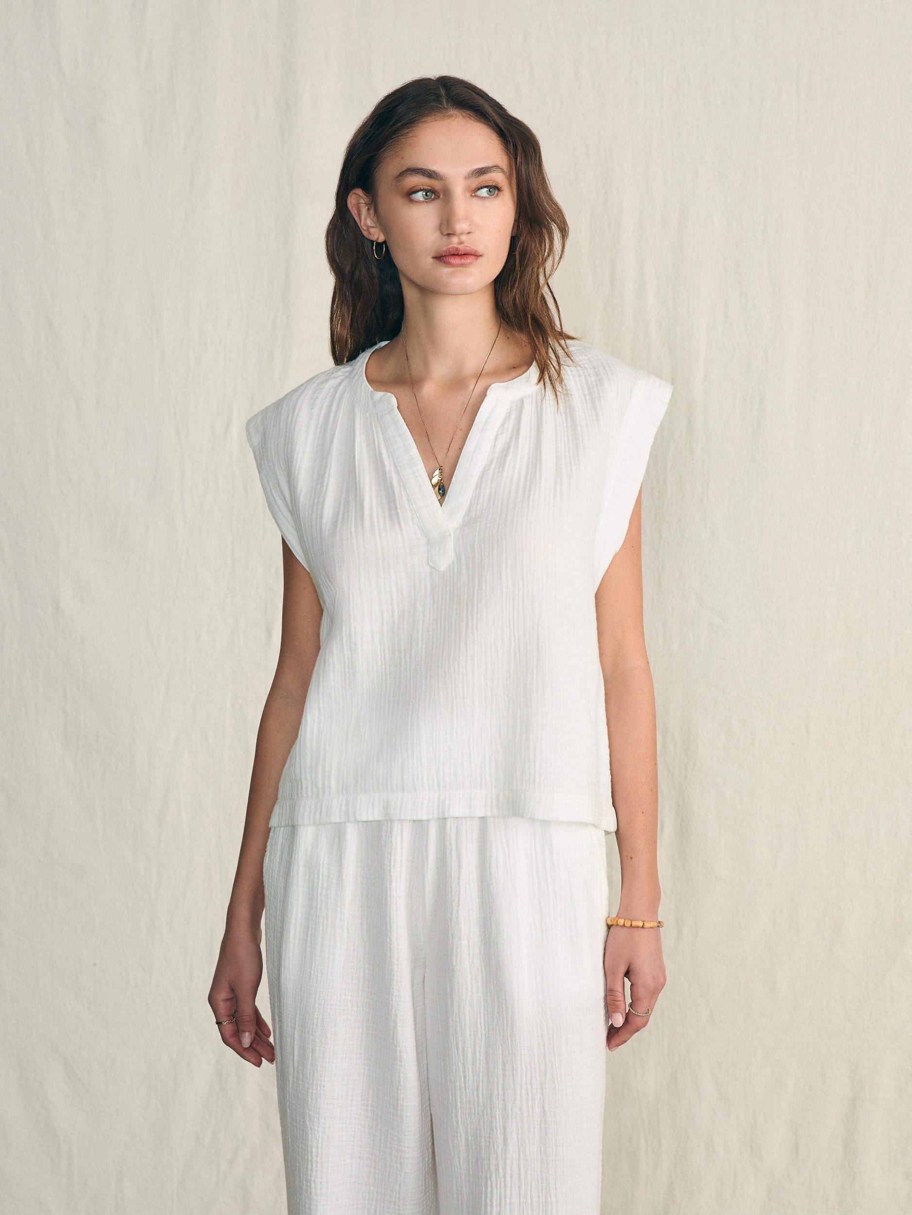 The simple charm of our vintage-inspired embroidered top radiates relaxed ease and subtle romance. Crafted from a soft and airy 100% organic double gauze cotton, it feels like a fresh start – just in time for longer and sunnier days. Fit: Relaxed fit Detail: Half placket popover top. Striped grosgrain detail at back neck. Material: 100% Organic Cotton Model: Alissa is 5’9 wearing size Small Care: Turn inside out. Machine wash cold separately. Delicate cycle. Do not bleach. Tumble dry low. Remove promptly. Cool iron when needed. WTU2401-WHT