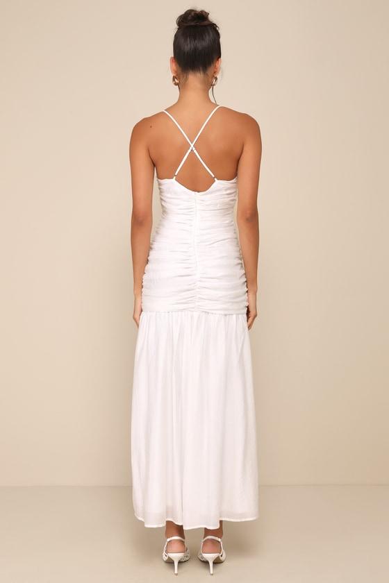 Step into the room like a vision in the Lulus Dream Elegance White Ruched Rosette Drop Waist Maxi Dress! Lightweight, textured woven fabric shapes this ultra-romantic dress that has slender, adjustable spaghetti straps that crisscross the open back. Bodice boasts a sweetheart neckline and a fitted design, with a rosette detail at the center. Flattering silhouette has decadent ruching at the sides, with a drop waist and a flaring skirt that ends at a maxi hem. Hidden zipper/clasp at back.