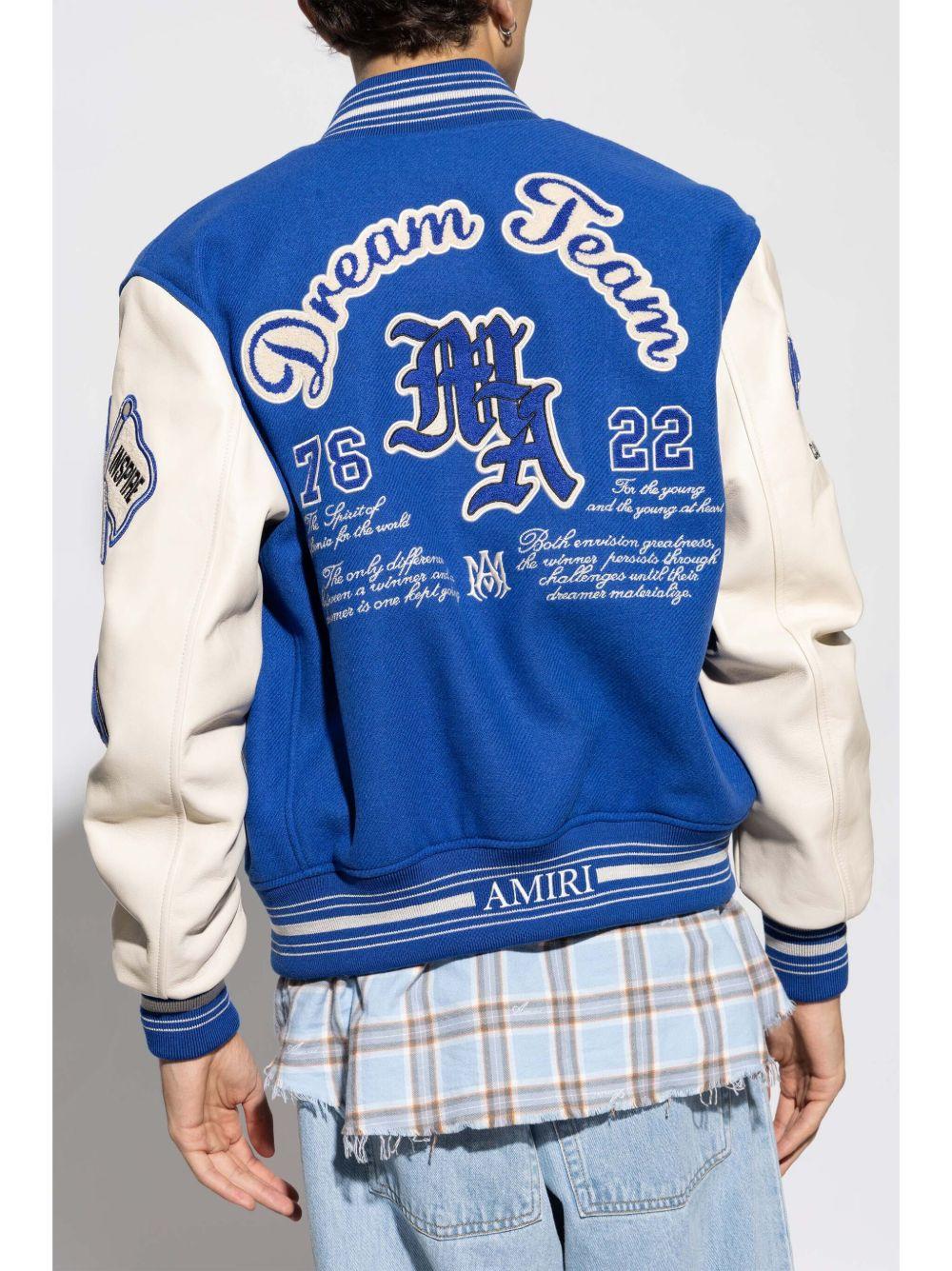 AMIRI Dream Team Varsity jacket | Blue | royal blue/white | wool blend | front press-stud fastening | appliqué logo | striped edge | ribbed band collar | long sleeves | two side zip-fastening pockets | ribbed cuffs and hem | Wool/Nylon | Bomber Jackets | Jackets | Clothing | Men