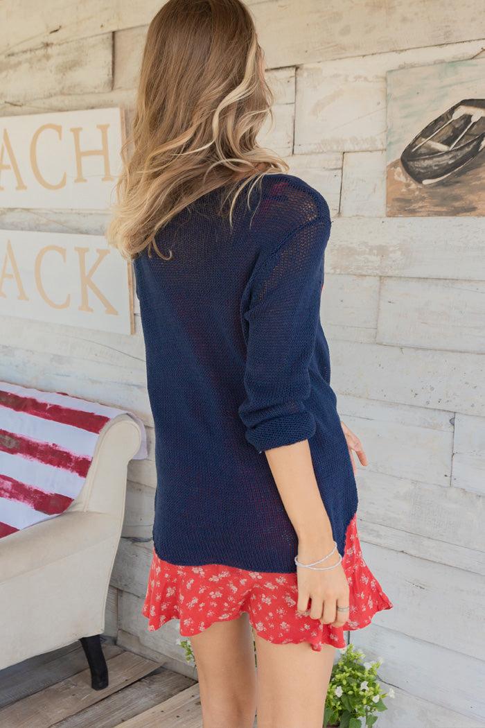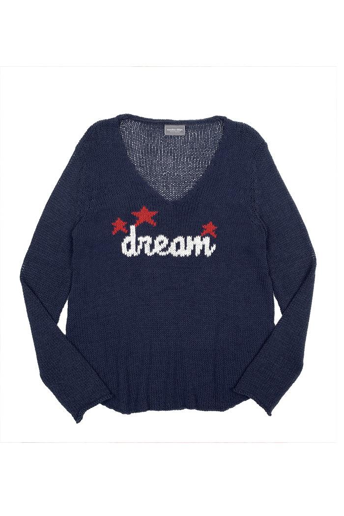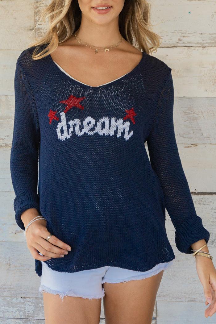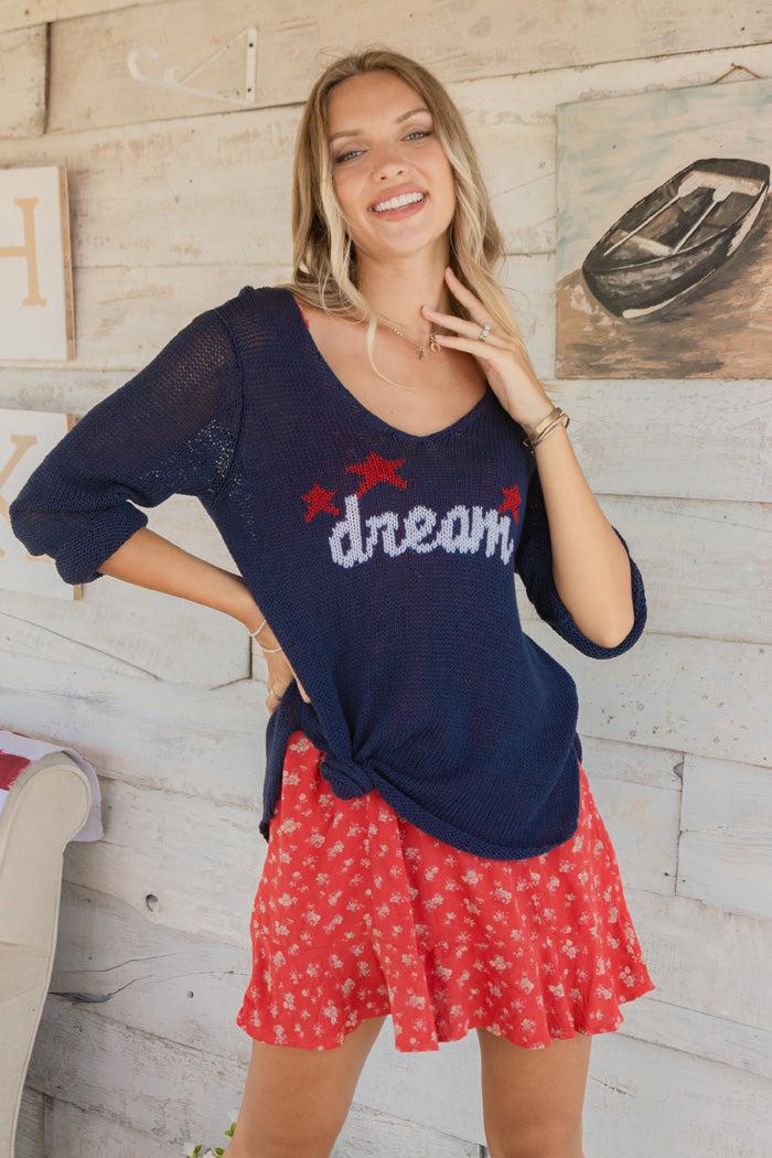 Knit using our soft, ropey and breathable cotton blend yarn, this patriotic v-neck has a flattering, relaxed fit. The word dream is knit directly into the center front and is accompanied by knit-in stars. Details include a rounded hem with side slits, creating a soft drape.